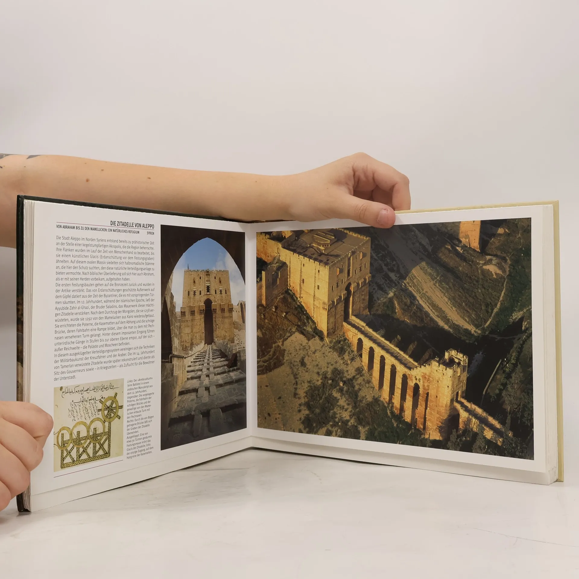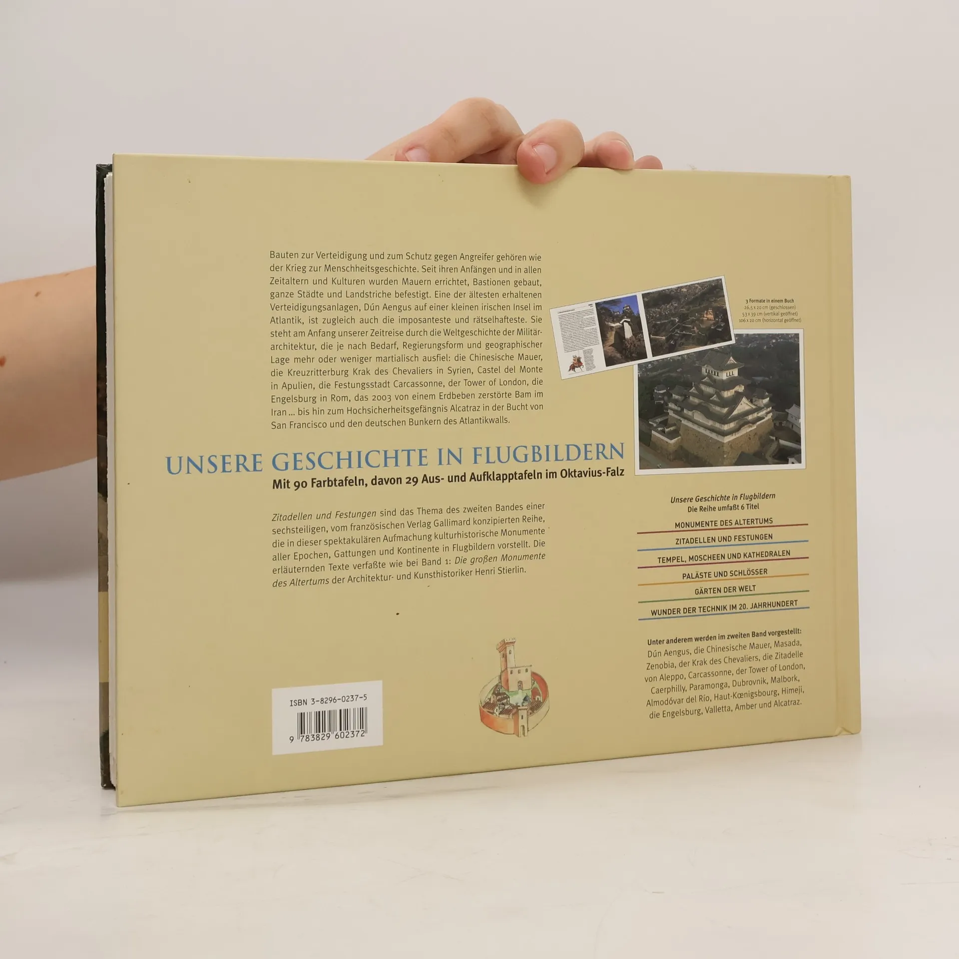 Nach den Monumenten des Altertums, die von unseren Lesern mit großer Begeisterung aufgenommen wurden, stellt Henri Stierlin im 2. Band der Gallimard-Reihe „Unsere Geschichte in Flugbildern“ Zitadellen und Festungen vor. Bauten zur Verteidigung und zum Schutz gegen Angreifer gehören wie der Krieg zur Menschheitsgeschichte. Seit ihren Anfängen und in allen Zeitaltern und Kulturen wurden Bastionen gebaut, Mauern errichtet, ganze Städte und Landstriche befestigt. Eine der ältesten erhaltenen Verteidigungsanlagen, Dún Aengus auf einer kleinen irischen Insel im Atlantik, ist zugleich auch die imposanteste und rätselhafteste. Sie steht am Anfang unserer Zeitreise durch die Weltgeschichte der Militärbaukunst, die je nach Bedarf, Regierungsform und geographischer Lage mehr oder weniger martialisch ausfiel: die Chinesische Mauer, die Kreuzritterburg Krak des Chevaliers in Syrien, Castel del Monte in Apulien, die Festungsstadt Carcassonne, der Tower of London, die Engelsburg in Rom, das 2003 von einem Erdbeben zerstörte Bam im Iran. bis hin zum Hochsicherheitsgefängnis Alcatraz in der Bucht von San Francisco und den deutschen Bunkern des Atlantikwalls. In der Reihe Unsere Geschichte in Flugbildern erschien bereits Band 1: Die großen Monumente des Altertums. Die Reihe wird fortgesetzt mit Band 3: Tempel, Moscheen und Kathedralen Band 4: Paläste und Schlösser Band 5: Gärten der Welt Band 6: Wunder der Technik im 20. Jahrhundert