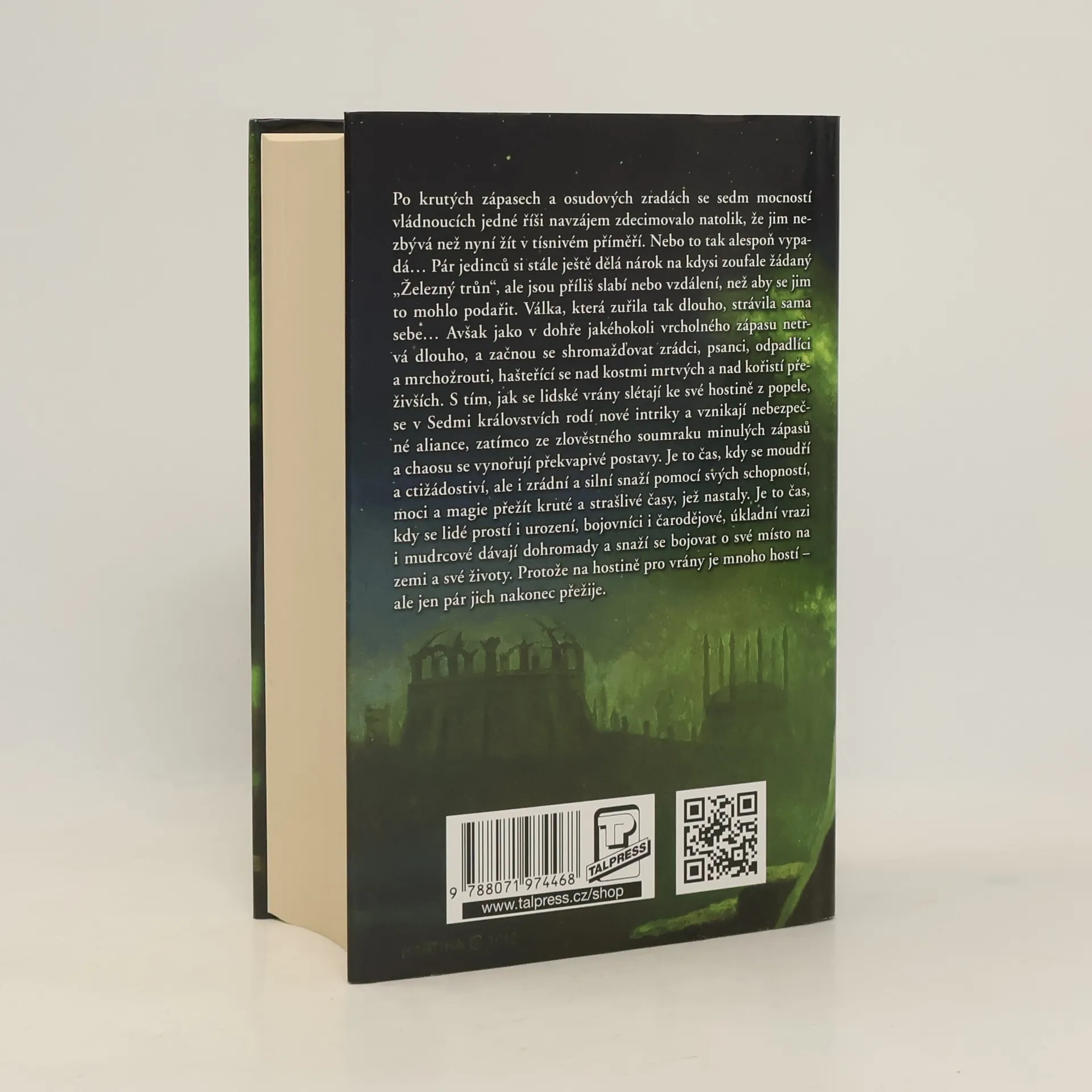 Po staletích krutých zápasů a osudových zrad se sedm mocností vládnoucích jedné říši navzájem zdecimovalo natolik, že jim nezbývá než nyní žít v tísnivém příměří. Nebo to tak alespoň vypadá… Pár jedinců si stále ještě dělá nárok na kdysi zoufale žádaný „Železný trůn“, ale jsou příliš slabí nebo vzdálení, než aby se jim to mohlo podařit. Válka, která zuřila tak dlouho, strávila sama sebe… Avšak jako v dohře jakéhokoli vrcholného zápasu netrvá dlouho, a začnou shromažďovat zrádci, psanci, odpadlíci a mrchožrouti, hašteřící se nad kostmi mrtvých a nad kořistí přeživších. S tím, jak se lidské vrány slétají ke své hostině z popele, se v Sedmi královstvích rodí nové intriky a vznikají nebezpečné aliance, zatímco ze zlověstného soumraku minulých zápasů a chaosu se vynořují překvapivé postavy. Je to čas, kdy se moudří a ctižádostiví, ale i zrádní a silní snaží pomocí svých schopností, moci a magie přežít kruté a strašlivé časy, jež nastaly. Je to čas, kdy se lidé prostí i urození, bojovníci i čarodějové, úkladní vrazi i mudrcové dávají dohromady a snaží se bojovat o své místo na zemi a své životy. Protože na hostině pro vrány je mnoho hostí – ale jen pár jich nakonec přežije.