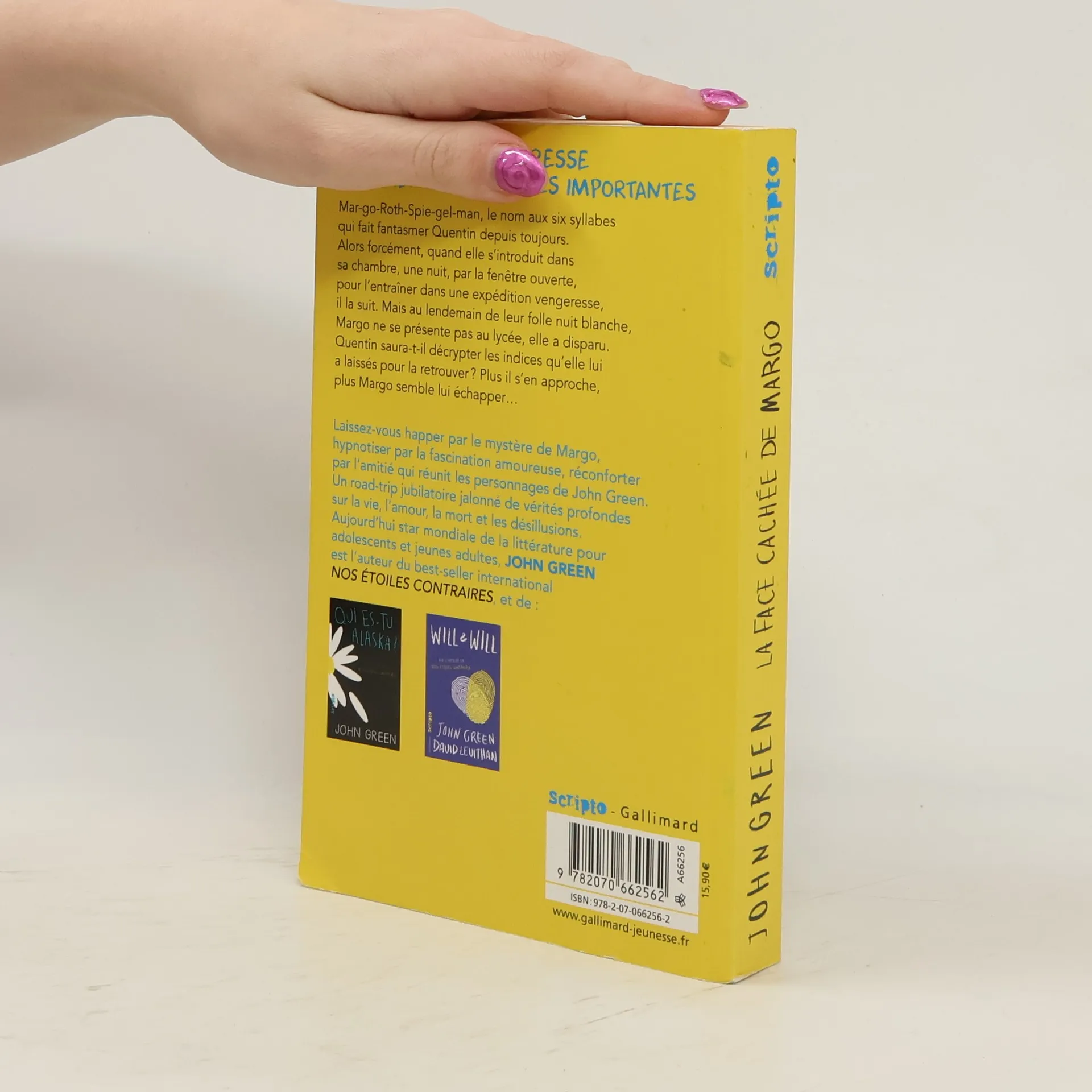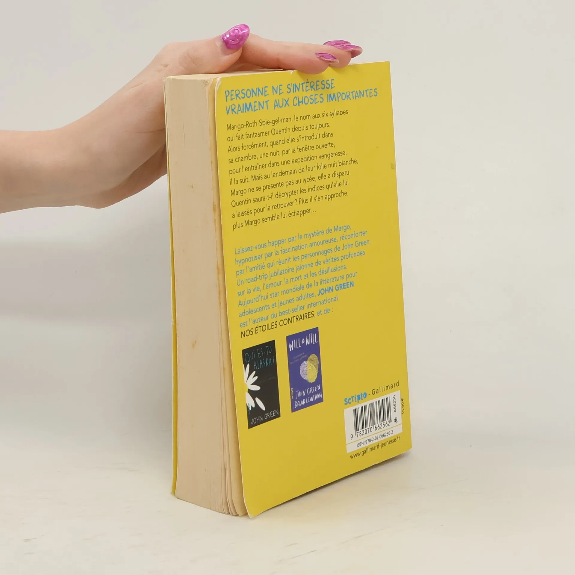 Mar-go-Roth-Spie-gel-man, le nom aux six syllabes qui fait fantasmer Quentin depuis toujours. Alors forcément, quand elle s'introduit dans sa chambre, une nuit, par la fenêtre ouverte, pour l'entraîner dans une expédition vengeresse, il la suit. Mais au lendemain de leur folle nuit blanche, Margo ne se présente pas au lycée, elle a disparu. Quentin saura-t-il décrypter les indices qu'elle lui a laissés pour la retrouver? Plus il s'en approche, plus Margo semble lui échapper... Laissez-vous happer par le mystère de Margo, hypnotiser par la fascination amoureuse, réconforter par l'amitié qui réunit les personnages de John Green. Un road-trip jubilatoire jalonné de vérités profondes sur la vie, l'amour, la mort et les désillusions. Aujourd'hui star mondiale de la littérature pour adolescents et jeunes adultes, John Green est l'auteur du best-seller international Nos Etoiles Contraires et de Qui es tu Alaska? et de Will & Will.