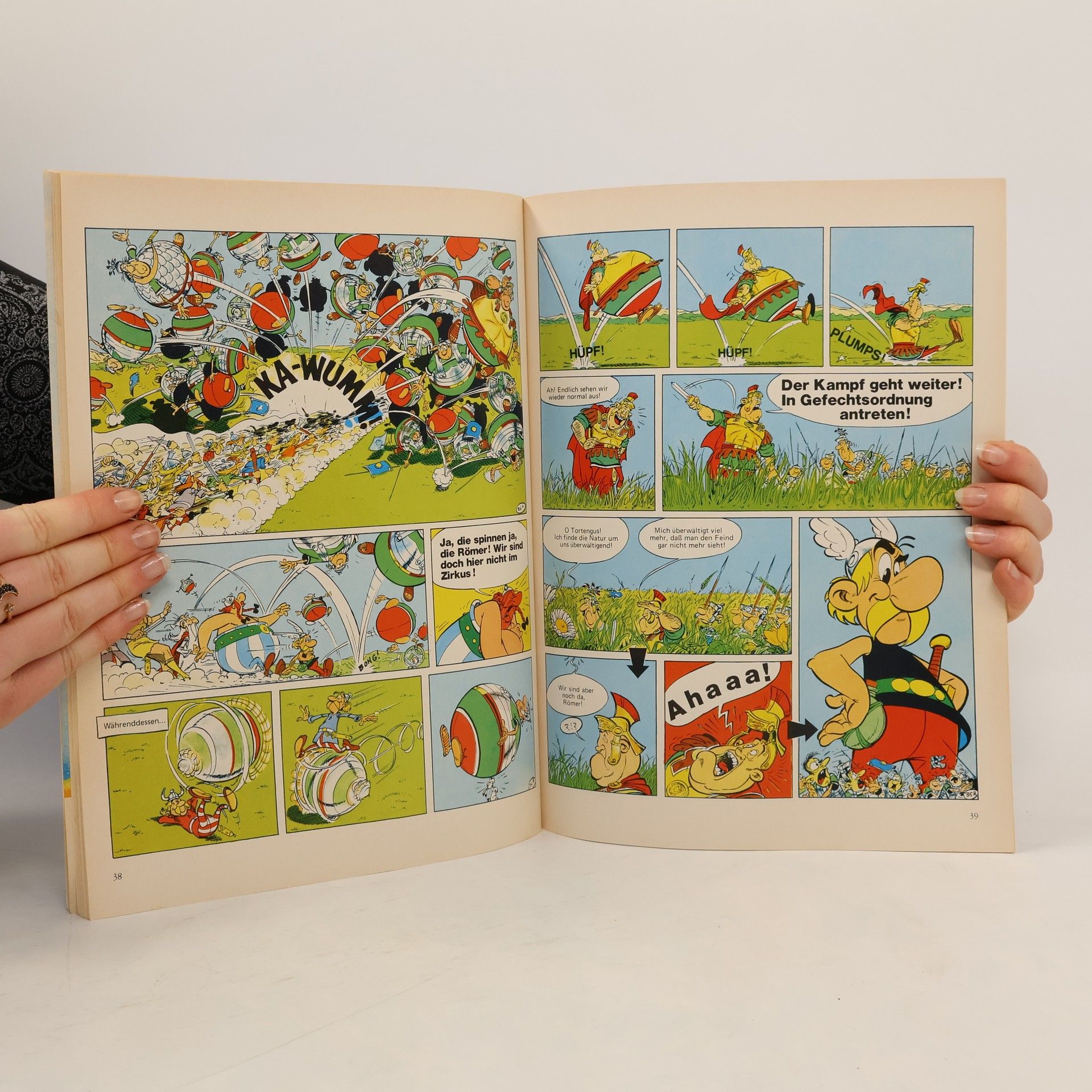 Auch dieses Asterix-Abenteuer, nach dem Tod Goscinnys das 1. von Uderzo allein gefertigte und 1980 erstmals erschienen (BA 1/81, 557), liegt jetzt in der "exklusiven" Werkedition (s. zuletzt BA 8/91) vor. Die Geschichte, wie Asterix und Obelix ein geteiltes gallisches Dorf (und damit auch ein Liebespaar à la Romeo und Julia) zusammenführen, dürfte jedem Fan der Serie geläufig sein. Anders ist wieder die äussere Gestaltung des Albums, die (wenn auch nur leichte) textliche Überarbeitung und das vorangestellte Asterix-Lexikon mit Hintergrundinformationen und speziellen Erklärungen zu dieser Episode. Wie die (mittlerweile 7) Vorgänger neben der Normalausgabe insbesondere auch in Erwachsenenabteilungen einsetzbar