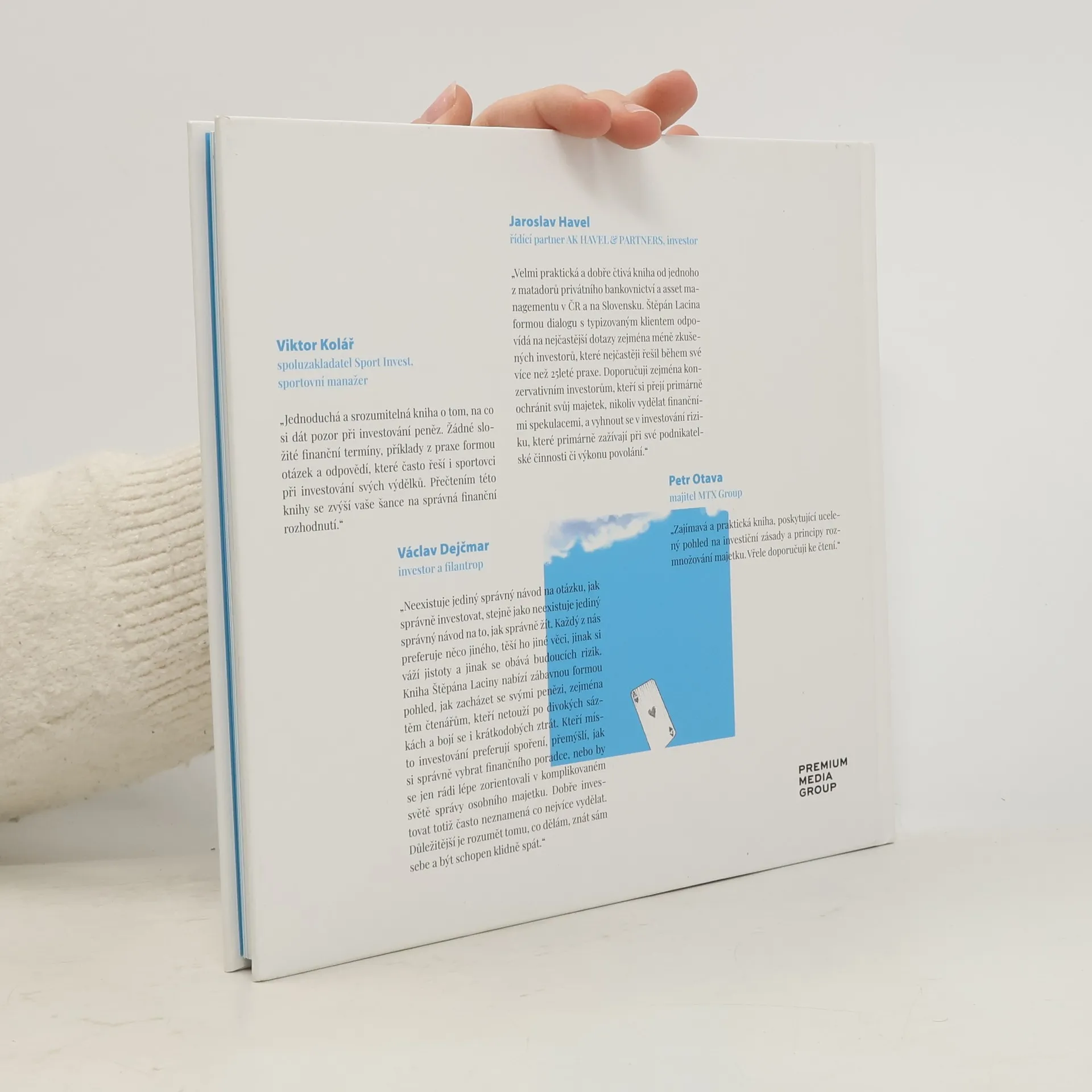 Kniha Peníze až na prvním místě aneb Pár investičních otázek na tělo vznikla z pera Štěpána Laciny, zakládajícího partnera společnosti Accredio, který při její tvorbě uplatnil své dlouholeté zkušenosti v oboru. Vysoce praktická, srozumitelná a čtivá příručka o tom, na co si dát pozor při investování. Lacina v knize odpovídá na 65 otázek, které pomohou začínajícím investorům či jejich poradcům učinit v oblasti investic kvalifikovaná a správná rozhodnutí.