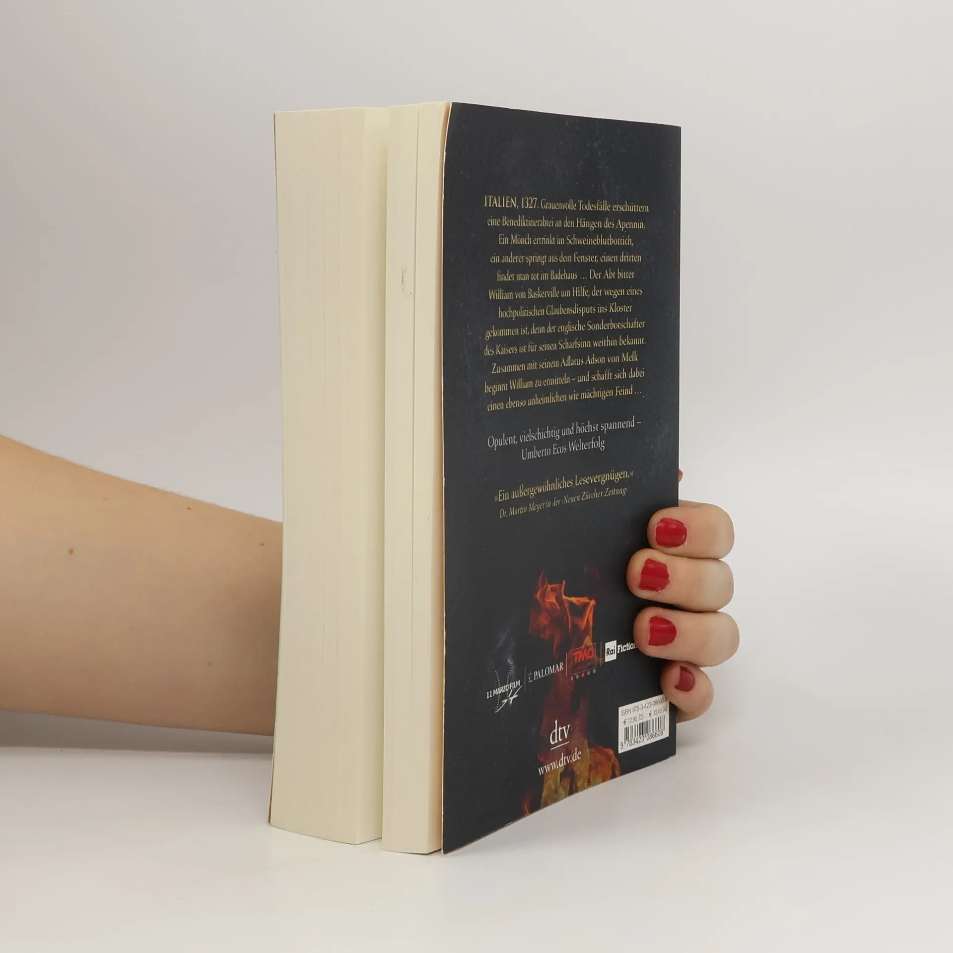 Italien, 1327. In einem abgeschiedenen Benediktinerkloster kommt es innerhalb kürzester Zeit zu unheimlichen Todesfällen: Ein Mönch ertrinkt im Schweineblutbbottich, ein anderer springt aus dem Fenster und ein dritter liegt tot im Badehaus. Der Abt bittet den für seinen Scharfsinn weithin bekannten William von Baskerville um Hilfe. Bei seinen Nachforschungen schafft sich der ehemalige Inquisitor einen ebenso gnadenlosen wie mächtigen Feind. Die Spuren führen William und seinen jungen Adlatus in die labyrinthische Klosterbibliothek, über die der blinde Jorge von Burgos wacht …