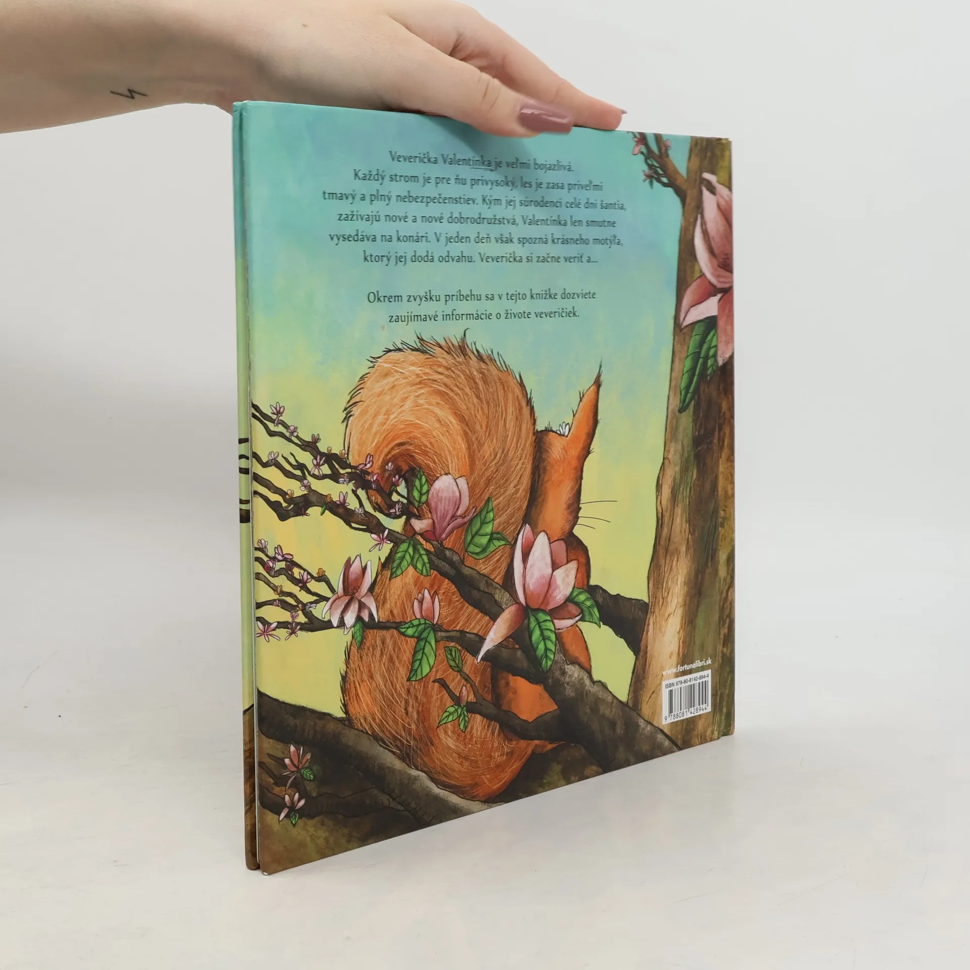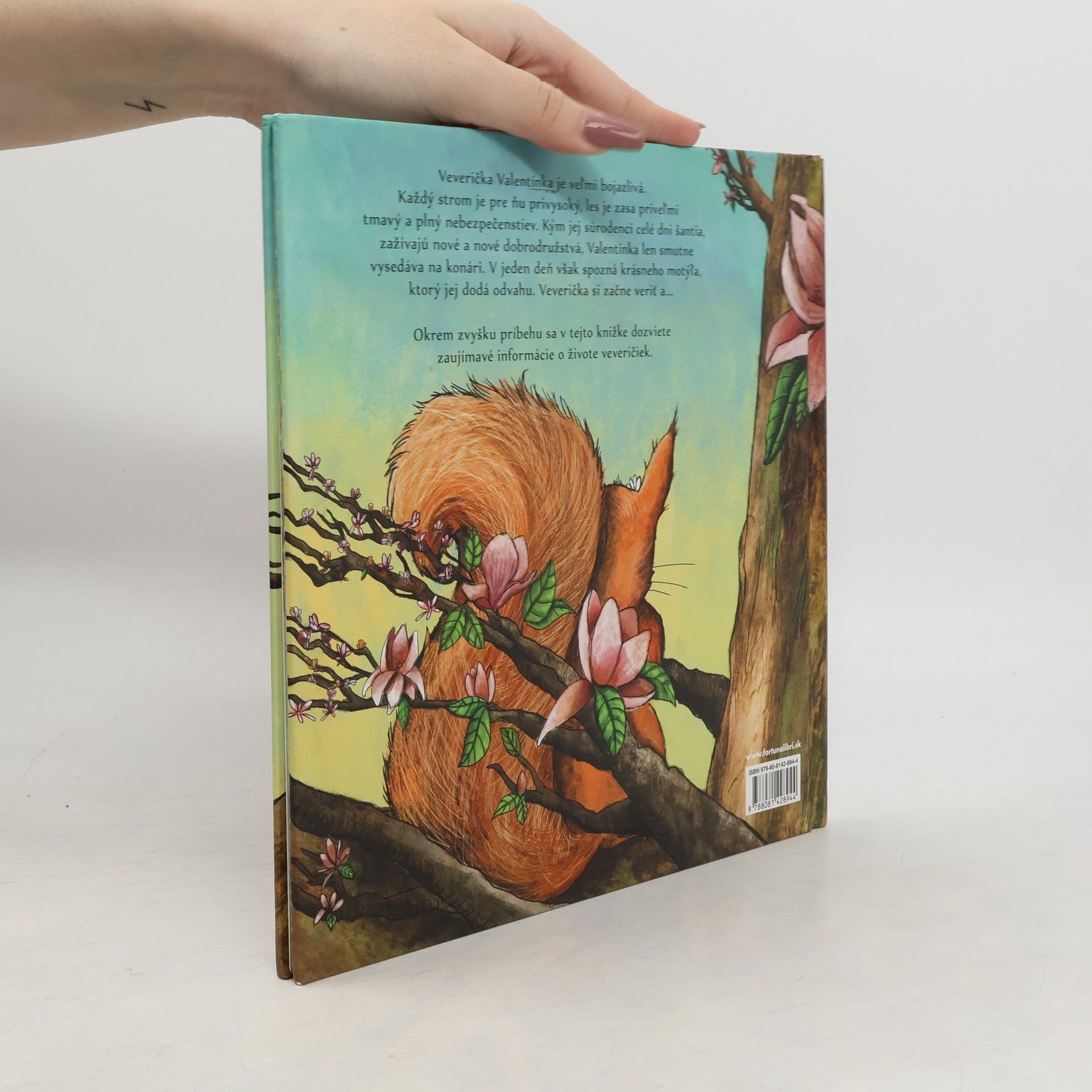 Veverička Valentínka je veľmi bojazlivá. Každý strom je pre ňu privysoký, les je zasa priveľmi tmavý a plný nebezpečenstiev. Kým jej súrodenci celé dni šantia, zažívajú nové a nové dobrodružstvá, Valentínka len smutne vysedáva na konári. V jeden deň však spozná krásneho motýľa, ktorý jej dodá odvahu. Veverička si začne veriť a... Okrem zvyšku príbehu sa v tejto knižke dozviete zaujímavé informácie o živote veveričiek.