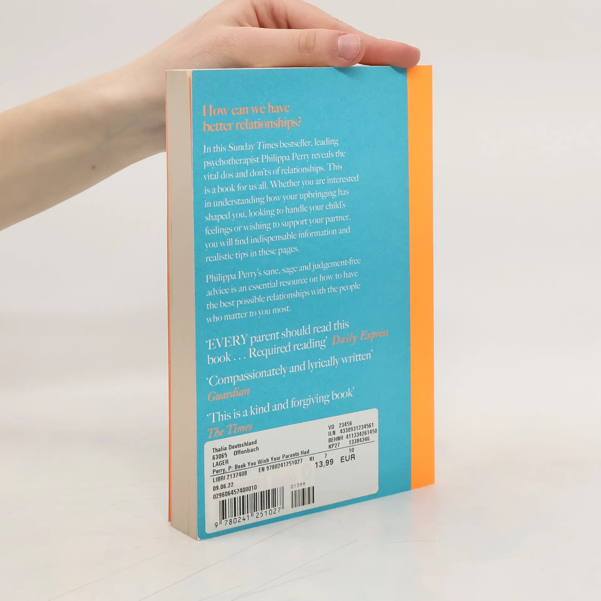 How can we have better relationships? In this Sunday Times bestseller, leading psychotherapist Philippa Perry reveals the vital do's and don'ts of relationships. This is a book for us all. Whether you are interested in understanding how your upbringing has shaped you, looking to handle your child's feelings or wishing to support your partner, you will find indispensable information and realistic tips in these pages. Philippa Perry's sane, sage and judgement-free advice is an essential resource on how to have the best possible relationships with the people who matter to you most.