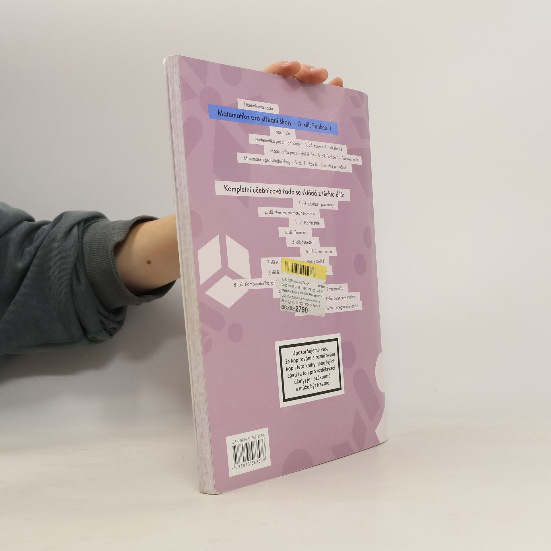 Pracovní sešit plynule navazuje na názorně a přehledně pojatý výklad v učebnici. Součástí pracovního sešitu jsou různorodé úlohy na procvičování, přičemž nejsou opomenuty úlohy na porozumění a úlohy maturitního typu, které mohou výrazně napomoci při přípravě na maturitní zkoušku. Učebnicová sada Matematika pro střední školy – 5. díl: Funkce II je členěna do následujících tematických celků: - Exponenciální funkce, rovnice a nerovnice - Logaritmické funkce, rovnice a nerovnice - Goniometrické funkce, rovnice a nerovnice - Trigonometrie obecného trojúhelníku