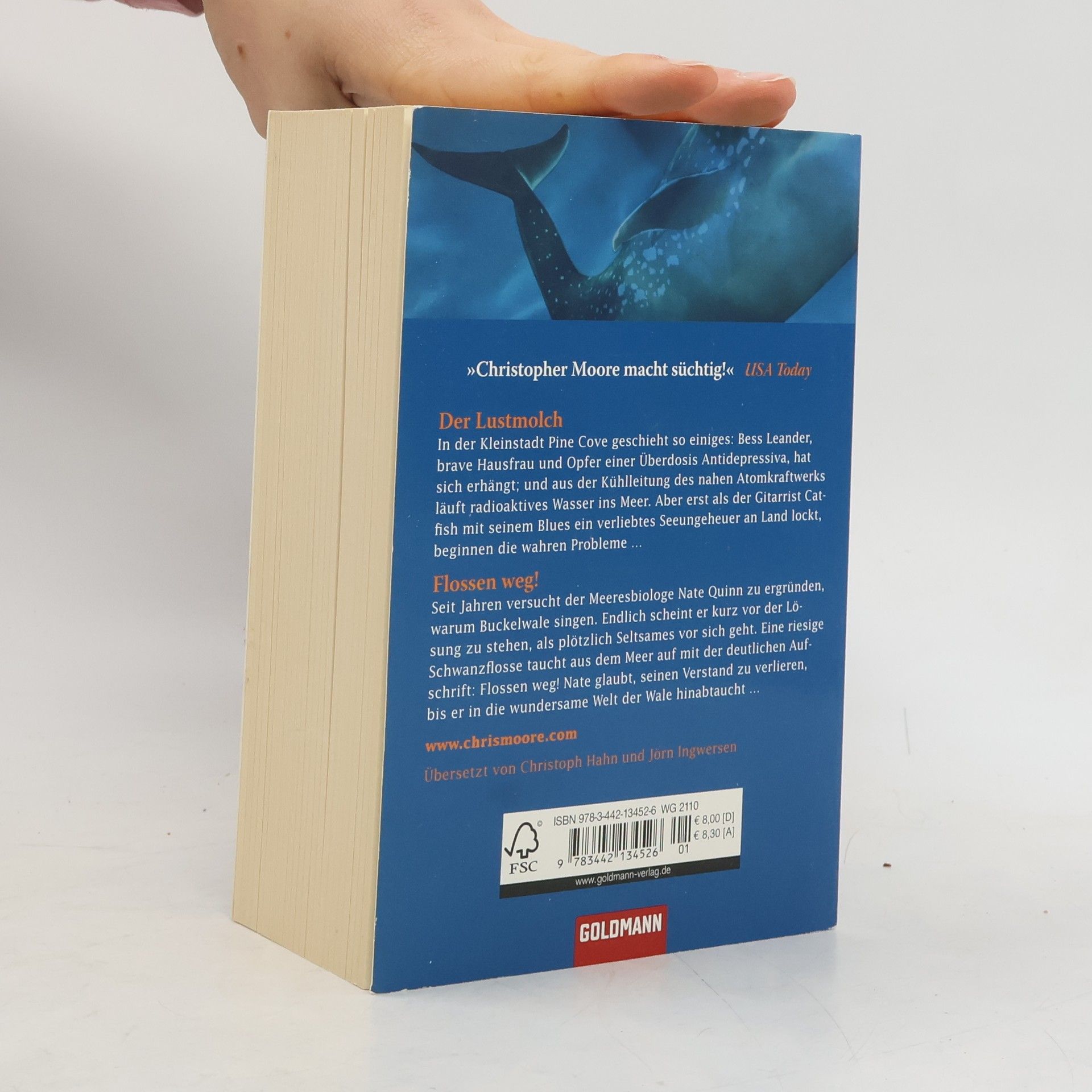 Christopher Moore im Doppelpack „Der Lustmolch“: Drei Dinge ereignen sich in jenem schicksalsträchtigen September in Pine Cove, bevor das Unheil über die kalifornische Kleinstadt an der Pazifikküste hereinbricht: Im nahen Atomkraftwerk entsteht ein winziges Leck in der Kühlleitung; Mavis Sand sucht einen Blues-Sänger für ihre Bar; und Bess Leander, Mutter zweier Töchter, erhängt sich. Die Ereignisse überschlagen sich … „Flossen Weg!“: Seit Jahren versucht der Meeresbiologe Nate Quinn zu ergründen, warum Buckelwale singen. Da geschieht plötzlich etwas Seltsames: Eine riesige Schwanzflosse taucht aus dem Meer auf mit der deutlichen Aufschrift: Fang mich! Und derselbe Wal versucht mehrmals über das Telefon bei Nate ein Pastrami-Sandwich zu bestellen. Nate glaubt seinen Verstand zu verlieren, bis er der Bitte nachkommt und in die wundersame Welt der Wale hinabtaucht …