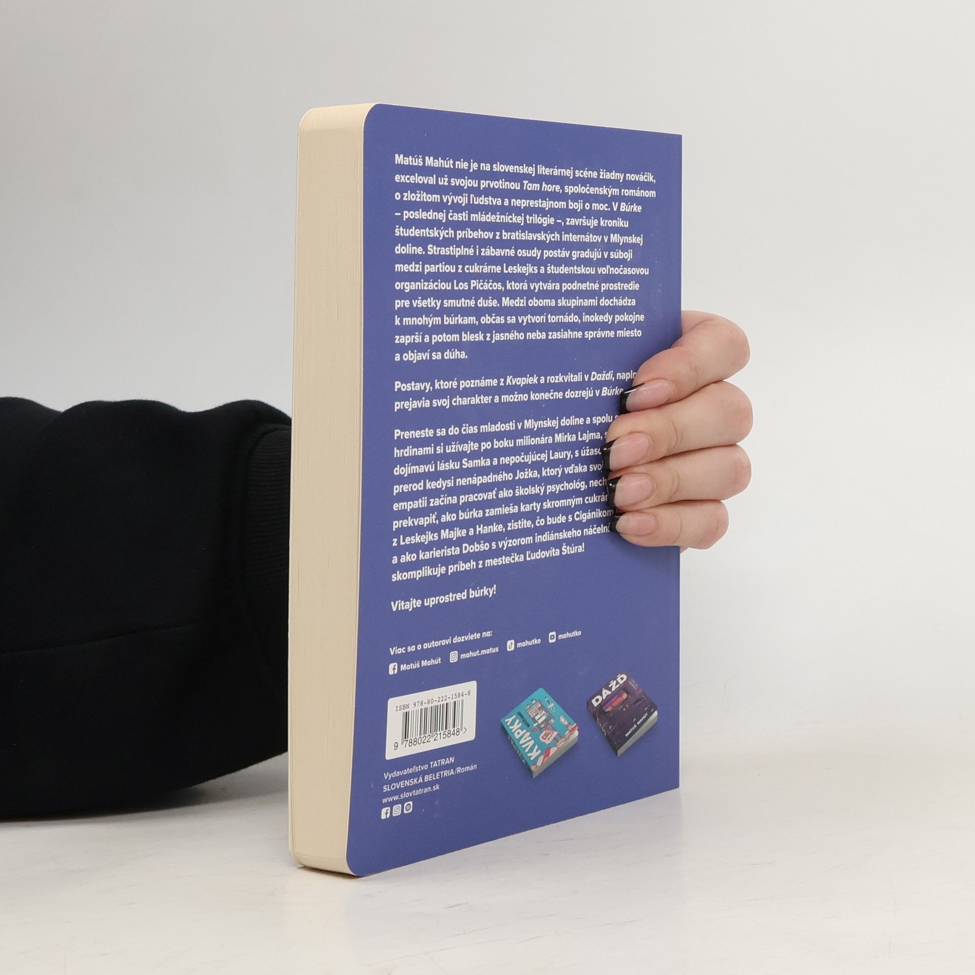 Búrka je posledná časť trilógie Kvapky, ktorá predstavuje kroniku študentských príbehov z Mlynskej doliny. Laura počúva svoje srdce, Mirko sa stane študentským milionárom a okrem peňazí hromadí lásku, Benjí tvorí rodinu z detského domova. Búrka graduje v súboji medzi partiou z cukrárne aštudentskou voľnočasovou organizáciou, ktorú vedie ambiciózny Miloš, pričom čerpá skúsenosti z prečítaných Kvapiek a Dažďa. Študentský život je o tých správnych spomienkach a postavy v Búrke sa snažia celým bytím vytvoriť ich sebe a zároveň vám. Veď kto by sa nechcel vrátiť do sladkých časov Mladosti?