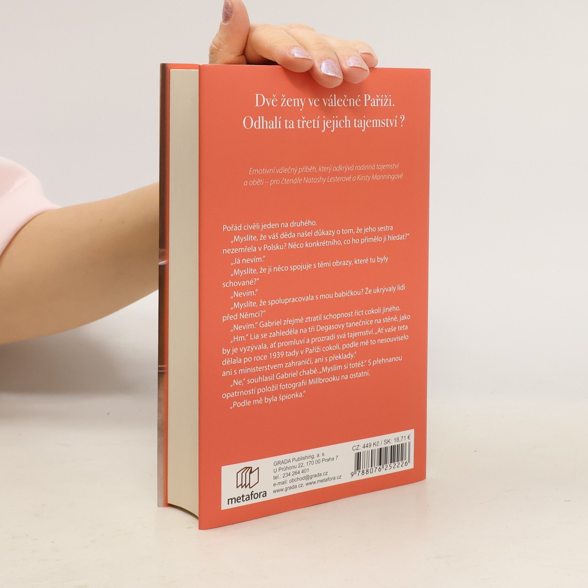 Londýn, 2017: Když Aurelia Leclairová zdědí přepychový byt v Paříži, o němž neměla ani tušení, ohromeně zjišťuje, kolik tajemství její babička skrývala: mezi jiným i sbírku vzácných obrazů a luxusních večerních rób. Jedna zvláštní malba ji dovede až k restaurátorovi Gabrielu Seymourovi a oba společně se rozhodnou odhalit pravdu skrytou ve stěnách bytu.Paříž, 1942: Ačkoli „město světel“ se potýká s německou okupací, okouzlující Estelle Allardová si užívá v salonech nedotčených útrapami války. Když si však nacisté přijdou pro její přátele, spěchá jim na pomoc a nepřemýšlí o ceně, již bude muset zaplatit. Do událostí zasáhne i tajemná špionka s krycím jménem Celine. Obě ženy se srdnatě vrhají proti ničivé převaze, která hrozí rozdrtit je i jejich milované, aniž tuší, že důsledky jejích činů ovlivní i budoucí generace.Tři ženy rozdělené časem, tři osudy odehrávající se v nebezpečné i vzkvétající Paříži. Aurelia, Sophie i Estelle musí najít odvahu, čelit nástrahám měnícího se světa a napsat další kapitolu v historii své rodiny.