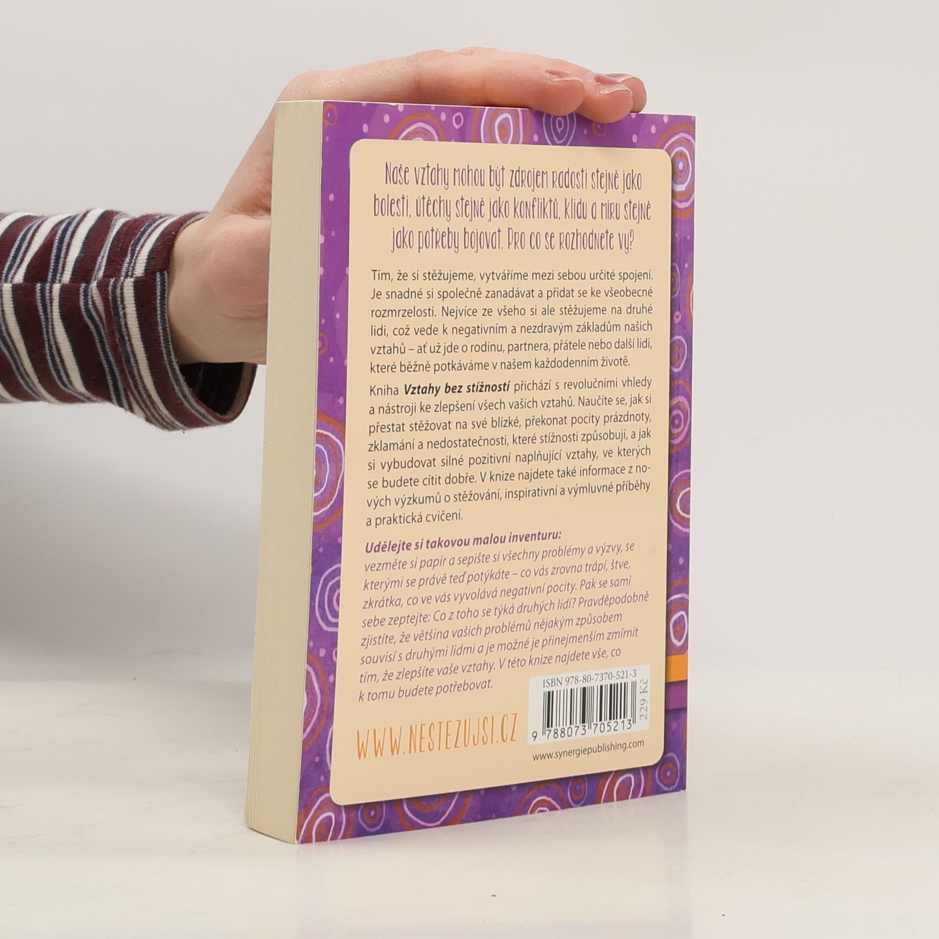 Tím, že si stěžujeme, vytváříme mezi sebou určité spojení. Je snadné si společně zanadávat a přidat se ke všeobecné rozmrzelosti. Nejvíce ze všeho si ale stěžujeme na druhé lidi, což vede k negativním a nezdravým základům našich vztahů – ať už jde o rodinu, partnera, přátele nebo další lidi, které běžné potkáváme v našem každodenním životě. Kniha Vztahy bez stížností přichází s revolučními vhledy a nástroji ke zlepšení všech vašich vztahů. Naučíte se, jak si přestat stěžovat na své blízké, překonat pocity prázdnoty, zklamání a nedostatečnosti, které stížnosti způsobují, a jak si vybudovat silné pozitivní naplňující vztahy, ve kterých se budete cítit dobře. V knize najdete také informace z nových výzkumů o stěžování, inspirativní a výmluvné příběhy a praktická cvičení. Více na http://nestezujsi.cz/ „Udělejte si takovou malou mentální inventuru: vezměte si papír a sepište si všechny problémy a výzvy, se kterými se právě teď potýkáte – co vás zrovna trápí, štve, zkrátka, co ve vás vyvolává negativní pocity. Pak se sami sebe zeptejte: Co z toho se týká druhých lidí? Pravděpodobně zjistíte, že většina vašich problémů nějakým způsobem souvisí s druhými lidmi a je možné je přinejmenším zmírnit tím, že zlepšíte vaše vztahy. V této knize najdete vše, co k tomu budete potřebovat.“
