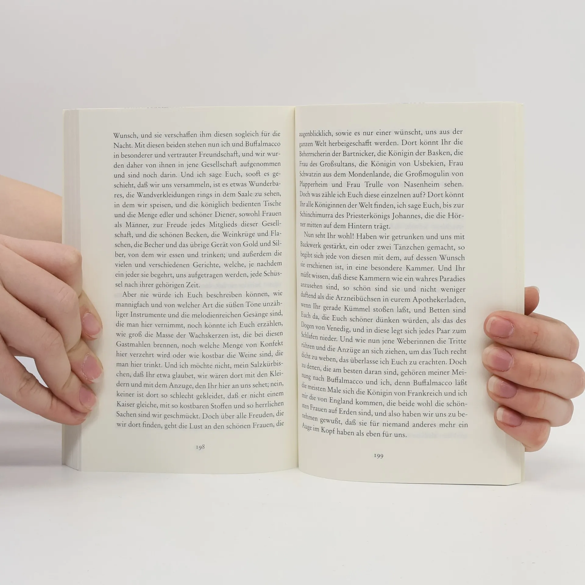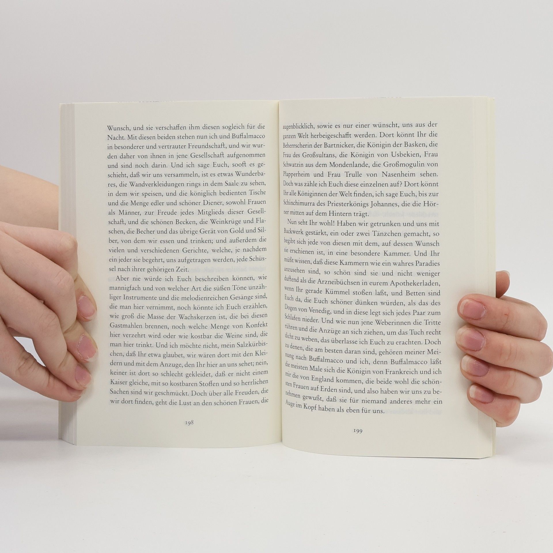 »In diesen Geschichten wird man lustige und betrübte Liebesereignisse und andere abenteuerliche Begebenheiten kennenlernen, die in neuen und alten Zeiten sich zugetragen haben und die den Leserinnen mit den spaßhaften Dingen, die darin vorkommen, gleich viel Vergnügen wie guten Rat gewähren und sie unterrichten werden, was sie meiden und was sie erstreben sollen. Mir dünkt, solchen Geschichten könne keine üble Laune standhalten.«