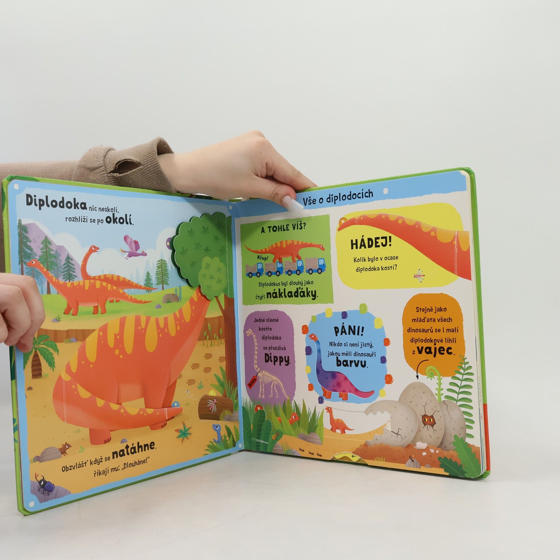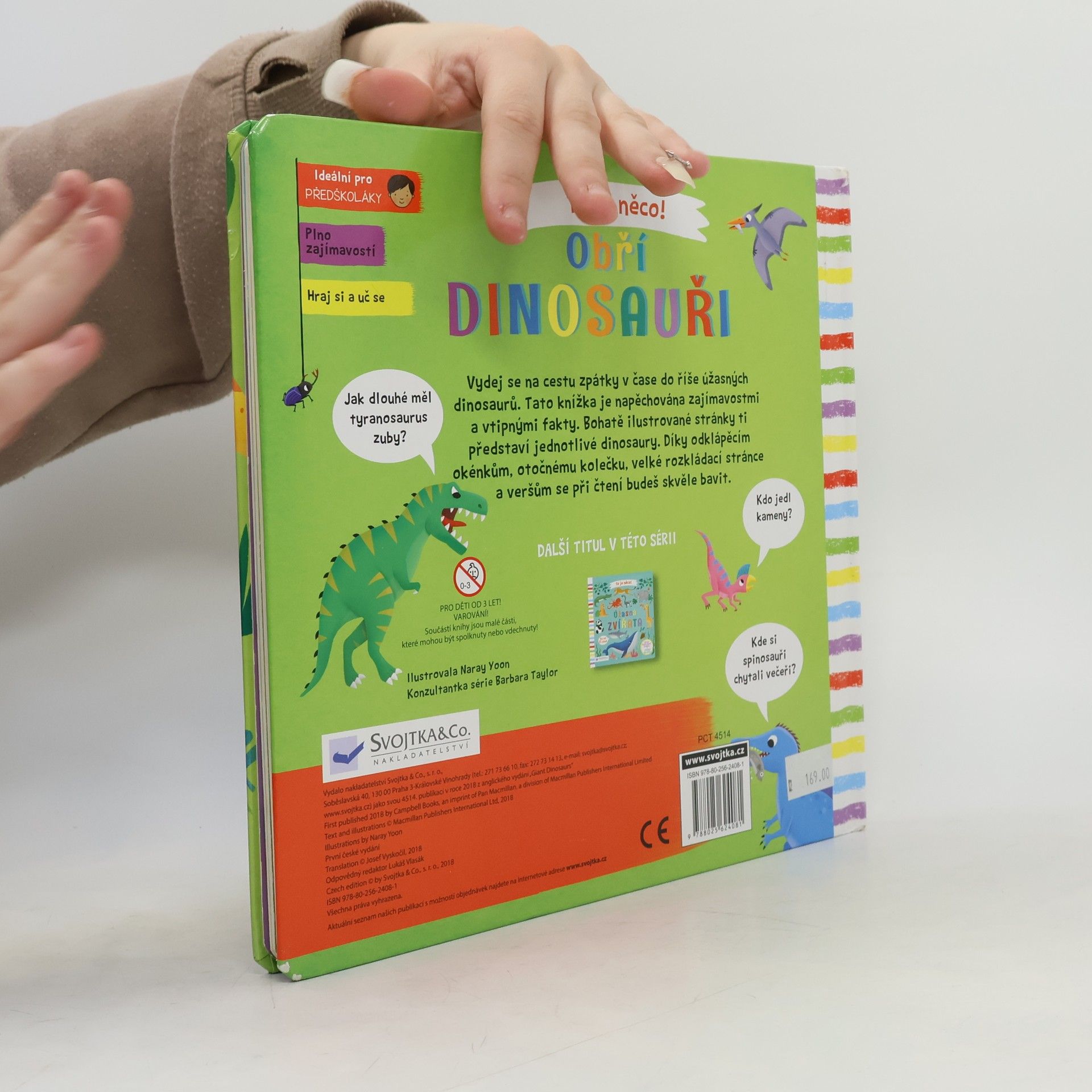 Knížka je napěchovaná zajímavostmi a vtipnými fakty. Bohatě ilustrované stránky představují jednotlivé dinosaury. Díky odklápěcím okénkům, otočnému kolečku, velké rozkládácí stránce a veršům se děti při čtení budou dobře bavit.