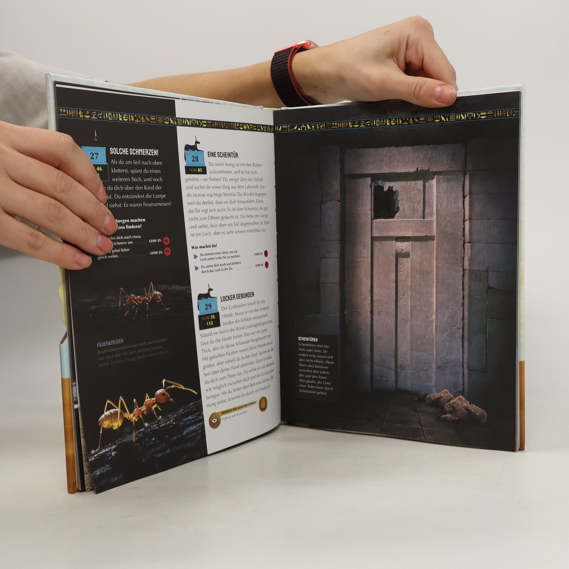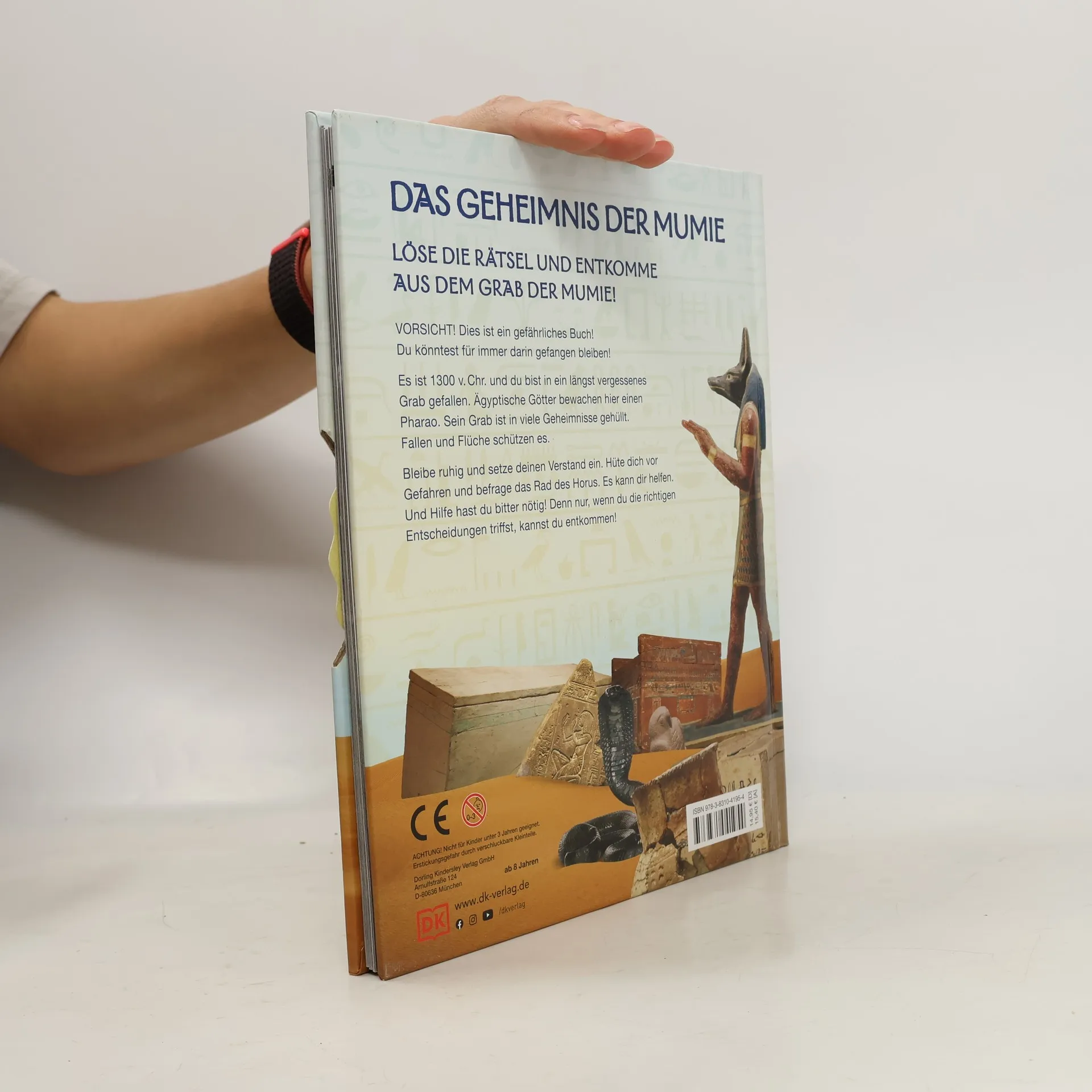 Spannendes Escape-Abenteuer rund um das alte Ägypten Vorsicht! Das könnte eine Falle sein! Nur wer clever genug ist, entkommt aus dem geheimnisvollen Mumiengrab! Diese aufregende Kombination aus interaktivem Rätsel- und Wissensbuch entführt Leser*innen auf ein Abenteuer ins Land der Pharaonen. Wer die richtigen Entscheidungen trifft, rückt der Freiheit und dem Sieg näher. Gut, dass das weise Auge des Horus, ein drehbares Rad mit Codes vorn im Buchdeckel, mit Rat und Tat zur Seite steht! Wer entkommt dem Grab des Pharaos? Bereit für das ultimative Escape-Room-Abenteuer in Buchform? Es lauern viele Gefahren im unterirdischen Grab, in das du aus Versehen gefallen bist! Wie willst du hier wieder rausfinden? Mit der Hilfe des Auge des Horus und einer geballten Ladung Wissen über das alte Ägypten kommst du deinem Ziel Schritt für Schritt näher. • Das alte Ägypten als aufregendes Escape-Abenteuer für zu Hause • Spannendes Sachwissen über das alte Ägypten • Fantastische Fotos von Mumien, Schätze und labyrinthische Gänge • Interaktiv mit drehbarem Auge des Horus Achtung, dieses Escape-Buch lässt einen so schnell nicht mehr los! Hier erleben Rätselbegeisterte und Escape-Room-Fans ein packendes Abenteuer im alten Ägypten.