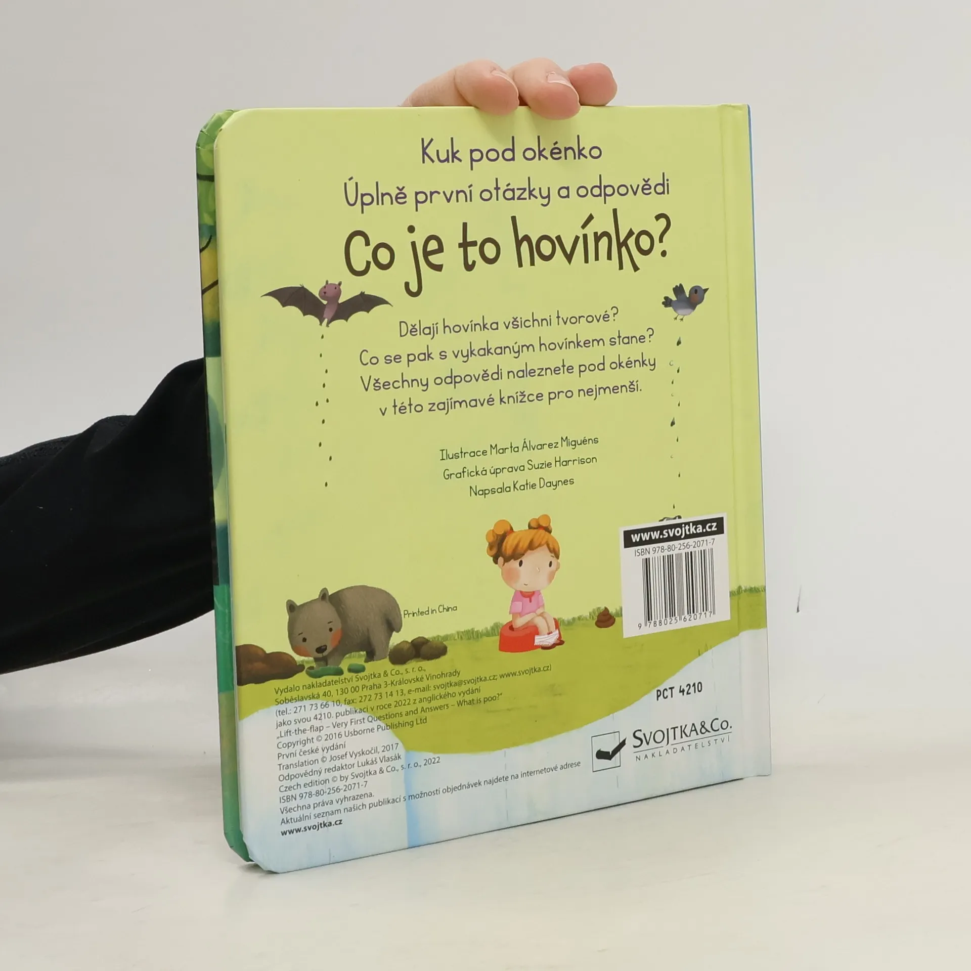 Kakají všichni. Ale co se pak s vykakaným hovínkem stane? Odpovědi naleznete pod okénky v této knížce pro nejmenší. Hovínko se dělá do plíny, splachuje se do záchoda, zvířátka dělají svá hovínka venku... Ale co to vlastně hovínko je? Víš, že jsou brouci, kteří si dělají z hovínek kuličky, a že králík svoje bobky dokonce jí? Na všechny všetečné otázky dětí na téma "Co je to hovínko?" najdou bezradní rodiče odpovědi v této úžasné knížce s odklápěcími okénky.