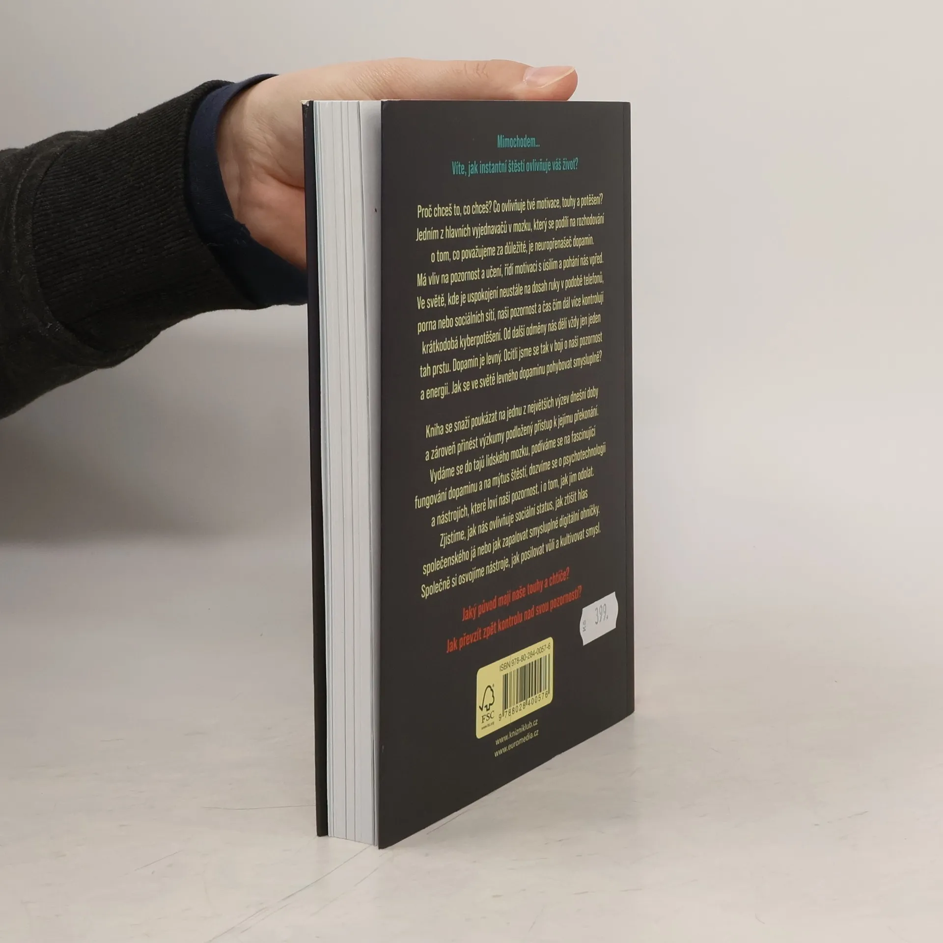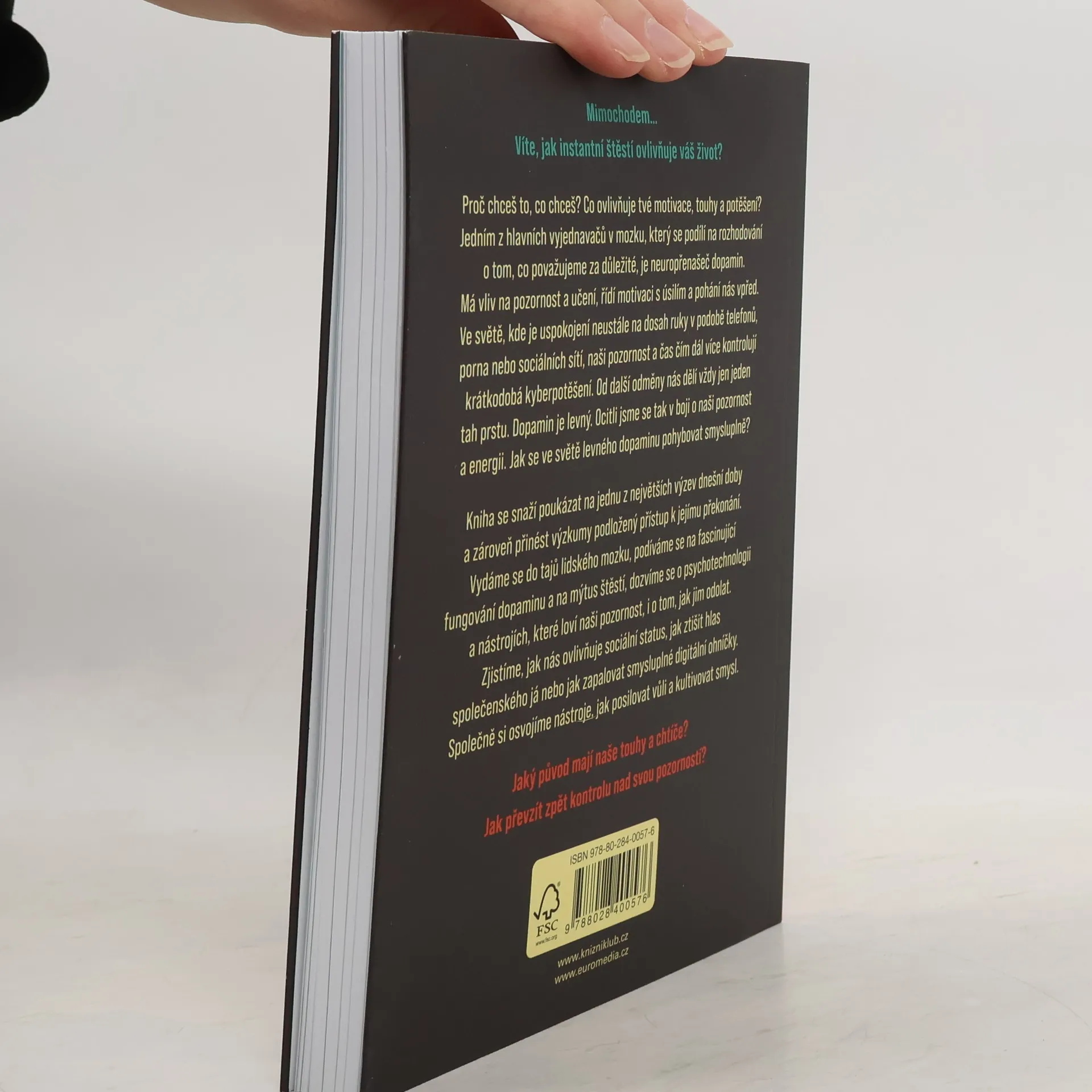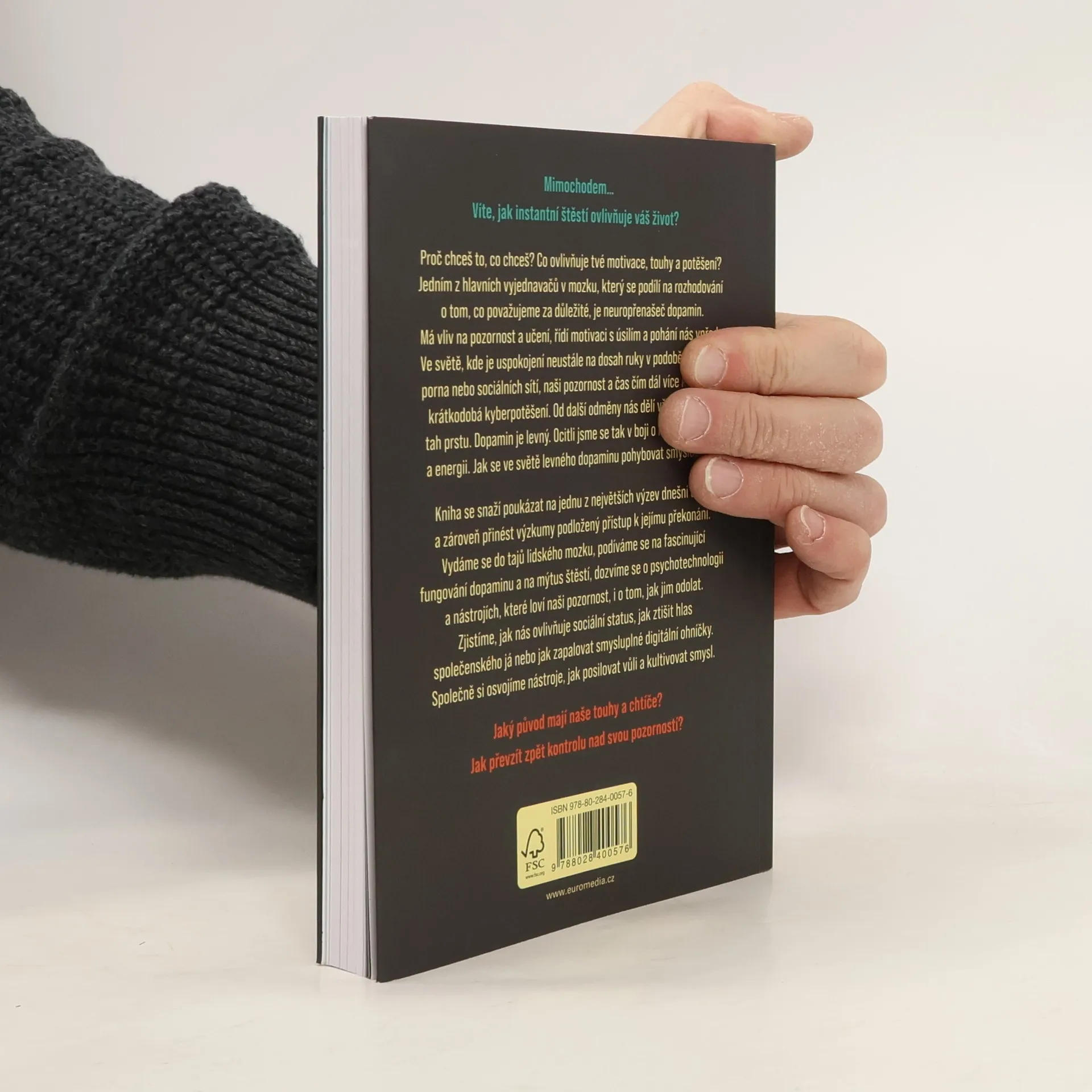 Proč chceš to, co chceš? Co ovlivňuje tvé motivace, touhy a potěšení? Jedním z hlavních vyjednavačů v mozku, který se podílí na rozhodování o tom, co považujeme za důležité, je neuropřenašeč dopamin. Má vliv na pozornost a učení, řídí motivaci s úsilím a pohání nás vpřed. V evoluční historii byl dopamin drahý ? na cestě za odměnou bylo nutné vyvinout úsilí a překonat překážky. Dnes je tomu jinak. Ve světě, kde je uspokojení neustále na dosah ruky v podobě telefonů, porna nebo sociálních sítí, naši pozornost a čas čím dál více kontrolují krátkodobá kyberpotěšení. Od další odměny nás dělí vždy jen jeden tah prstu. Dopamin je levný. Ocitli jsme se tak v boji o naši pozornost a energii. Jak se ve světě levného dopaminu pohybovat smysluplně? Kniha se snaží poukázat na jednu z největších výzev dnešní doby a zároveň přinést výzkumy podložený přístup k jejímu překonání. Vydáme se do tajů lidského mozku, podíváme se na fascinující fungování dopaminu a na mýtus štěstí, dozvíme se o psychotechnologii a nástrojích, které loví naši pozornost, i o tom, jak jim odolat. Zjistíme, jak nás ovlivňuje sociální status, jak ztišit hlas společenského já nebo jak zapalovat smysluplné digitální ohníčky. Společně si osvojíme nástroje, jak posilovat vůli a kultivovat smysl.