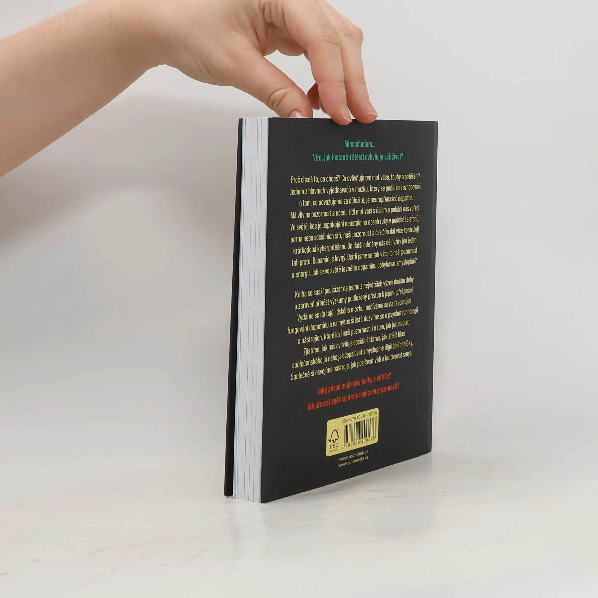 Proč chceš to, co chceš? Co ovlivňuje tvé motivace, touhy a potěšení? Jedním z hlavních vyjednavačů v mozku, který se podílí na rozhodování o tom, co považujeme za důležité, je neuropřenašeč dopamin. Má vliv na pozornost a učení, řídí motivaci s úsilím a pohání nás vpřed. V evoluční historii byl dopamin drahý ? na cestě za odměnou bylo nutné vyvinout úsilí a překonat překážky. Dnes je tomu jinak. Ve světě, kde je uspokojení neustále na dosah ruky v podobě telefonů, porna nebo sociálních sítí, naši pozornost a čas čím dál více kontrolují krátkodobá kyberpotěšení. Od další odměny nás dělí vždy jen jeden tah prstu. Dopamin je levný. Ocitli jsme se tak v boji o naši pozornost a energii. Jak se ve světě levného dopaminu pohybovat smysluplně? Kniha se snaží poukázat na jednu z největších výzev dnešní doby a zároveň přinést výzkumy podložený přístup k jejímu překonání. Vydáme se do tajů lidského mozku, podíváme se na fascinující fungování dopaminu a na mýtus štěstí, dozvíme se o psychotechnologii a nástrojích, které loví naši pozornost, i o tom, jak jim odolat. Zjistíme, jak nás ovlivňuje sociální status, jak ztišit hlas společenského já nebo jak zapalovat smysluplné digitální ohníčky. Společně si osvojíme nástroje, jak posilovat vůli a kultivovat smysl.