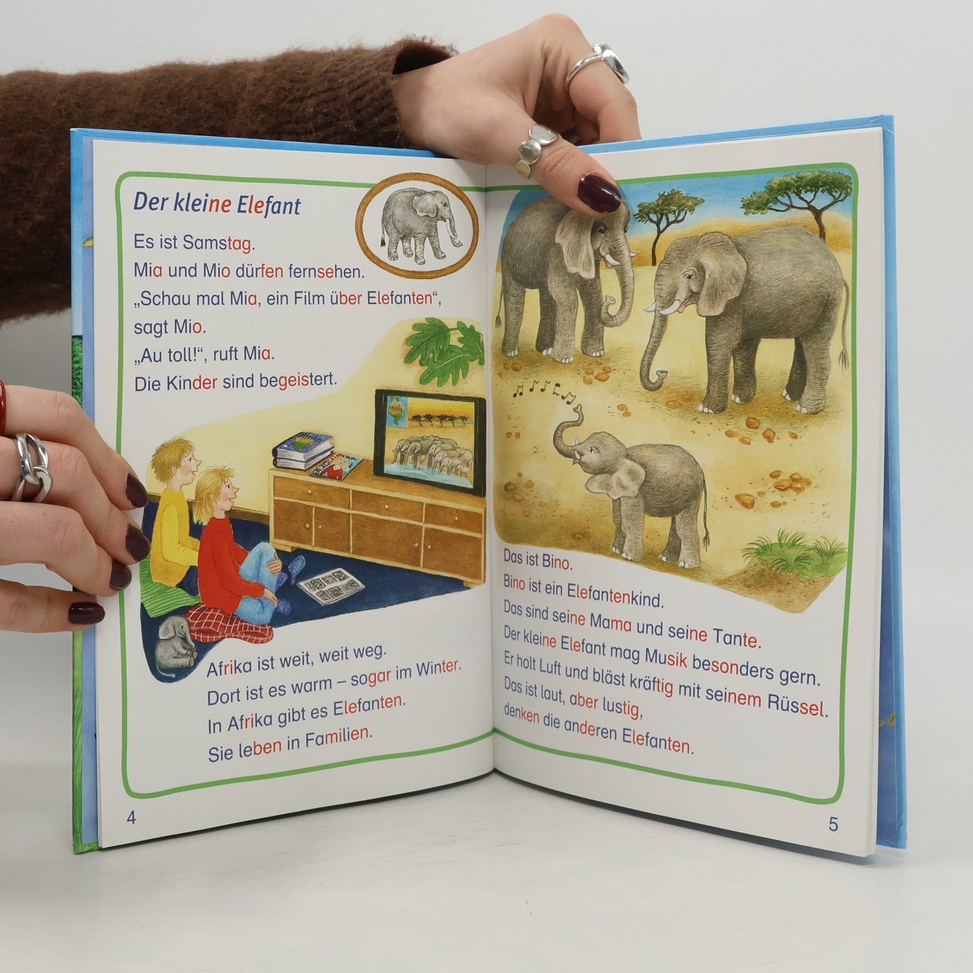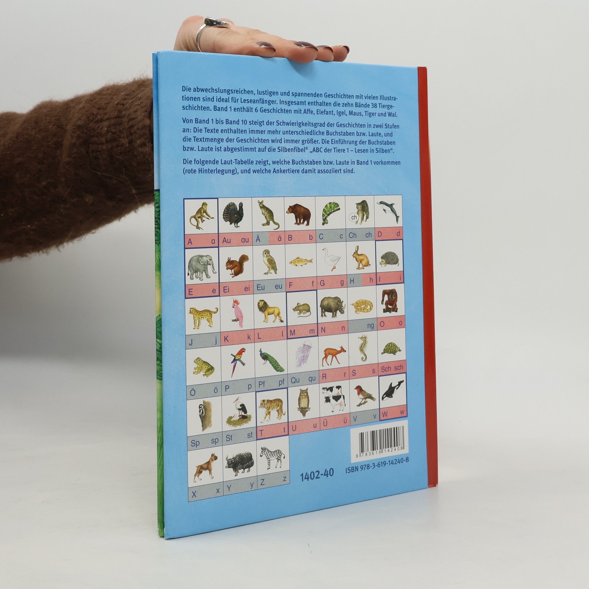 Die Tiergeschichten mit Mia und Mio sind weiteres Lesematerial mit dem farbigen Silbentrenner. Jeder Band enthält abwechslungsreiche, lustige und spannende Geschichten zu den Tieren der Ankerbilder von „ABC der Tiere“ (Bestellnummer 1402 - 751). Die Texte enthalten immer mehr unterschiedliche Buchstaben bzw. Laute, und die Textmenge der Geschichten wird immer größer. Die Einführung der Buchstaben bzw. Laute ist abgestimmt auf die Silbenfibel® „ABC der Tiere 1 – Lesen in Silben“. Die Geschichten in Band 1: •Der kleine Elefant •Mio und Mia im Garten •Unsere kleine Maus •Tiger in Indien •Der Affe ist los •Ein aufregender Traum •Übersicht der Ankertiere Die Geschichten in allen weiteren Bände: Band 2 mit Fisch, Gans, Kakadu, Delfin, Schildkröte Band 3 mit Kröte, Nashorn, Papagei, Pfau, Löwe Band 4 mit Auerhahn, Hase, Kühen, Reh, Uhu Band 5 mit Bär, Eichhörnchen, Seepferdchen Band 6 mit Specht, Storch, Zebra Band 7 mit Känguru, Orang-Utan, Schlange Band 8 mit Eule, Jaguar, Katze Band 9 mit Qualle, Vogel, Yak Band 10 mit Boxer, Chamäleon Mit der Bestellnummer 1402- 51 erhalten Sie Arbeitsblätter zu allen Geschichten, KVs, Spiralbindung