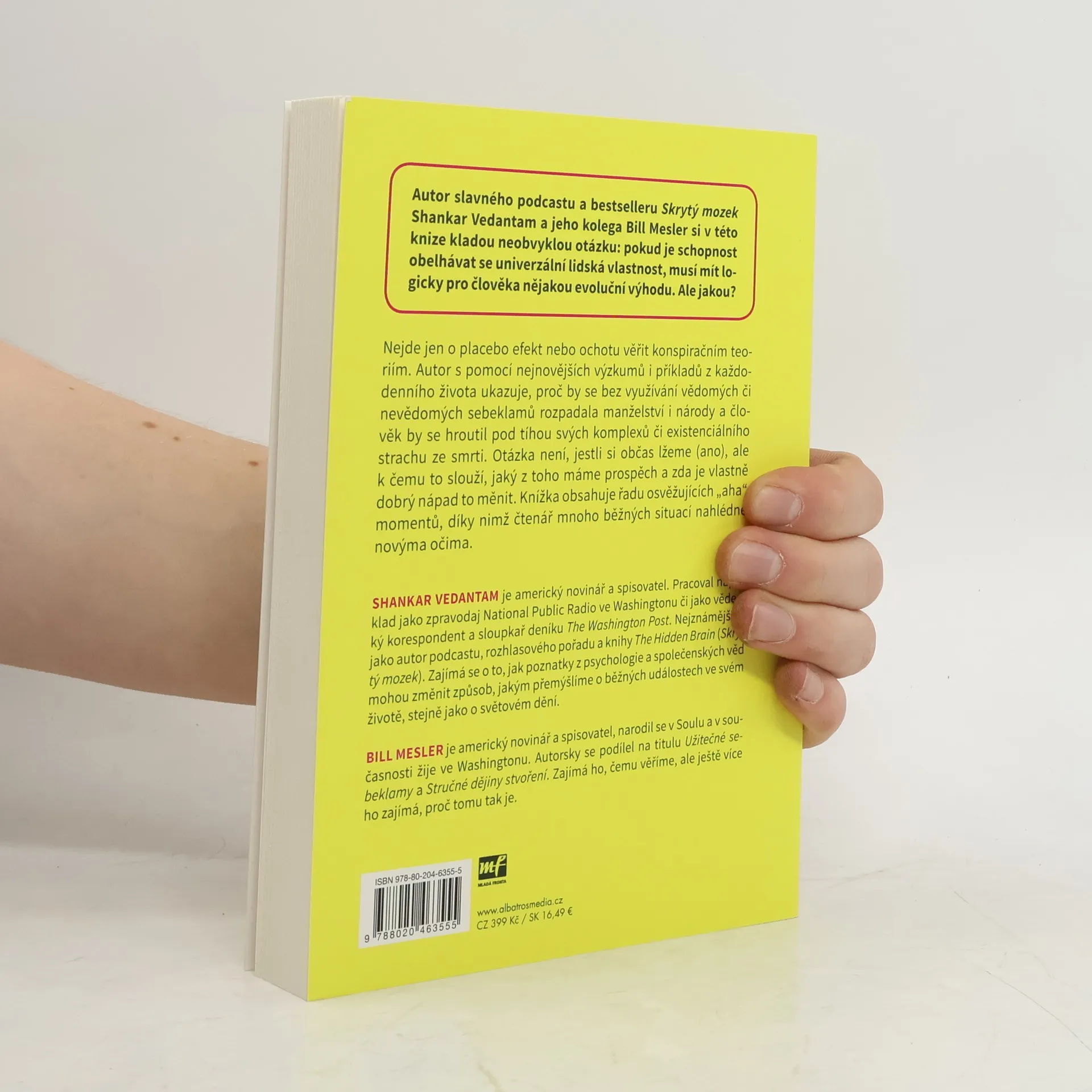 Autor slavného podcastu Skrytý mozek si v této knize klade neobvyklou otázku: pokud je schopnost lhát a obelhávat se univerzální lidská vlastnost, musí mít pro nás logicky nějakou evoluční výhodu. Ale jakou? Nejde jen o placebo, lži z laskavosti nebo sklon věřit konspiračním teoriím. Autor nanejnovějších vědeckých výzkumech i příkladech z každodenního života ukazuje, že otázka není, zda sobě i druhým někdy lžeme (ano), ale jaký z toho my či oni máme prospěch a zda je vlastně dobrý nápad to měnit.