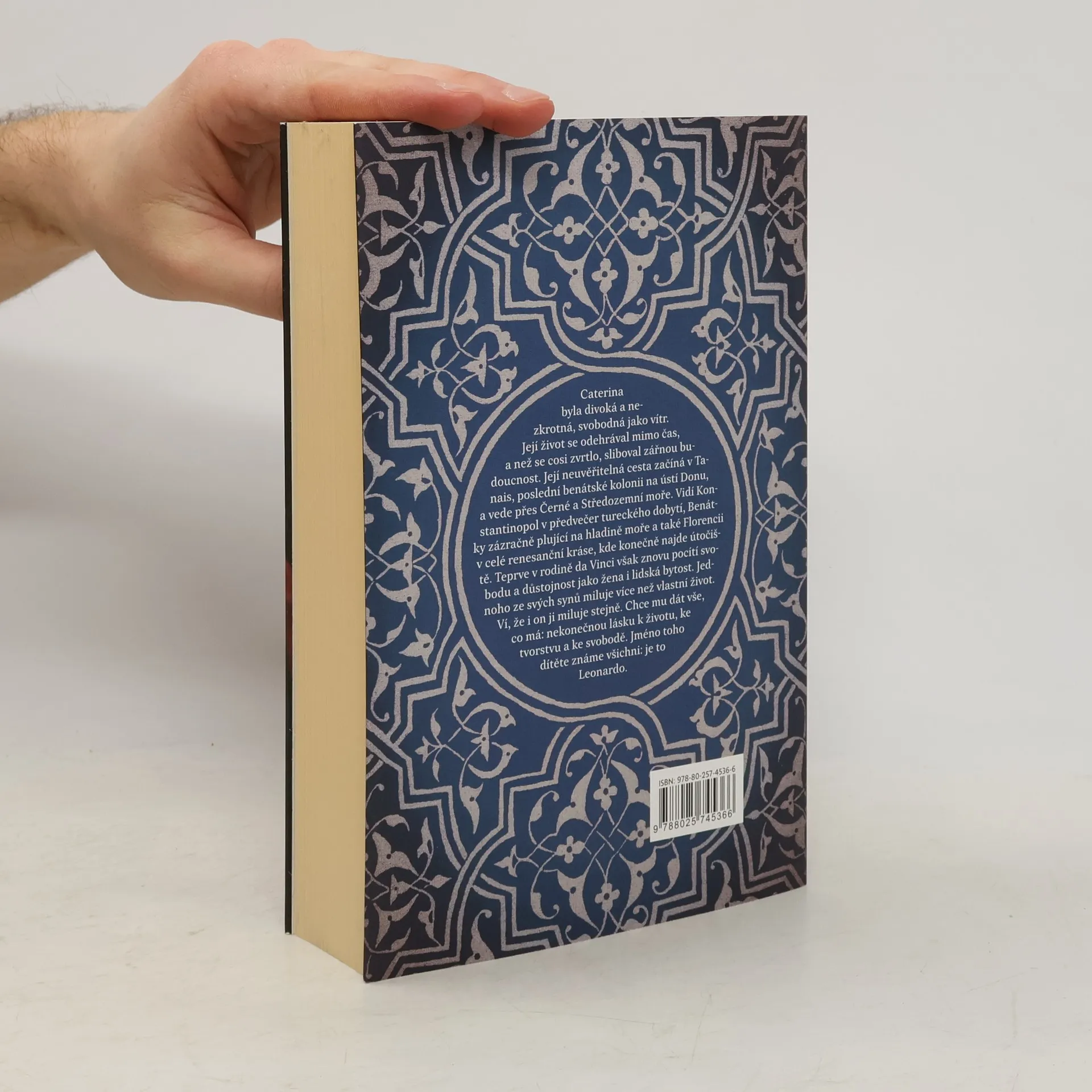 Román, který v sobě propojuje akademickou esej a historický dokument, odkrývá tajemství původu Cateriny, matky Leonadra da Vinci, ale také přehodnocuje obraz renesančního období. Caterinu, čerkeskou princeznu, unesli v horách na Kavkaze, kde ji prodali do otroctví a poslali do Benátek. Tam potká mladého notáře Piera da Vinci, který ji z otroctví vysvobodí. A právě o Caterině vypráví tato historická fikce. Caterina byla divoká a nezkrotná. Její neuvěřitelná cesta začíná v Tanais, poslední benátské kolonii na ústí Donu, a vede přes Černé a Středozemní moře. Vidí Konstantinopol v předvečer tureckého dobytí, Benátky zázračně plující na hladině moře a Florencii v celé renesanční kráse, kde najde útočiště. V rodině da Vinci znovu pocítí svobodu a důstojnost jako žena i lidská bytost. Jednoho ze svých synů miluje více než svůj vlastní život. Ví, že i on ji miluje stejně. Chce mu dát vše, co má: svou nekonečnou lásku k životu, ke tvorům a ke svobodě. Jméno toho dítěte známe všichni: je to Leonardo. Nakladatelská anotace. Kráceno.