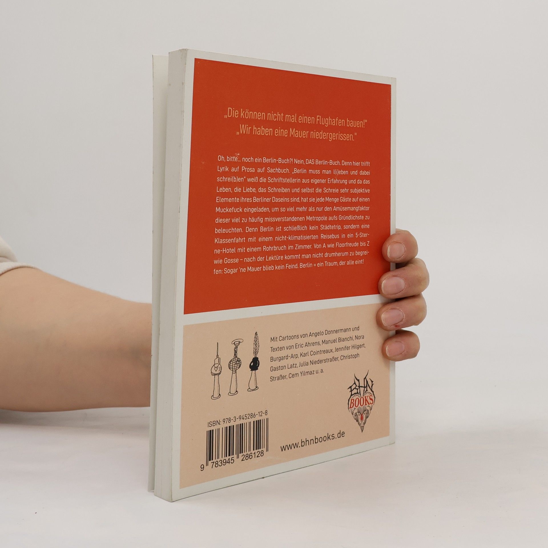 „Die können nicht mal einen Flughafen bauen!“ „Wir haben eine Mauer niedergerissen.“ Oh, bitte...noch ein Berlin-Buch?! Nein, DAS Berlin-Buch. Denn hier trifft Lyrik auf Prosa auf Sachbuch. „Berlin muss man l(i)eben und dabei schrei(b)en“ weiß die Schriftstellerin aus eigener Erfahrung und da das Leben, die Liebe, das Schreiben und selbst die Schreie sehr subjektive Elemente ihres Berliner Daseins sind, hat sie jede Menge Gäste auf einen Muckefuck eingeladen, um so viel mehr als nur den Amüsemangfaktor dieser viel zu häufig missverstandenen Metropole aufs Gründlichste zu beleuchten. Denn Berlin ist schließlich kein Städtetrip, sondern eine Klassenfahrt mit einem nicht-klimatisierten Reisebus in ein 5-Sterne-Hotel mit einem Rohrbruch im Zimmer. Von A wie Floorfreude bis Z wie Gosse – nach der Lektüre kommt man nicht drumherum zu begreifen: Sogar ’ne Mauer blieb kein Feind. Berlin = ein Traum, der alle eint! Mit Cartoons von Angelo Donnermann und Texten von Eric Ahrens, Manuel Bianchi, Nora Burgard-Arp, Karl Cointreaux, Jennifer Hilgert, Gaston Latz, Julia Niederstraßer, Christoph Straßer, Cem Yilmaz u. a.