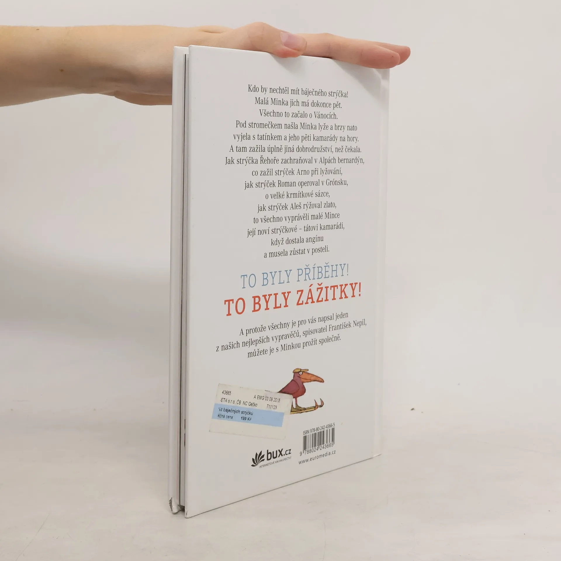Malá Minka nemá jen jednoho báječného strýčka, ale hned celých pět. A zažívá s nimi neuvěřitelná dobrodružství. Všechno začalo tím, že jí Ježíšek nadělil lyže a zanedlouho se s tatínkem a jeho pěti kamarády vypravila na hory. Čekaly tam na ni skutečně nebývalé příběhy. Přečtěte si i vy, jak strýčka Řehoře zachraňoval v Alpách bernardýn, jak strýček Roman operoval v Grónsku, o velké krmítkové sázce, jak strýček Aleš rýžoval zlato... To všechno Mince vyprávěli její noví strýčkové – tátovi kamarádi, když dostala angínu a musela zůstat v posteli. Ale užila si vlastně mnohem víc než na sjezdovce!