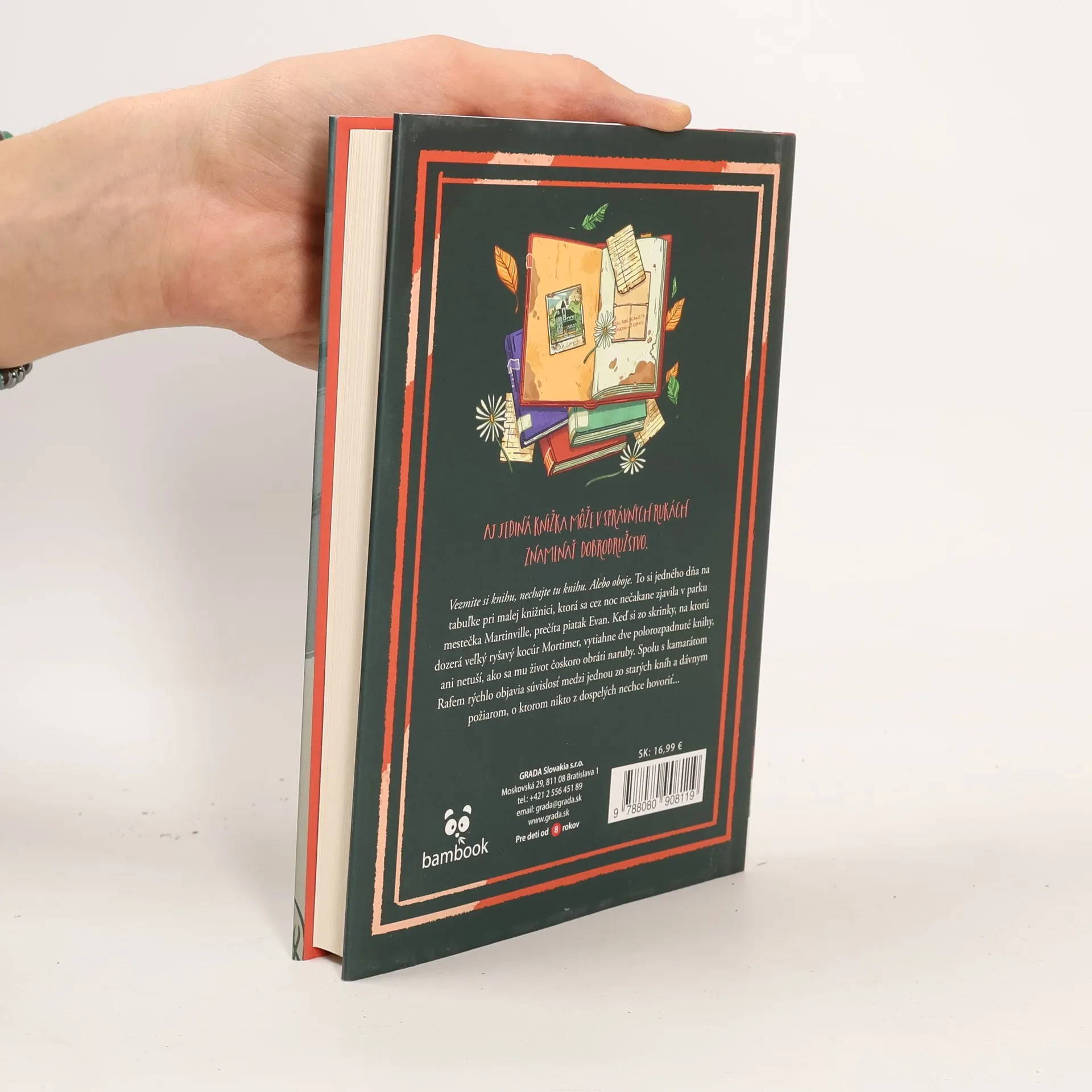 Aj jediná knižka môže v správnych rukách znamenať dobrodružstvo. Vezmite si knihu, nechajte tu knihu. Alebo oboje. To si jedného dňa na tabuľke pri malej knižnici, ktorá sa cez noc nečakane zjavila v parku mestečka Martinville, prečíta piatak Evan. Keď si zo skrinky, na ktorú dozerá veľký ryšavý kocúr Mortimer, vytiahne dve polorozpadnuté knihy, ani netuší, ako sa mu život čoskoro obráti naruby. Spolu s kamarátom Rafem rýchlo objavia súvislosť medzi jednou zo starých kníh a dávnym požiarom, o ktorom nikto z dospelých nechce hovoriť. Najmä Evanov otec, ktorý sa začne správať mimoriadne zvláštne... Podarí sa chlapcom vypátrať, čo sa pred dvadsiatimi rokmi naozaj stalo?