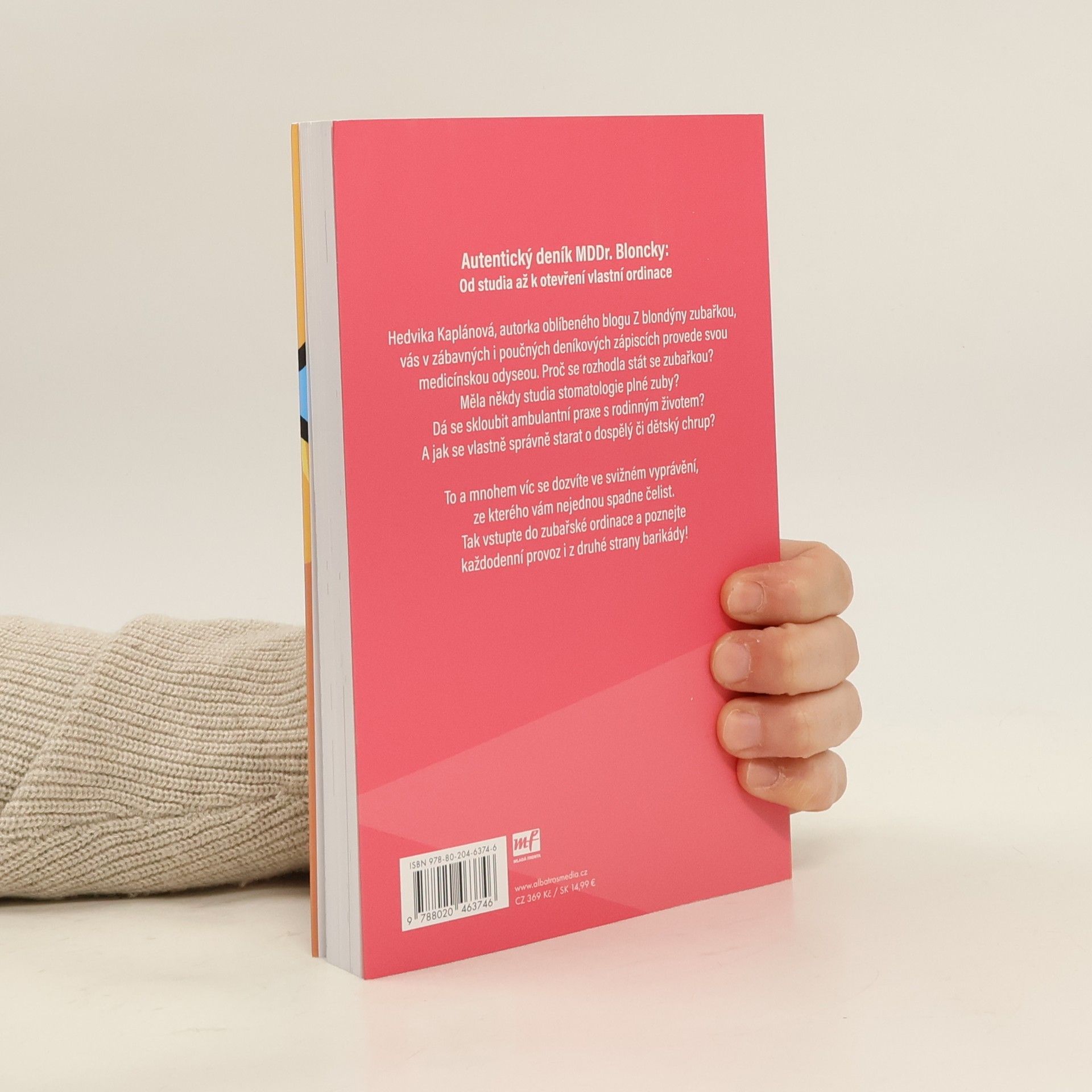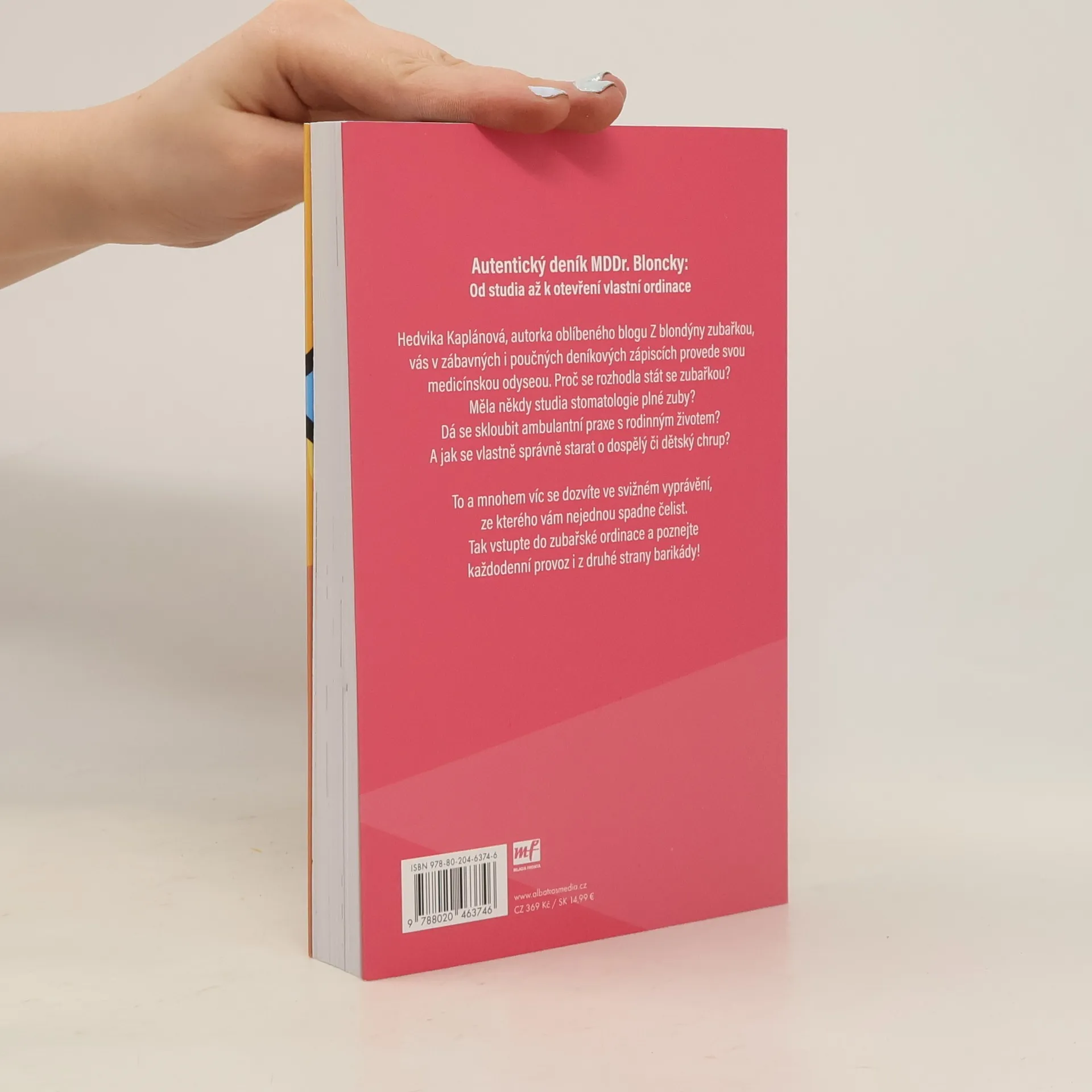 Autentický deník MDDr. Bloncky: od studia až k otevření vlastní ordinace. Hedvika Kaplánová, autorka oblíbeného blogu Z blondýny zubařkou, vás v zábavných i poučných deníkových zápiscích provede svou medicínskou odyseou. Proč se rozhodla stát zubařkou? Měla někdy studia stomatologie plné zuby? Dá se skloubit ambulantní praxe s rodinným životem? A jak se vlastně správně starat o dospělý či dětský chrup? To a mnohem víc se dozvíte ve svižném vyprávění, ze kterého vám nejednou spadne čelist. Tak vstupte do zubařské ordinace a poznejte každodenní provoz i z druhé strany barikády! Nakladatelská anotace.