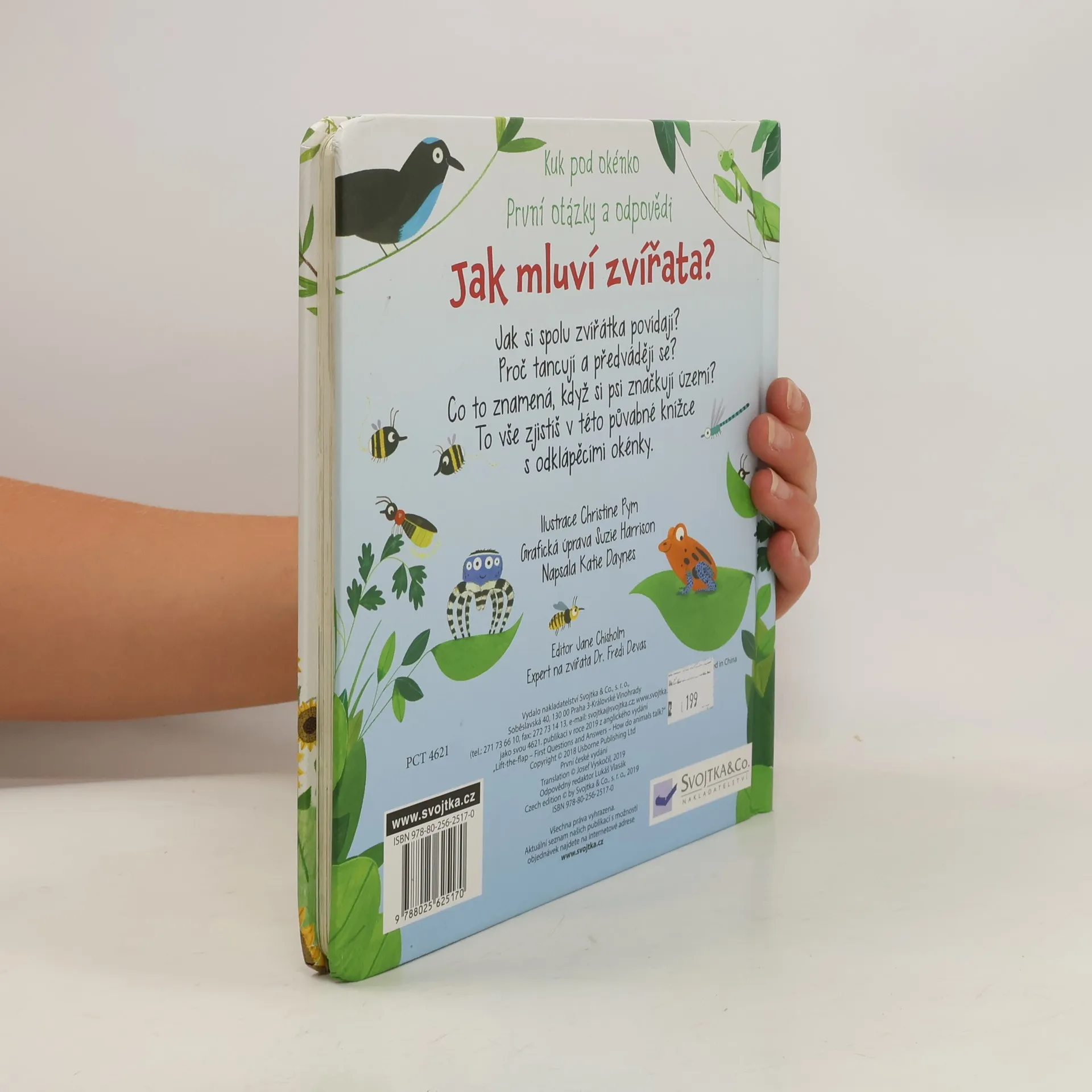 Zvířata mezi sebou komunikují mnoha způsoby. V této bohatě ilustrované knize se spoustou odklápěcích okének se dozvíš, jak takové dorozumívání vypadá. Chodíš často s rodiči na procházky do přírody nebo do zoologické zahrady, máš rád či ráda zvířata a zajímá tě, co znamená jejich podivné chování? V této knize se to dozvíš! Zvířata to dělají proto, že si potřebují něco říct. Ale co všechno používají k tomu, aby se mezi sebou dorozuměla? Používají širokou škálu nejrůznějších zvuků, pohybů a pachů. Některé příklady uvádí tato kniha. Odklop okénka a zjisti, jak spolu "mluví" psi a kočky, ptáci, žáby, hmyz nebo třeba opice. A co taková panda, tučňáci nebo velryba? Kniha nabízí plno zajímavých zvířat a jejich specifické způsoby dorozumívání a poskytne dítěti základní představu o tom, jak je možné, že se spolu tvorové ze zvířecí říše dorozumívají, i když my lidé jejich řeči nerozumíme.