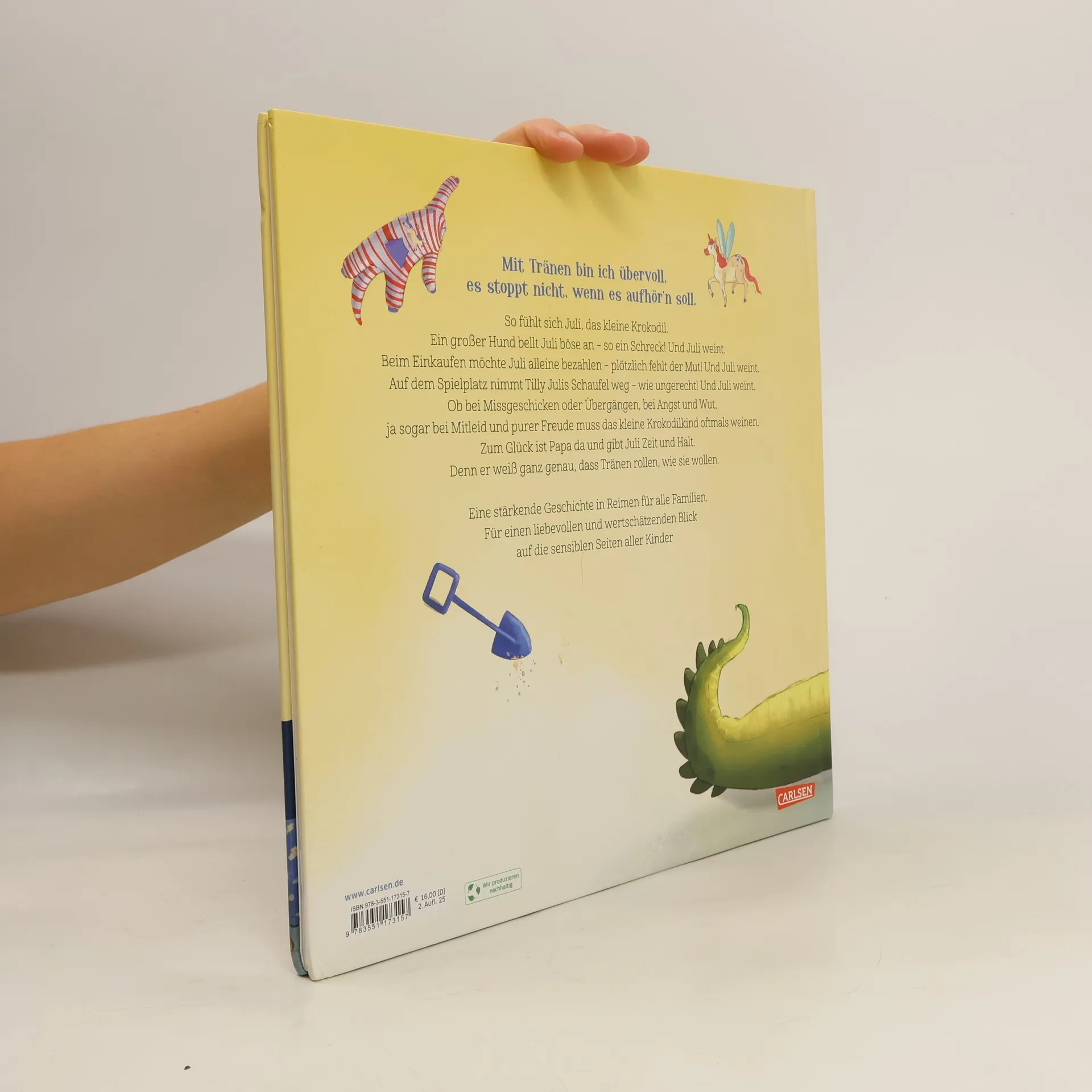 Der Bestseller als großformatiges Hardcover-Bilderbuch bietet einen liebevollen Blick auf die sensiblen Seiten von Kindern. Die Geschichte von Juli, dem kleinen Krokodil, thematisiert Gefühle wie Angst, Wut und Freude. Mit Reimen und liebevollen Bildern fördert das Buch die Eltern-Kind-Kommunikation und stärkt Bindung sowie Selbstbewusstsein.