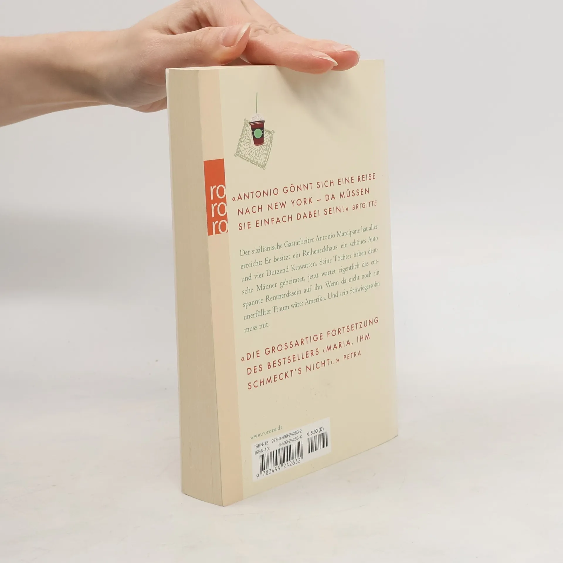 „Antonio gönnt sich eine Reise nach New York – Da müssen Sie einfach dabei sein!“ (Brigitte)Der sizilianische Gastarbeiter Antonio Marcipane hat alles erreicht: Er besitzt ein Reiheneckhaus, ein schönes Auto und vier Dutzend Krawatten. Seine Töchter haben deutsche Männer geheiratet, jetzt wartet eigentlich das entspannte Rentnerdasein auf ihn. Wenn da nicht noch ein unerfüllter Traum wäre: Amerika. Und sein Schwiegersohn muss mit.„Die großartige Fortsetzung des Bestsellers ‚Maria, ihm schmeckt’s nicht’.“ (Petra)