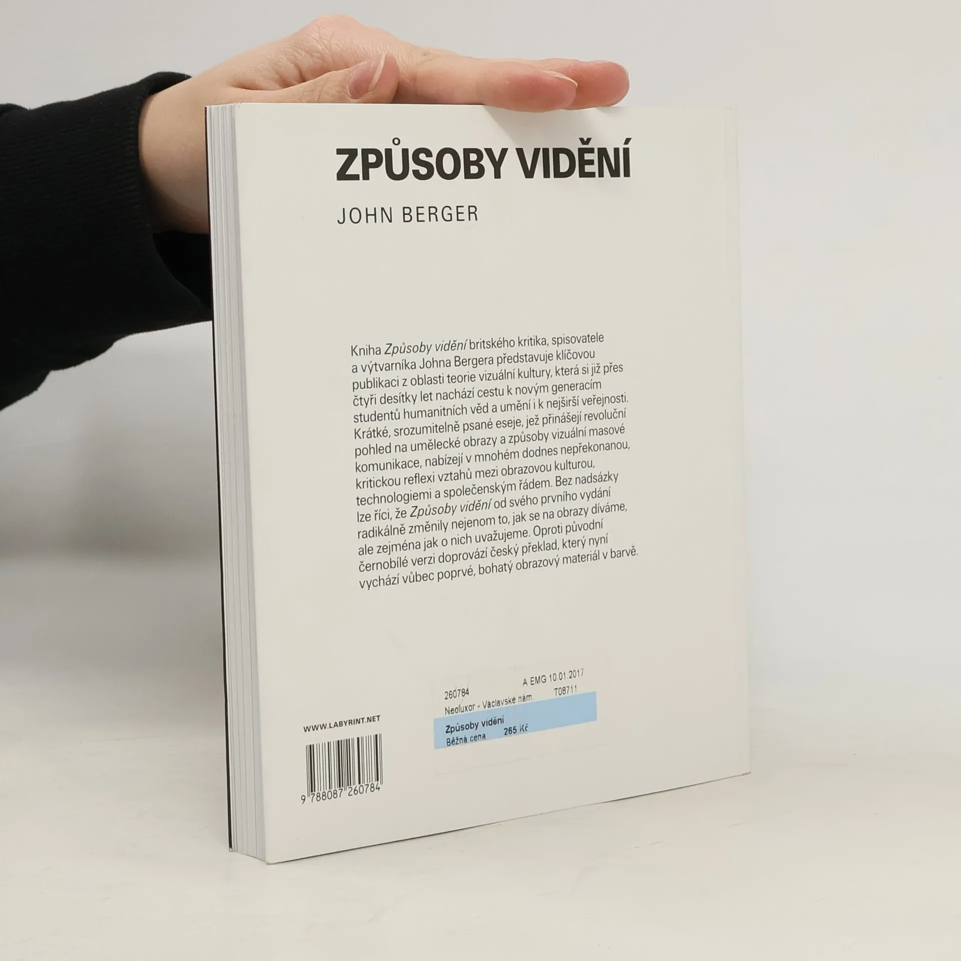 Jedna z nejinspirativnějších a nejvlivnějších knih o umění a vizualitě, která je právem považována za zakladatelskou klasiku oboru vizuálních studií. Poprvé vyšla v roce 1972, ale dodnes neztratila nic ze své břitké pronikavosti, s níž bezprostředně a srozumitelně zpřístupňuje základní vědění o obrazech a dívání, do té doby zastřené sofistikovanými mystifikacemi profesionálních teoretiků a kritiků. Sedm esejů (z nichž tři jsou čistě obrazové) se zabývá takovými tématy, jako jsou moderní reprodukce starých mistrů, zobrazováním ženské nahoty, vztahu vidění a moci anebo reklamou. Kniha Způsoby vidění (Ways of Seeing) britského kritika, spisovatele a výtvarníka Johna Bergera (nar. 1926) představuje klíčovou publikaci z oblasti teorie vizuální kultury. Oproti původní černobílé verzi český překlad, který nyní vychází vůbec poprvé, doprovází bohatý obrazový materiál v barvě.