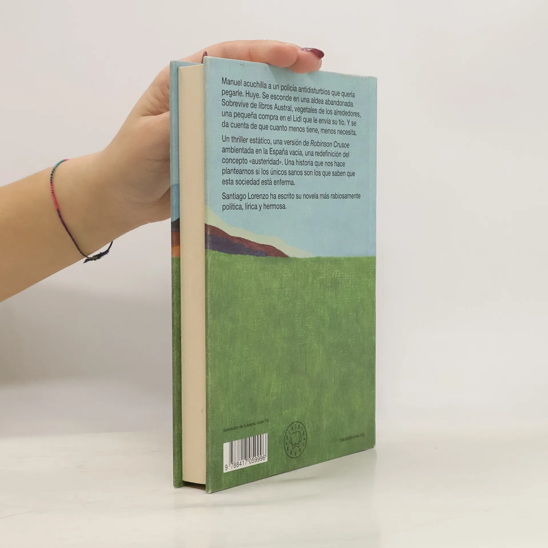Manuel acuchilla a un policía antidisturbios que quería pegarle. Huye. Se esconde en una aldea abandonada. Sobrevive de libros Austral, vegetales de los alrededores, una pequeña compra en el Lidl que le envía su tío. Y se da cuenta de que cuanto menos tiene, menos necesita. Un thriller estático, una versión de Robinson Crusoe ambientada en la España vacía, una redefinición del concepto «austeridad». Una historia que nos hace plantearnos si los únicos sanos son los que saben que esta sociedad está enferma. Santiago Lorenzo ha escrito su novela más rabiosamente política, lírica y hermosa