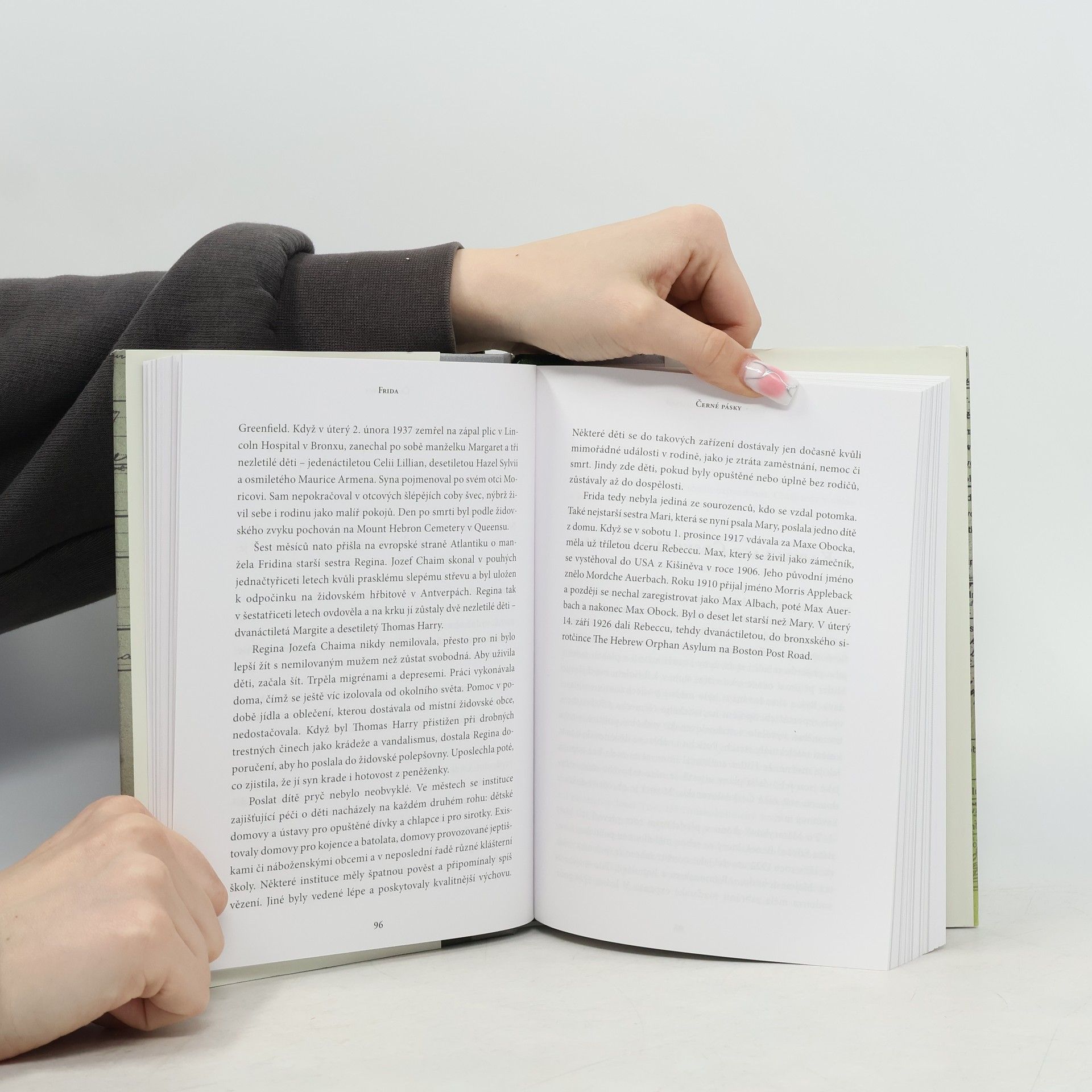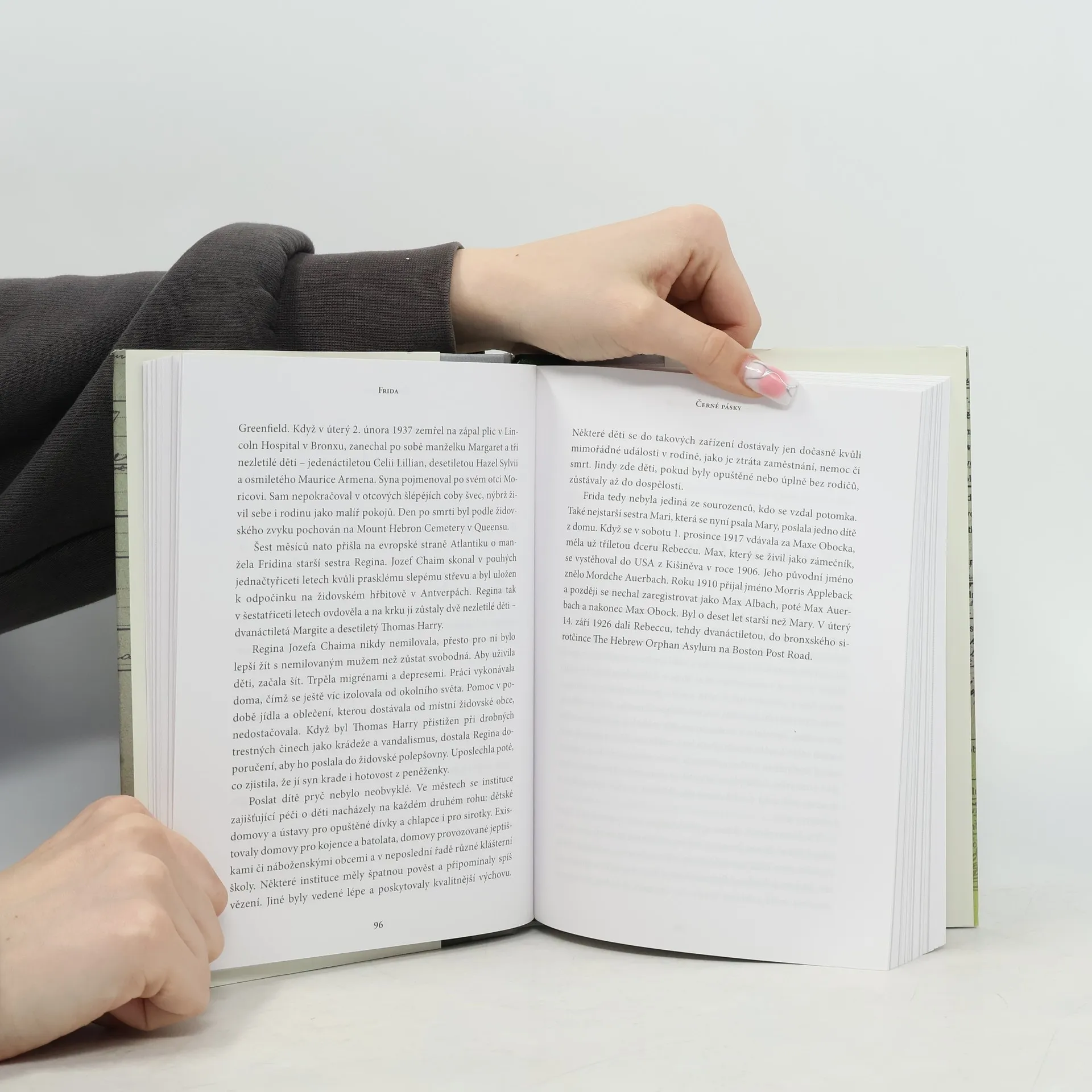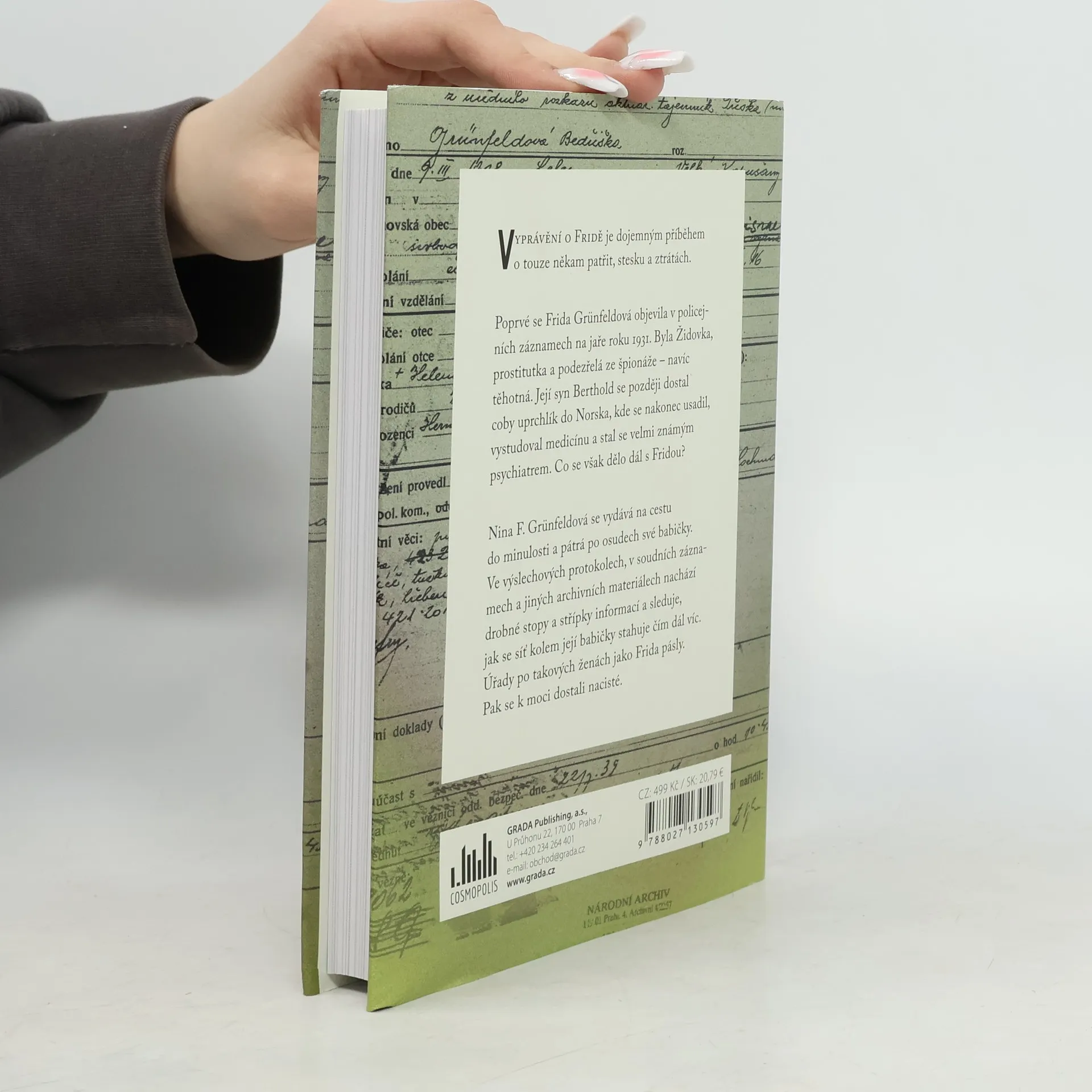 Moje zbloudilá babička ve víru dějin Vyprávění o Fridě je dojemným příběhem o touze někam patřit, stesku a ztrátách. Poprvé se Frida Grünfeldová objevila v policejních záznamech na jaře roku 1931. Byla Židovka, prostitutka a podezřelá ze špionáže – navíc těhotná. Její syn Berthold se později dostal coby uprchlík do Norska, kde se nakonec usadil, vystudoval medicínu a stal se velmi známým psychiatrem. Co se však dělo dál s Fridou? Nina F. Grünfeldová se vydává na cestu do minulosti a pátrá po osudech své babičky. Ve výslechových protokolech, v soudních záznamech a jiných archivních materiálech nachází drobné stopy a střípky informací a sleduje, jak se síť kolem její babičky stahuje čím dál víc. Úřady po takových ženách jako Frida pásly. Pak se k moci dostali nacisté.