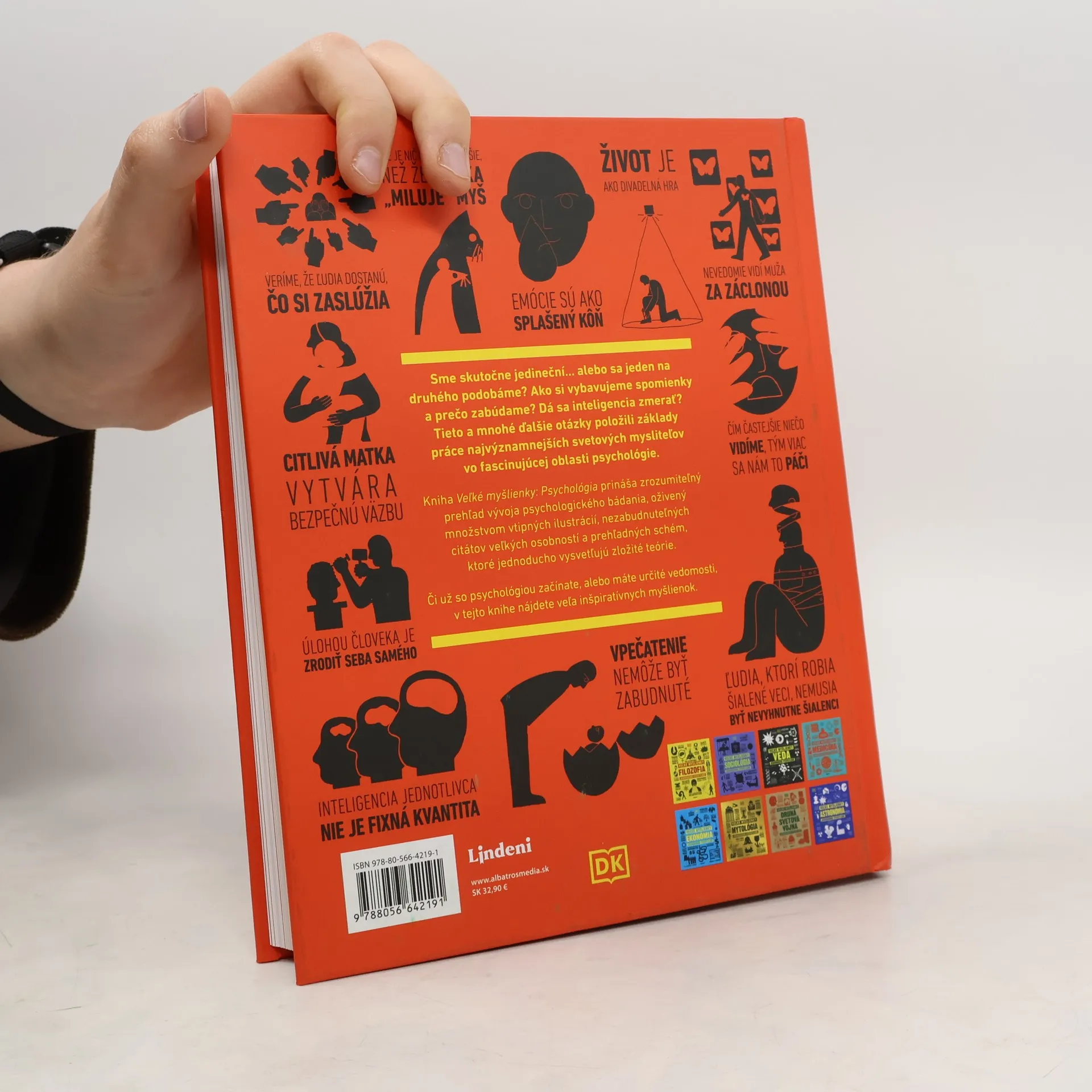 Veľké myšlienky zrozumiteľne podané - pre odborníkov aj pre úplných začiatočníkov. Sme skutočne jedineční… alebo sa jeden na druhého podobáme? Ako si vybavujeme spomienky a prečo zabúdame? Dá sa inteligencia zmerať? Tieto a mnohé ďalšie otázky položili základy práce najvýznamnejších svetových mysliteľov vo fascinujúcej oblasti psychológie. Kniha Veľké myšlienky: Psychológia prináša zrozumiteľný prehľad vývoja psychologického bádania, oživený množstvom vtipných ilustrácií, nezabudnuteľných citátov veľkých osobností a prehľadných schém, ktoré jednoducho vysvetľujú zložité teórie.