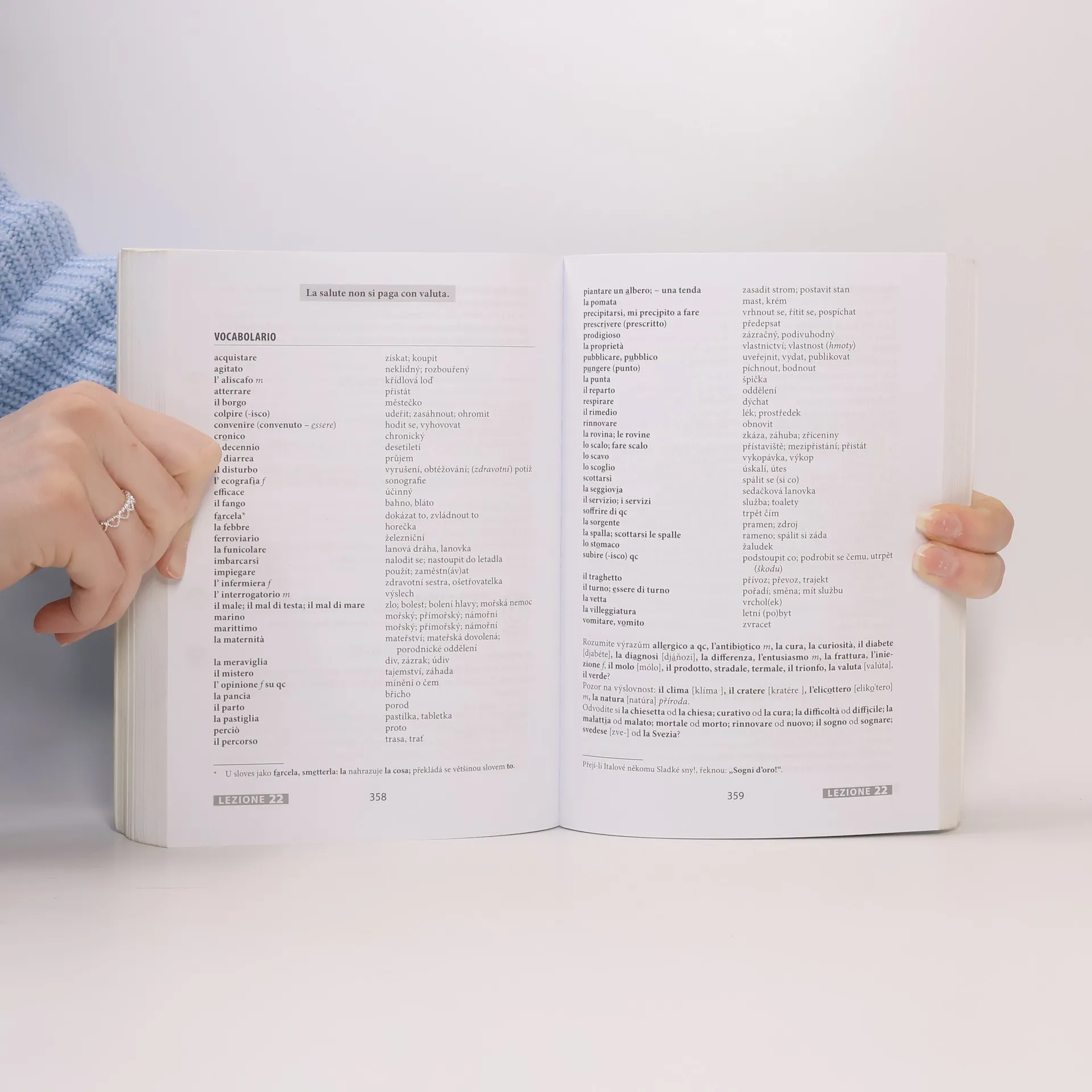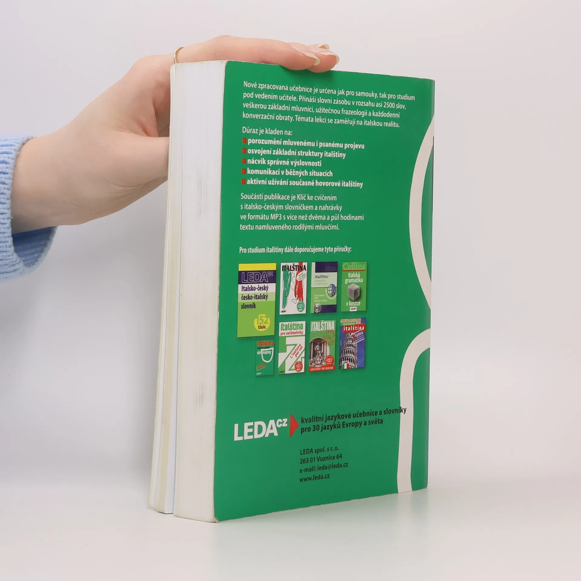 Nově zpracované vydání oblíbené učebnice pro samouky obsahuje italskou mluvnici, slovní zásobu v rozsahu asi 2500 slov, frazeologii a výslovnost. Důraz je kladen na aktivní užívání italštiny, schopnost dorozumět se a pohotově reagovat v nejčastějších situacích. Každou lekci uzavírají kvizy, které mají vzbudit zájem uživatele o kulturu Itálie. Učebnice je určena také pro kursy a školy. Její součástí je klíč ke cvičením s italsko-českým a česko-italským slovníčkem v samostatné brožuře a nahrávka vybraných textů na dvou audio CD.