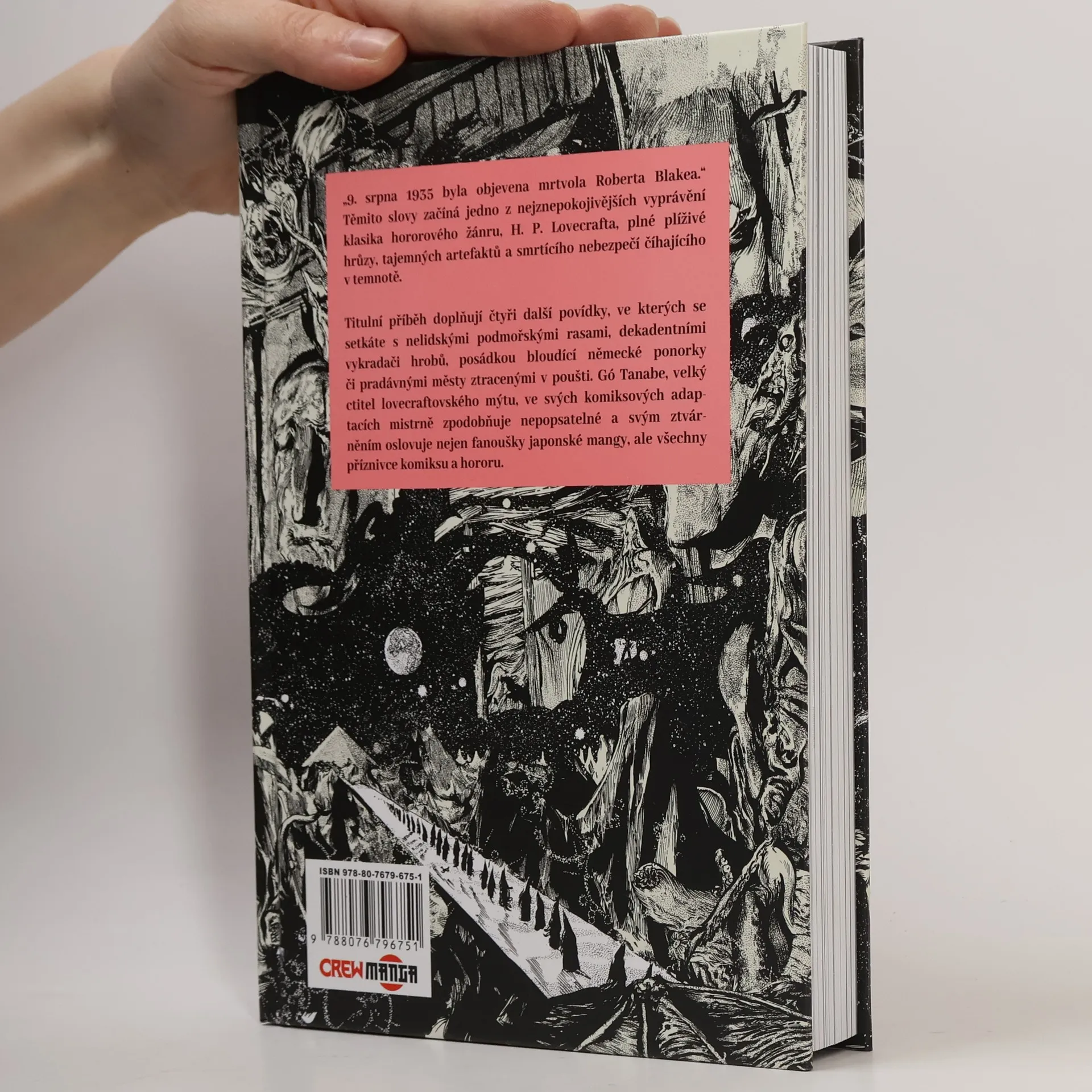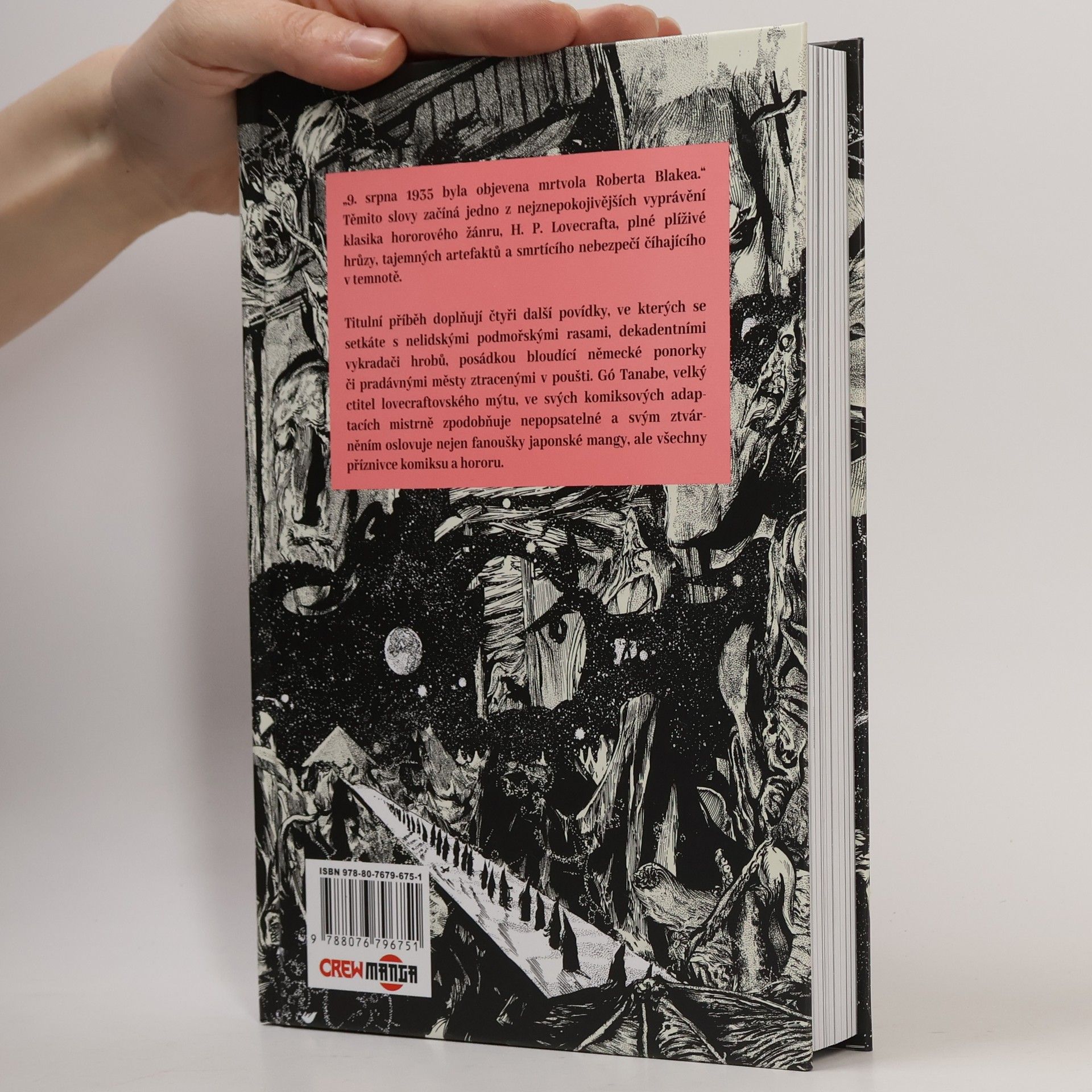 „9. srpna 1935 byla objevena mrtvola Roberta Blakea.“ Těmito slovy začíná jedno z nejznepokojivějších vyprávění klasika hororového žánru, H. P. Lovecrafta, plné plíživé hrůzy, tajemných artefaktů a smrtícího nebezpečí číhajícího v temnotě. Titulní příběh doplňují čtyři další povídky, ve kterých se setkáte s nelidskými podmořskými rasami, dekadentními vykradači hrobů, posádkou bloudící německé ponorky či pradávnými městy ztracenými v poušti. Gó Tanabe, velký ctitel lovecraftovského mýtu, ve svých komiksových adaptacích mistrně zpodobňuje nepopsatelné a svým ztvárněním oslovuje nejen fanoušky japonské mangy, ale všechny příznivce komiksu a hororu.