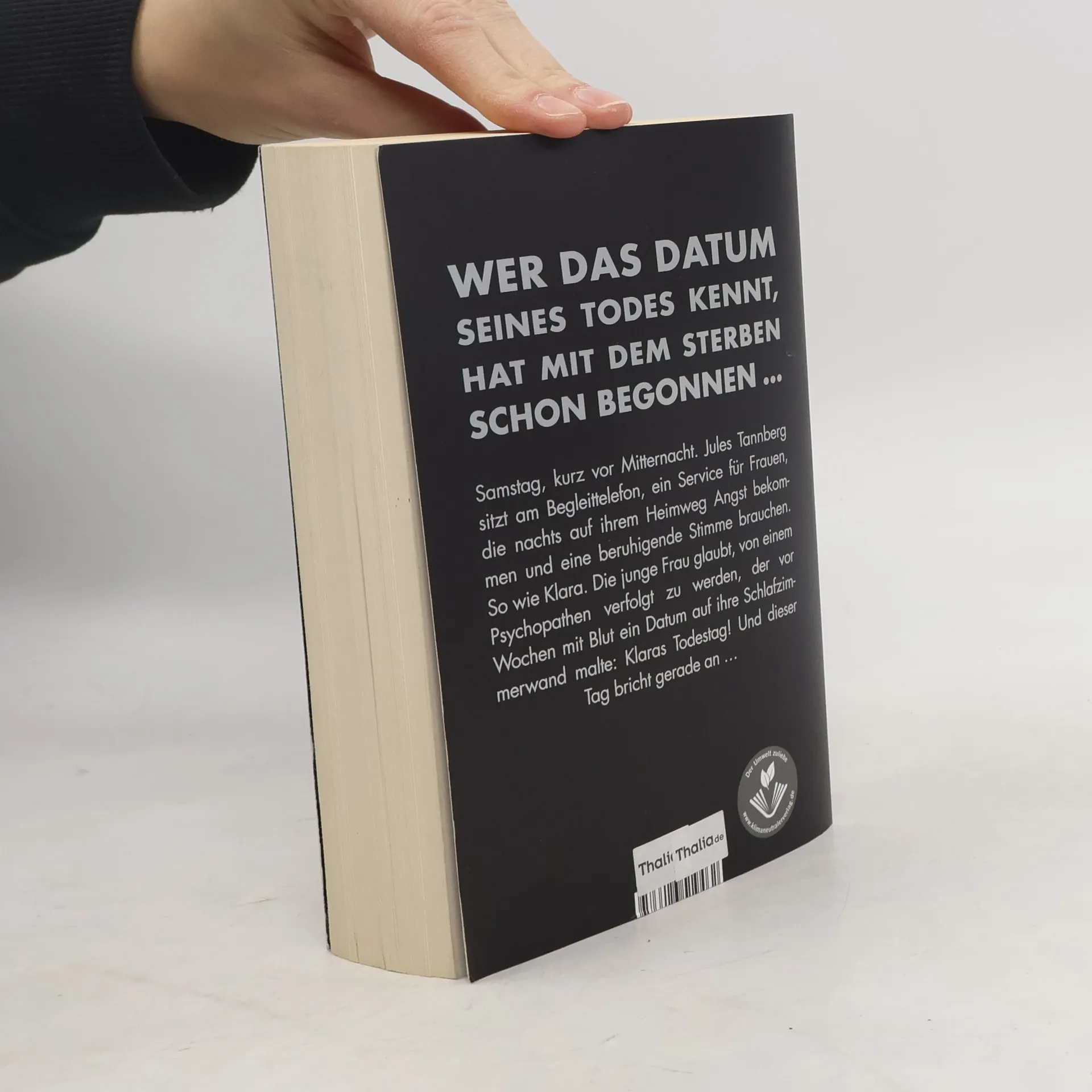 Wer das Datum seines Todes kennt, hat mit dem Sterben schon begonnen – dieser Bestseller von Sebastian Fitzek ist nichts für schwache Nerven! Es ist Samstag, kurz nach 22.00 Uhr. Jules Tannberg sitzt am Begleit-Telefon. Ein ehrenamtlicher Telefon-Service für Frauen, die zu später Stunde auf ihrem Heimweg Angst bekommen und sich einen telefonischen Begleiter wünschen, dessen beruhigende Stimme sie sicher durch die Berliner Nacht nach Hause führt - oder im Notfall Hilfe ruft. Noch nie gab es eine wirklich lebensgefährliche Situation. Bis heute, als Jules mit Klara spricht. Die junge Frau hat entsetzliche Angst. Sie glaubt, von einem Mann verfolgt zu werden, der sie schon einmal überfallen hat und der mit Blut ein Datum auf ihre Schlafzimmerwand malte: Klaras Todestag! Und dieser Tag bricht in nicht einmal zwei Stunden an ... Ein Serienmörder auf freiem Fuß – geheimnisvoll, beklemmend, nervenaufreibend: Einer der spannendsten Thriller aus der Feder des Bestsellerautors Sebastian Fitzek „Eines vermag dieser Autor wie kein Zweiter: eine Spannung aufzubauen, die zum Schluss schon fast als schmerzhaft empfunden wird.“ krimi-couch