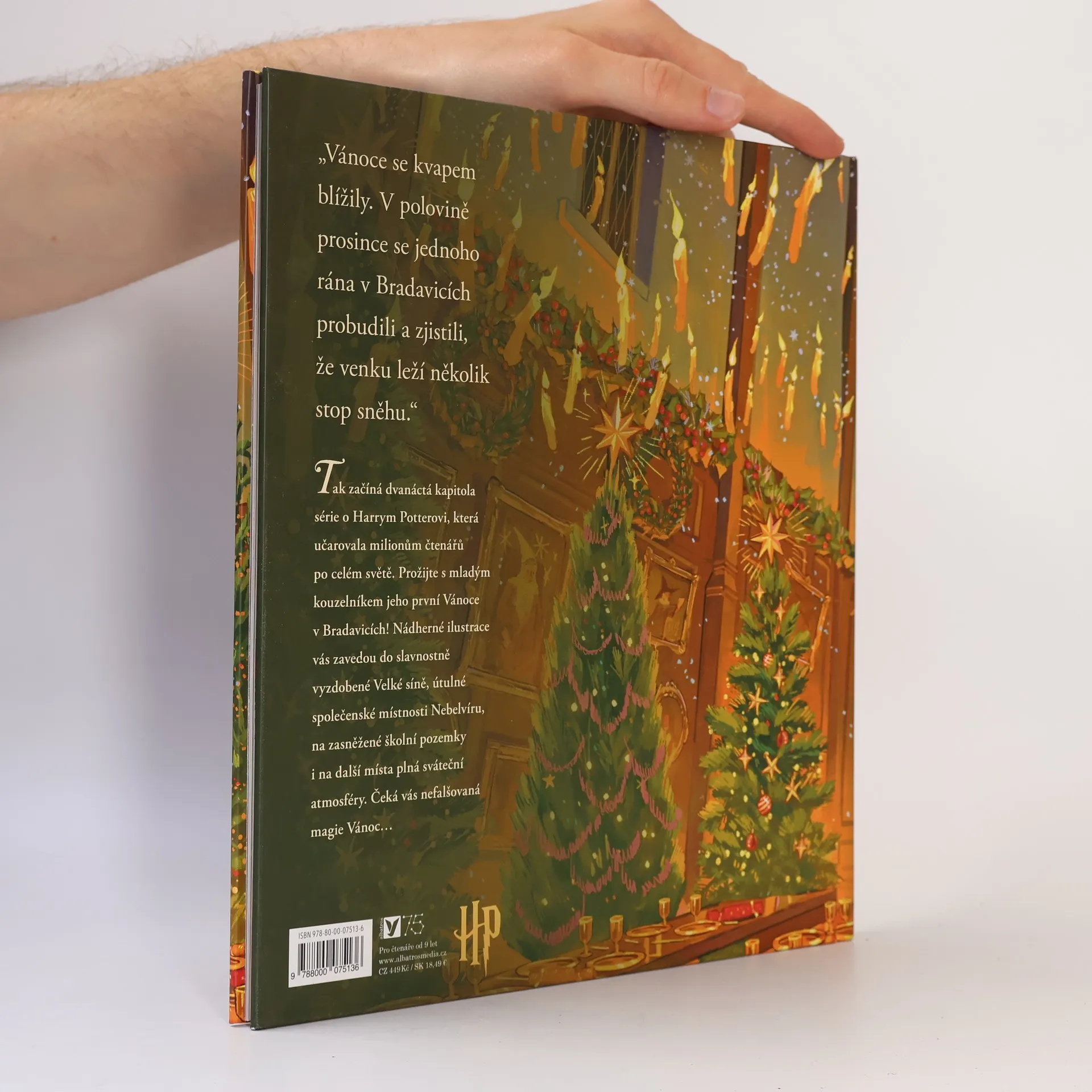 Vánoční příběh s celostránkovými ilustracemi pro malé i velké fanoušky Harryho Pottera. "Vánoce se kvapem blížily. V polovině prosince se jednoho rána v Bradavicích probudili a zjistili, že venku leží několik stop sněhu." Tak začíná dvanáctá kapitola série o Harrym Potterovi. Prožijte s mladým kouzelníkem jeho první Vánoce v Bradavicích. Nakladatelská anotace. Kráceno.