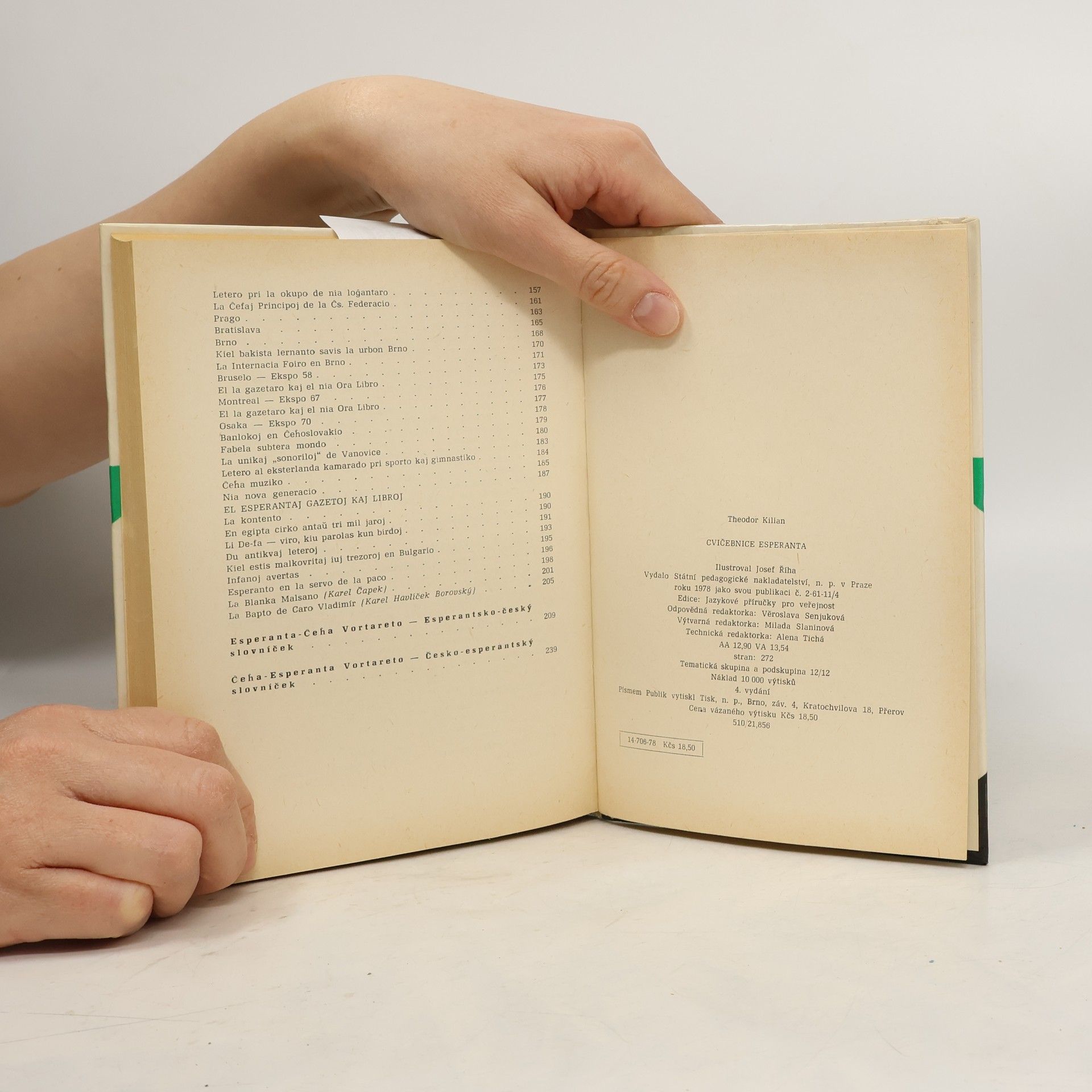 Učebnice, jejímž cílem je pasívní i aktivní znalost esperanta, obsahuje kromě 20 lekcí ještě čítanku textů, esperantsko-český a česko-esperantský slovníček a kontrolní otázky k opakování probrané látky. Čítanka je sestavena z článků, dopisů, ukázek překladů z české literatury iz původních příspěvků esperantských časopisů