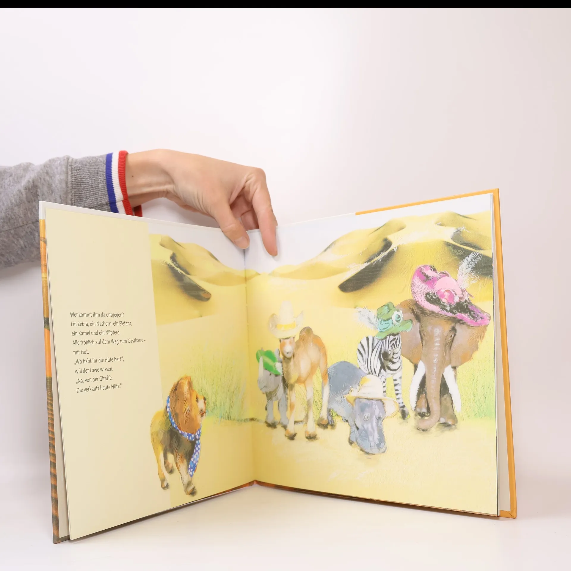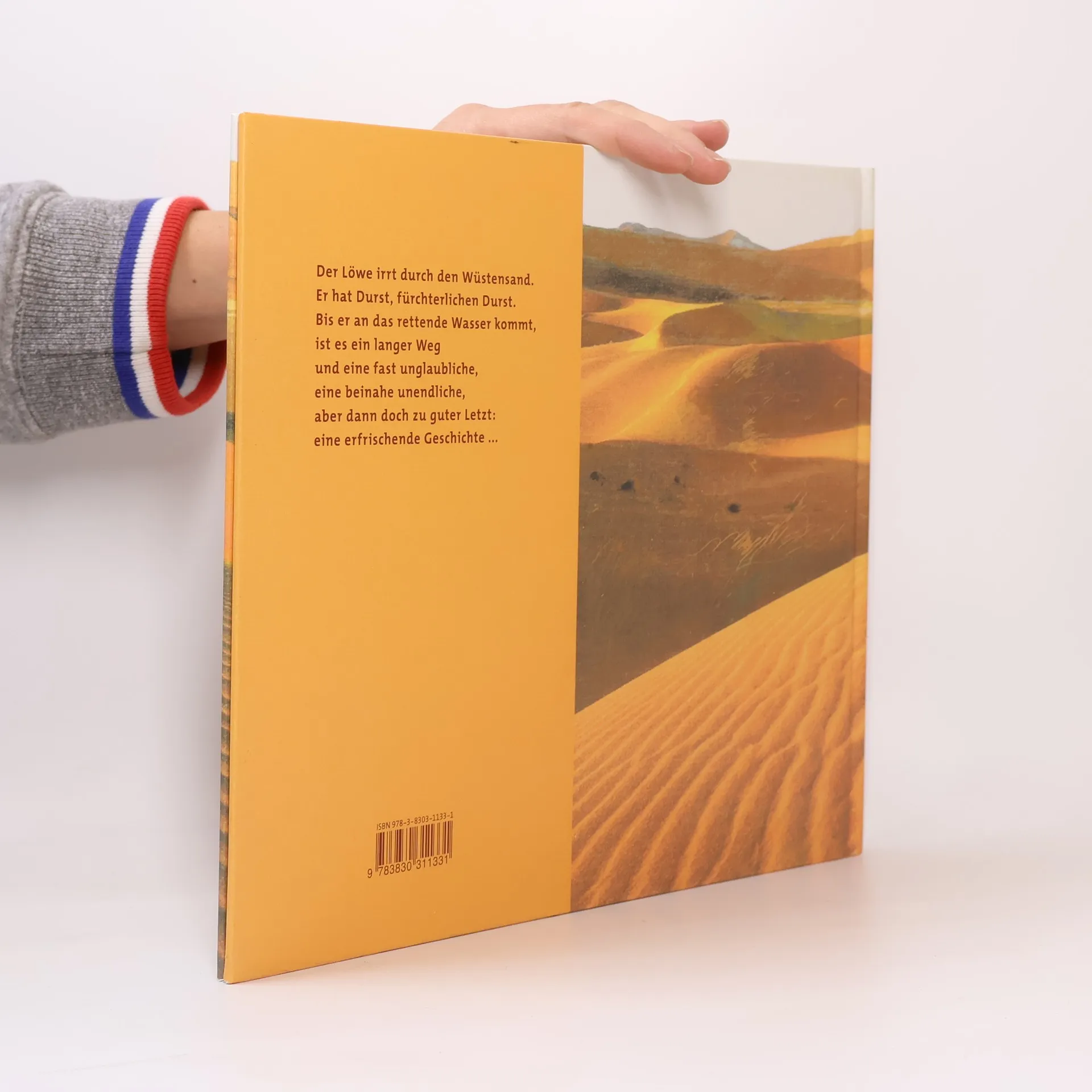 Ein durstiger Löwe irrt durch die Wüste auf der Suche nach Wasser. Die Geschichte ist humorvoll und spannend, mit künstlerischen Illustrationen, die Hinweise auf den Verlauf der Handlung geben. Heike Ellermann erzählt mit einfachen Worten und vermeidet Dopplungen zwischen Bild und Text.