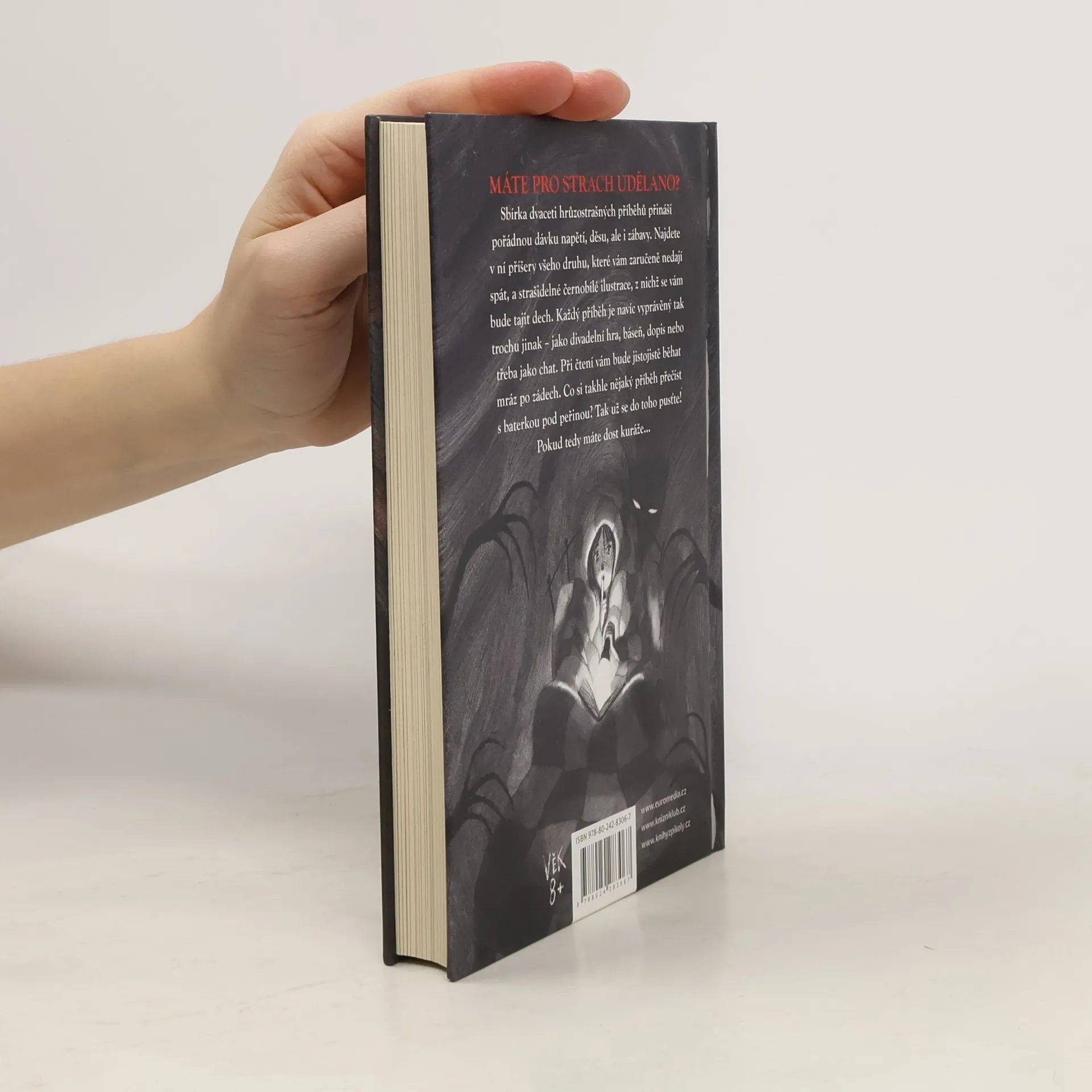 Neradi se nudíte, ale zato se moc rádi bojíte? Pak je pro vás sbírka dvaceti hrůzostrašných příběhů jako dělaná! Přináší totiž pořádnou dávku napětí, děsu, ale i zábavy. Najdete v ní příšery všeho druhu, které vám zaručeně nedají spát, a strašidelné černobílé ilustrace, z nichž se vám bude tajit dech. Každý příběh je navíc vyprávěný tak trochu jinak – formou divadelní hry, básně, dopisů nebo třeba jako chatová konverzace. Při čtení vám bude jistojistě běhat mráz po zádech. Že máte pro strach uděláno? Co si takhle nějaký příběh přečíst s baterkou pod peřinou? Tak už se do toho pusťte, pokud tedy máte dost kuráže…