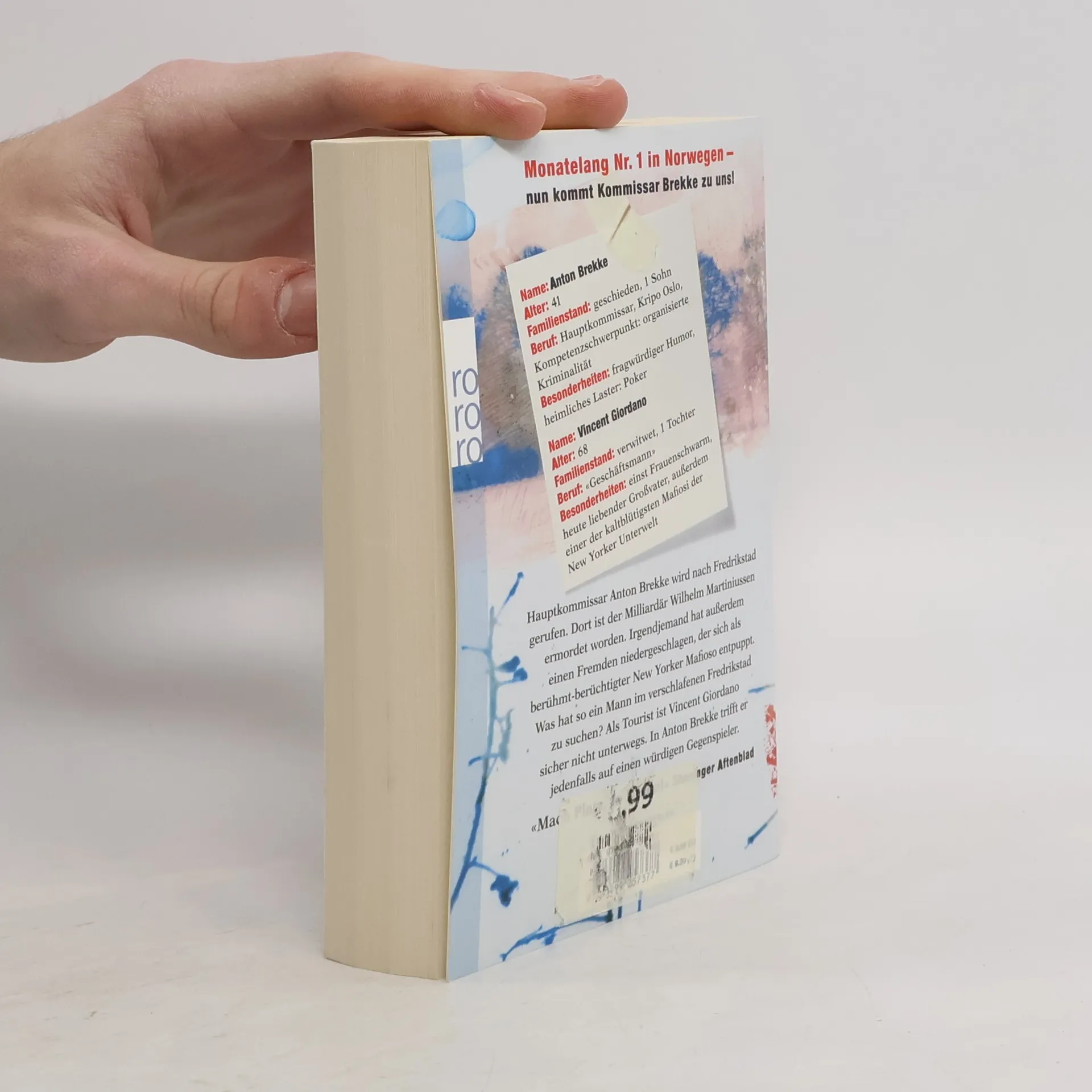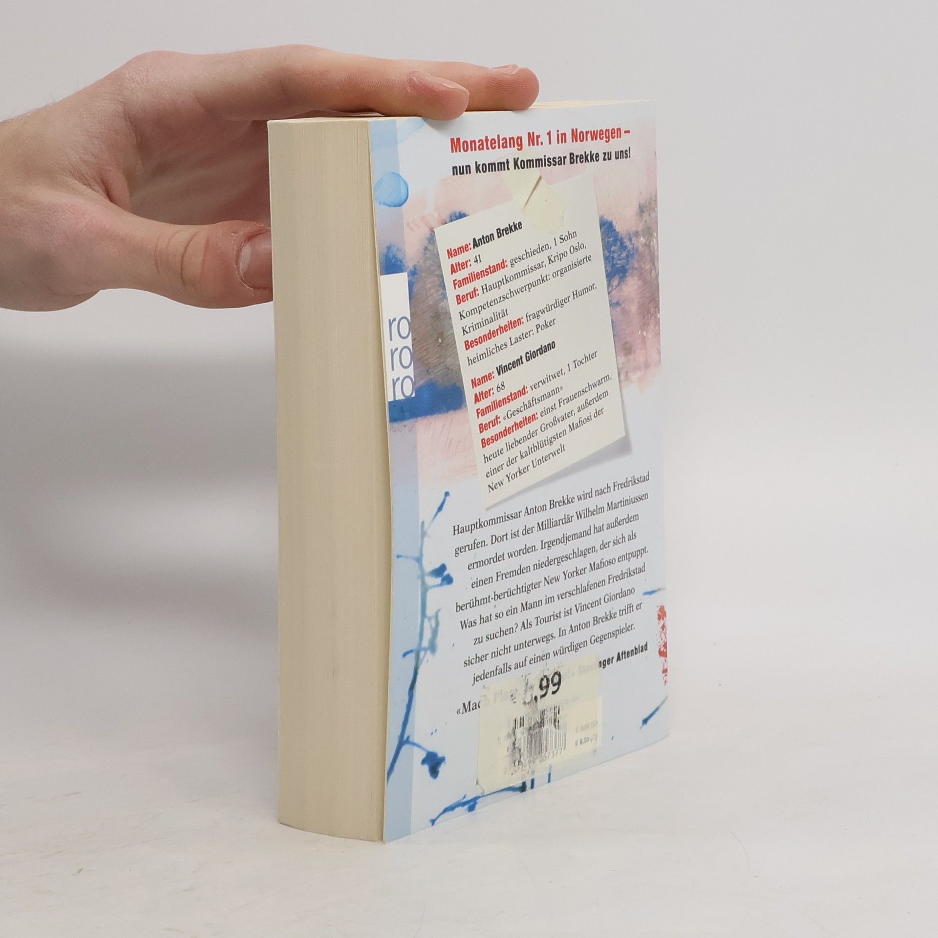 Monatelang Nr. 1 in Norwegen -- nun kommt Kommissar Brekke zu uns! Name: Anton Brekke Alter: 41 Familienstand: geschieden, 1 Sohn Beruf: Hauptkommissar, Kripo Oslo, Kompetenzschwerpunkt: organisierte Kriminalität Besonderheiten: fragwürdiger Humor, heimliches Laster: Poker Name: Vincent Giordano Alter: 68 Familienstand: verwitwet, 1 Tochter Beruf: «Geschäftsmann» Besonderheiten: einst Frauenschwarm, heute liebender Großvater, außerdem einer der kaltblütigsten Mafiosi der New Yorker UnterweltHauptkommissar Anton Brekke wird nach Fredrikstad gerufen. Dort ist der Milliardär Wilhelm Martiniussen ermordet worden. Irgendjemand hat außerdem einen Fremden niedergeschlagen, der sich als berühmt-berüchtigter New Yorker Mafioso entpuppt. Was hat so ein Mann im verschlafenen Fredrikstad zu suchen? Als Tourist ist Vincent Giordano sicher nicht unterwegs. In Anton Brekke trifft er jedenfalls auf einen würdigen Gegenspieler. «Mach Platz, Jo Nesbø!» Stavanger Aftenblad