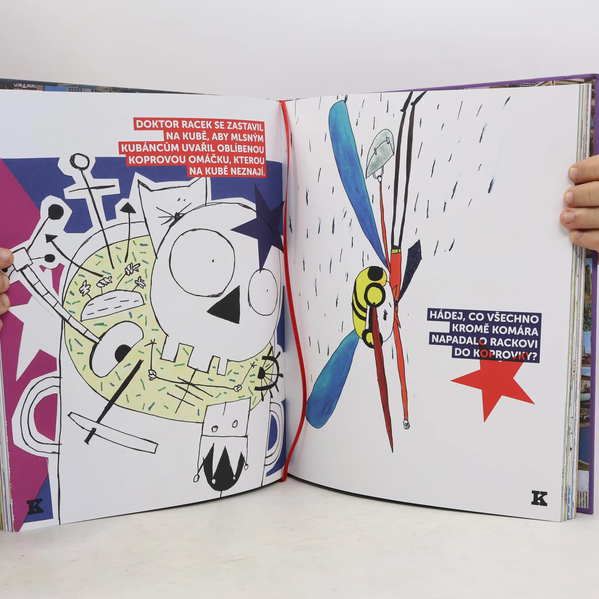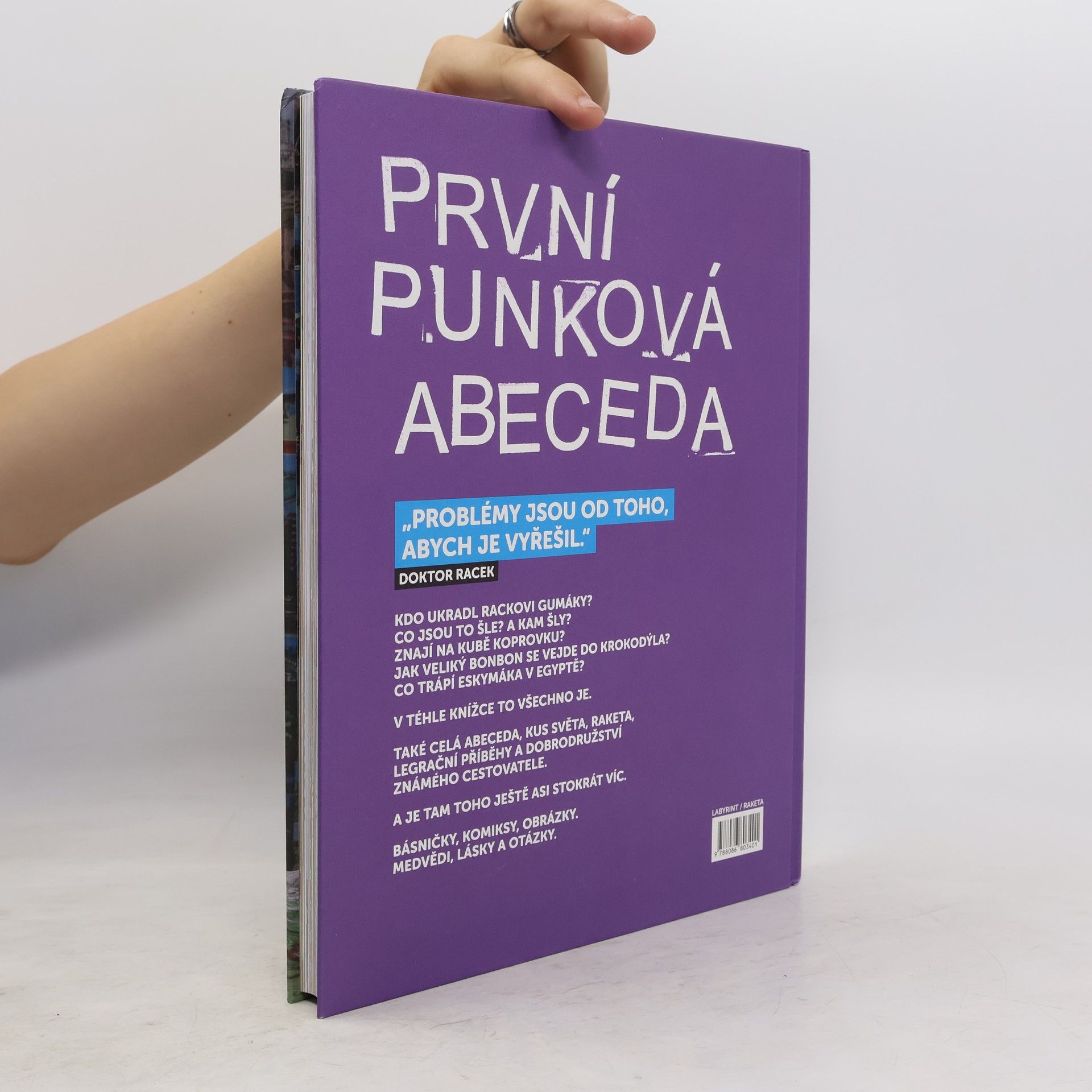 První punková abeceda Doktor Racek sedá do rakety a vydává se na cestu kolem zeměkoule. Navštěvuje různé kouty světa a děti se při tom učí písmena. Kniha jako gejzír nápadů vedle hravé formy obsahuje i vzdělávací prvky. Básničky, komiksy, koláže, krátké pohádky, hry, otázky a úkoly. Pro všechny děti a jejich skvělé rodiče. Nikdo se nebude ani vteřinu nudit! Kdo ukradl Rackovi gumáky? Co jsou šle? A kam šly? Znají na Kubě koprovku? Jak veliký bonbon se vejde do krokodýla? Co trápí Eskymáka v Egyptě? V téhle knížce je všechno – celá abeceda, kus světa, raketa, legrační příběhy a dobrodružství známého cestovatele.