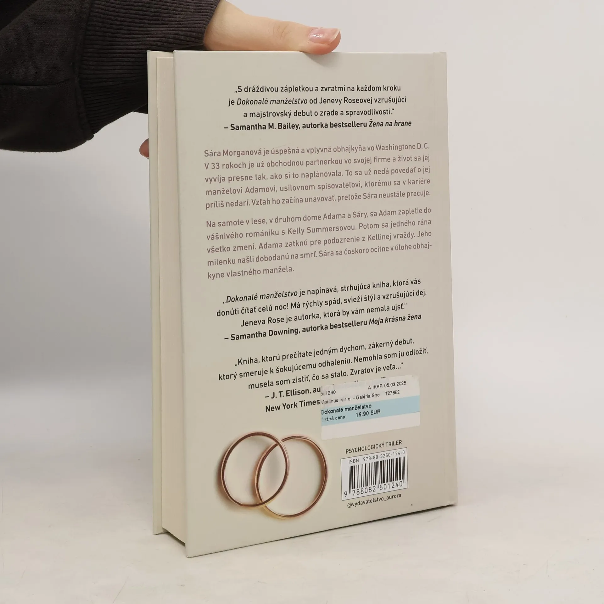 Od autorky bestsellerov podľa New York Times Jenevy Roseovej prichádza do slovenských kníhkupectiev jej prelomový triler „Dokonalé manželstvo“. Tento šokujúci príbeh, ktorý si získal už viac ako dva milióny čitateľov po celom svete, teraz vychádza v kompletne prepracovanom vydaní s exkluzívnou novou kapitolou. Kniha, známa svojím mrazivým a napínavým dejom, oslovila aj producentov, ktorí plánujú jej filmovú adaptáciu. Sára Morganová je úspešná a vplyvná obhajkyňa vo Washingtone D. C. Vo svojich 33 rokoch je už obchodnou partnerkou vo svojej firme a život sa jej vyvíja presne tak, ako si to naplánovala. To sa už nedá povedať o jej manželovi Adamovi, usilovnom spisovateľovi, ktorému sa v kariére príliš nedarí. Vzťah ho začína unavovať, pretože Sára neustále pracuje. Na samote v lese, v druhom dome Adama a Sáry, sa Adam zapletie do vášnivého romániku s Kelly Summersovou. Potom sa jedného rána všetko zmení. Adama zatknú pre podozrenie z Kellinej vraždy. Jeho milenku našli dobodanú na smrť. Sára sa čoskoro ocitne v úlohe obhajkyne vlastného manžela, muža obvineného z vraždy svojej milenky.
