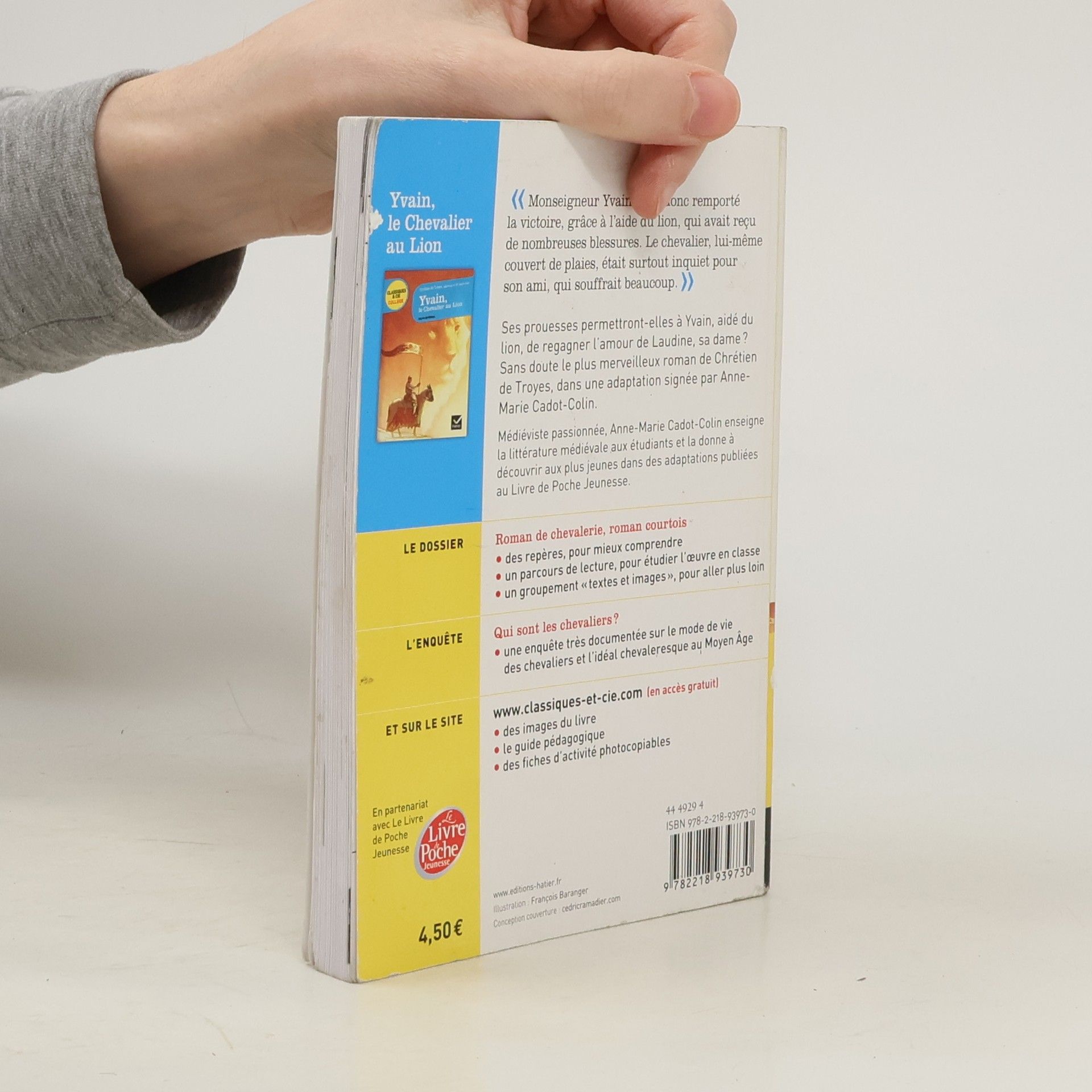 Ses prouesses permettront-elles a Yvain, aide du lion, de regagner l'amour de Laudine, sa dame ? Sans doute le plus merveilleux roman de Chretien de Troyes, dans une adaptation signee d'Anne-Marie Cadot-Colin. L'edititon Classiques & Cie College Soigneusement annote, le texte du roman est associe a un dossier illustre, qui comprend: - un guide de lecture (avec des reperes, un parcours de l'oeuvre et un groupement de documents sur le theme du merveilleux medieval), - une enquete documentaire: Qui sont les chevaliers ?.