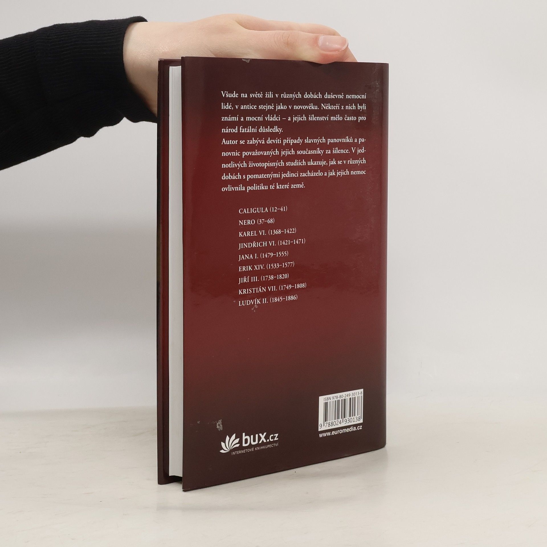 Pomatení panovníci od Caliguly po Ludvíka II. Všude na světě žili v různých dobách duševně nemocní lidé, v antice stejně jako v novověku. Někteří z nich byli známí a mocní vládci – a jejich šílenství mělo často pro národ fatální důsledky. Autor se zabývá devíti případy slavných panovníků a panovnic považovaných jejich současníky za šílence. V jednotlivých životopisných studiích ukazuje, jak se v různých dobách s pomatenými jedinci zacházelo a jak jejich nemoc ovlivnila politiku té které země.