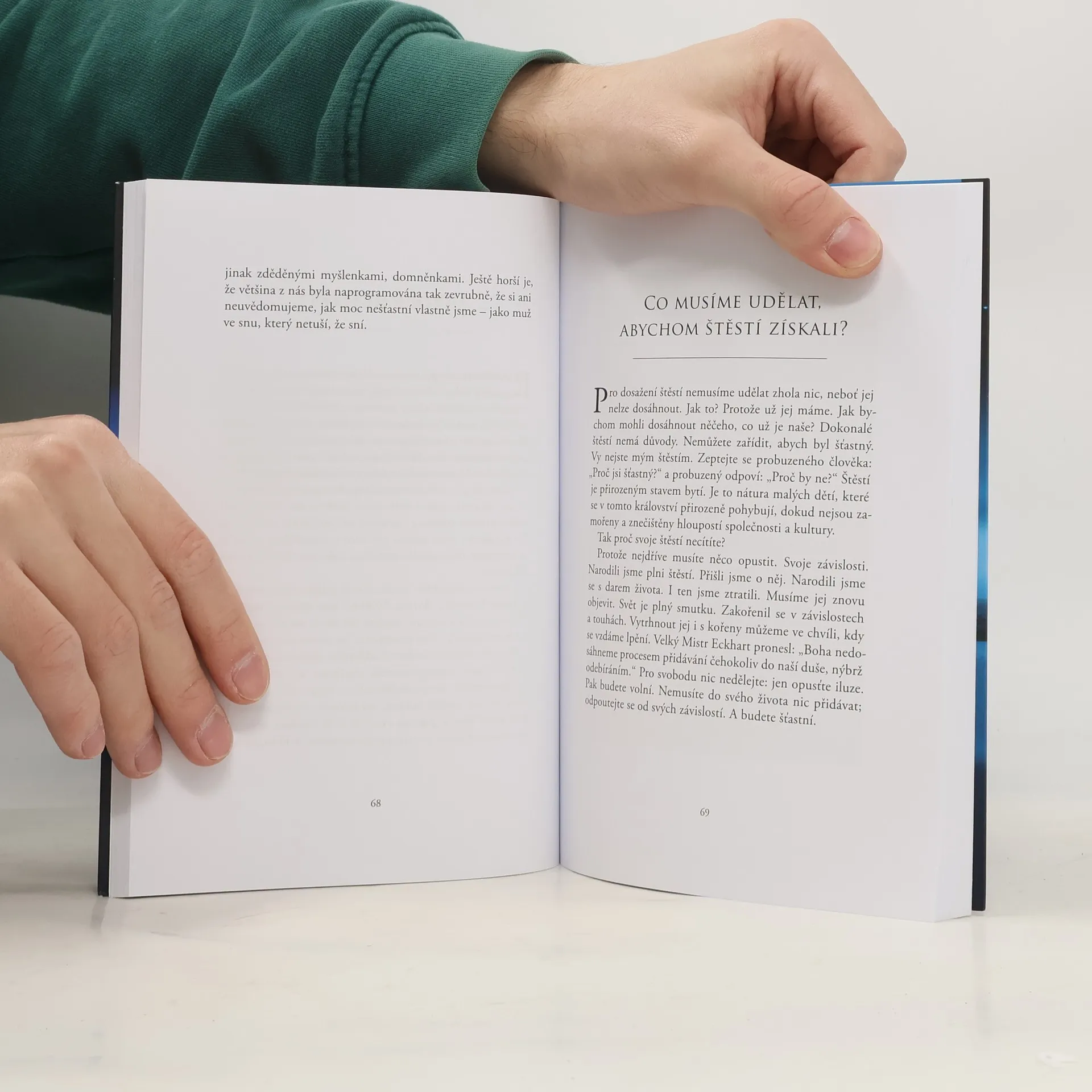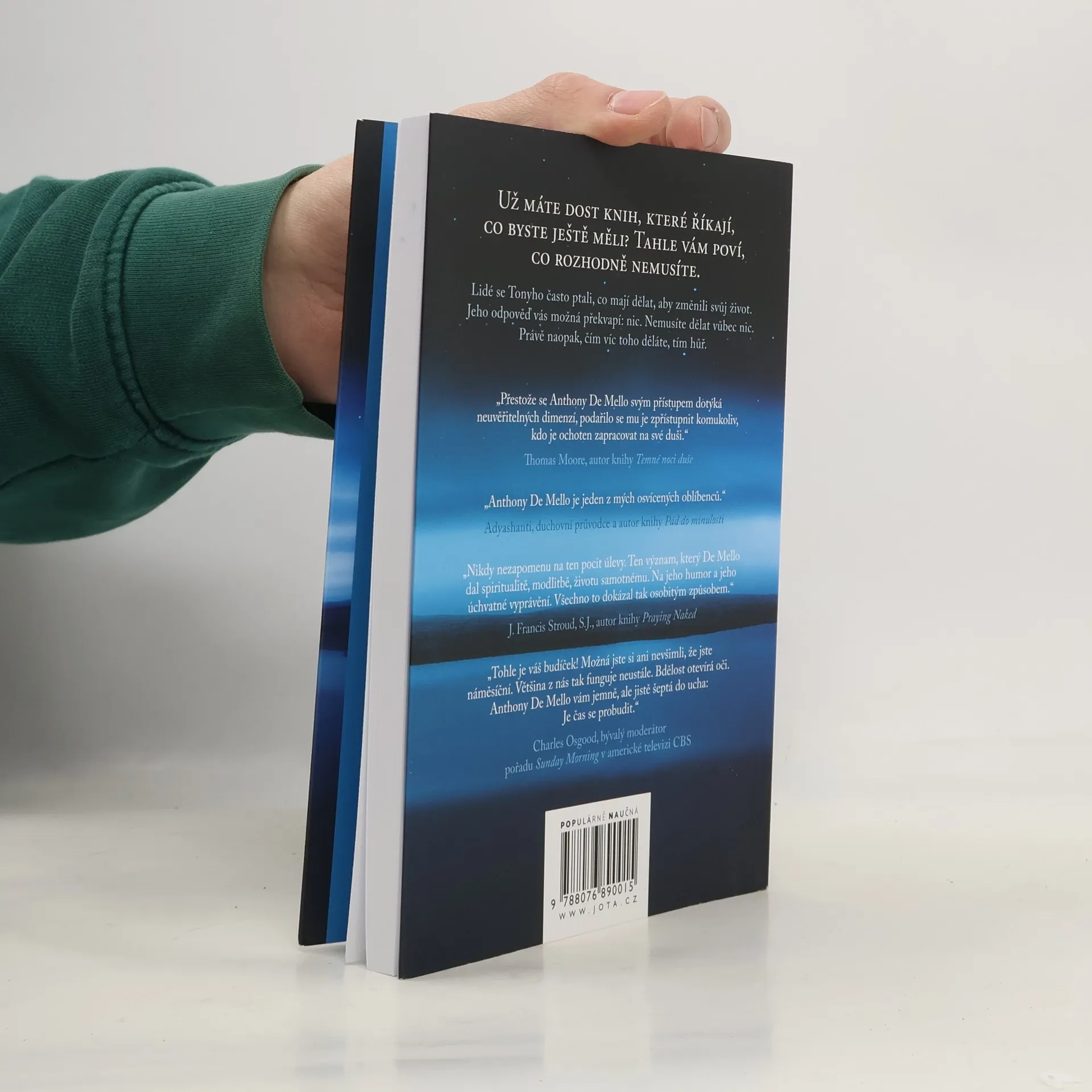 Co mám udělat proto, abych se změnil?, ptali se lidé Tonyho De Melly. Jeho odpověď vás možná překvapí: nic. Nemusíte udělat vůbec nic. Právě naopak, říká Tony, čím víc toho děláte, tím hůř. Jste v pořádku takoví, jací jste. Nezasahujte do sebe. Nic neměňte. Jen se dívejte. Pozorujte. Věci, které se v sobě snažíte změnit, ve skutečnosti potřebují jenom vaše pochopení. Když jej dostanou, promění se samy. A v té chvíli objevíte tu jedinou věc, na které se shodují všichni svatí i mystici: vše je přesně tak, jak má být.