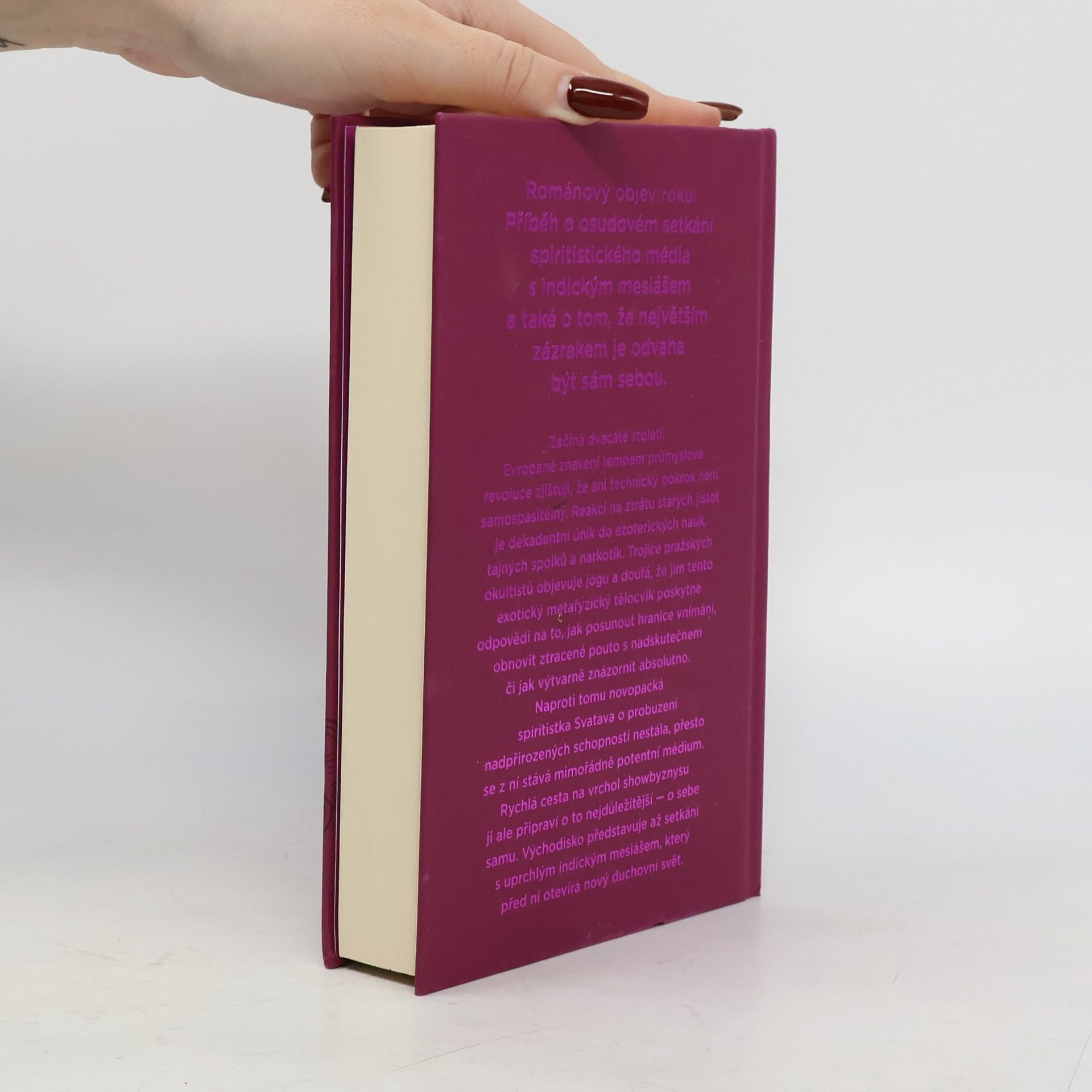 Svatí a kouzelníci v předválečné Praze Začíná dvacáté století. Evropané znavení tempem průmyslové revoluce zjišťují, že ani technický pokrok není samospásný. Reakcí na ztrátu starých jistot je dekadentní únik do ezoterických nauk, tajných spolků a narkotik. Trojice pražských okultistů objevuje jógu a doufá, že jim tento exotický metafyzický tělocvik poskytne odpovědi na to, jak posunout hranice vnímání, obnovit ztracené pouto s nadskutečnem či jak výtvarně znázornit absolutno. Naproti tomu novopacká spiritistka Svatava o probuzení nadpřirozených sil nestála, přesto se z ní stává mimořádně potentní médium. Rychlá cesta na vrchol showbyznysu ji ale připraví o to nejdůležitější — o sebe samu. Východisko přináší až setkání s uprchlým indickým mesiášem, který před ní otevírá nový duchovní svět. Text Jolanty Trojak vychází z žánru okultistického románu, zdaleka však u něj nezůstává. Květnatý sloh střídá nadčasový rytmický text zkoumající otázky základního lidského údělu a naplnění vlastního potenciálu.