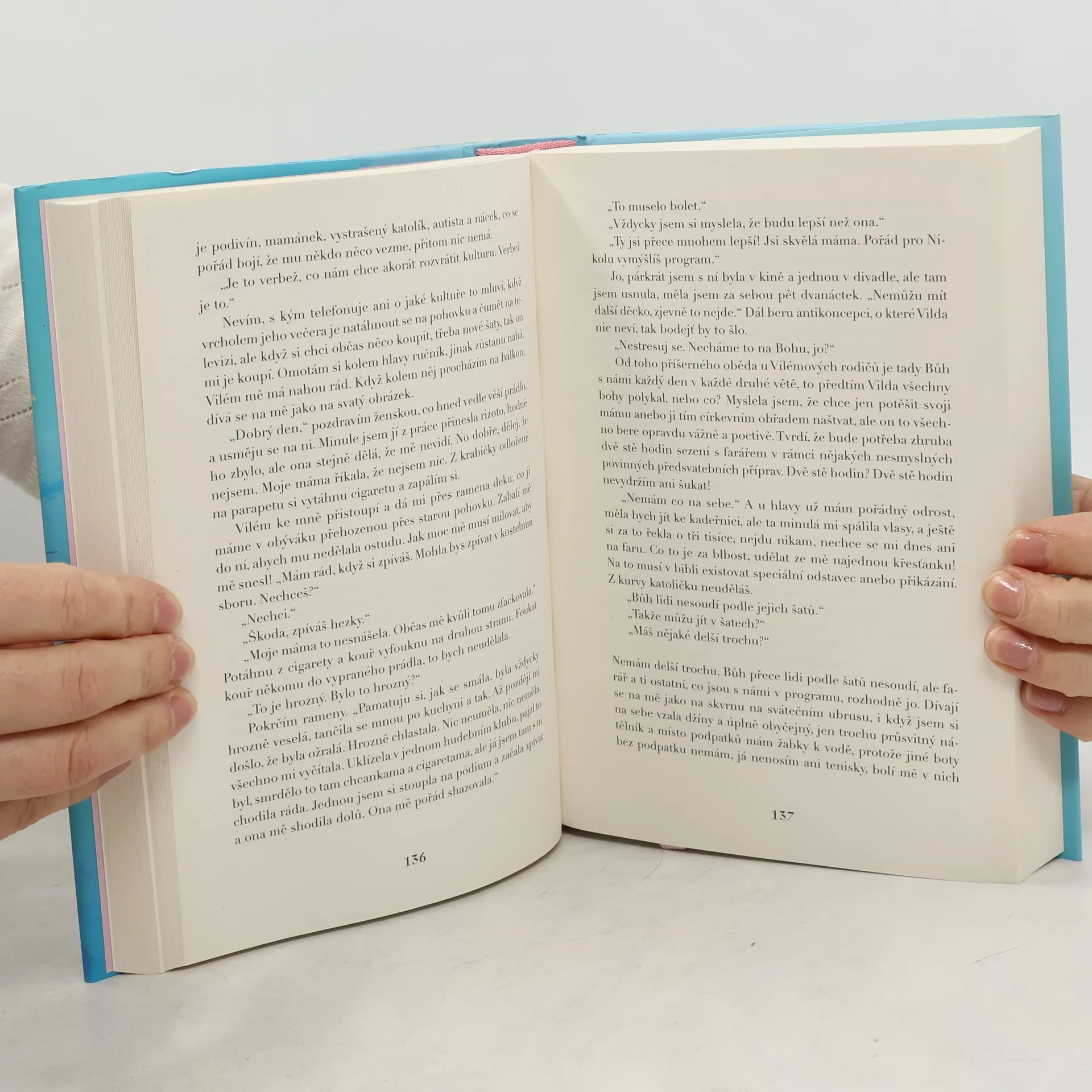 Rebeka a Karolína, těžko říct, čí je to vina. Dvě řadovky, sněhuláci, Bohnice, kolo a nezpevněná krajnice, ze které sjedeš nebo do tebe vrazí vlak, měsíce v kómatu, slzy a Milana, co potřebuje mámu, a Nikola má dvě, v termosce na čaj víno, proutěné košíky, svatby, pohřby a vraždy, Linda tvrdí, že tady něco smrdí, a Saša je v cele, to ještě není celé, ještě Magda, slinivka, provaz a kameny pro toho, kdo by byl zraněný, bolest i naděje, že se to skutečně neděje, že život je jenom demo, ze šlapky jeptiška, banány, pašeráci a obětavá Bety, rozdílné světy, co spolu skončí u poslední věty. Všeho je moc a všechno je krát. Před Bohem za Bohem nikdo nesmí stát, jinak nebudu hrát. A co ten batoh?