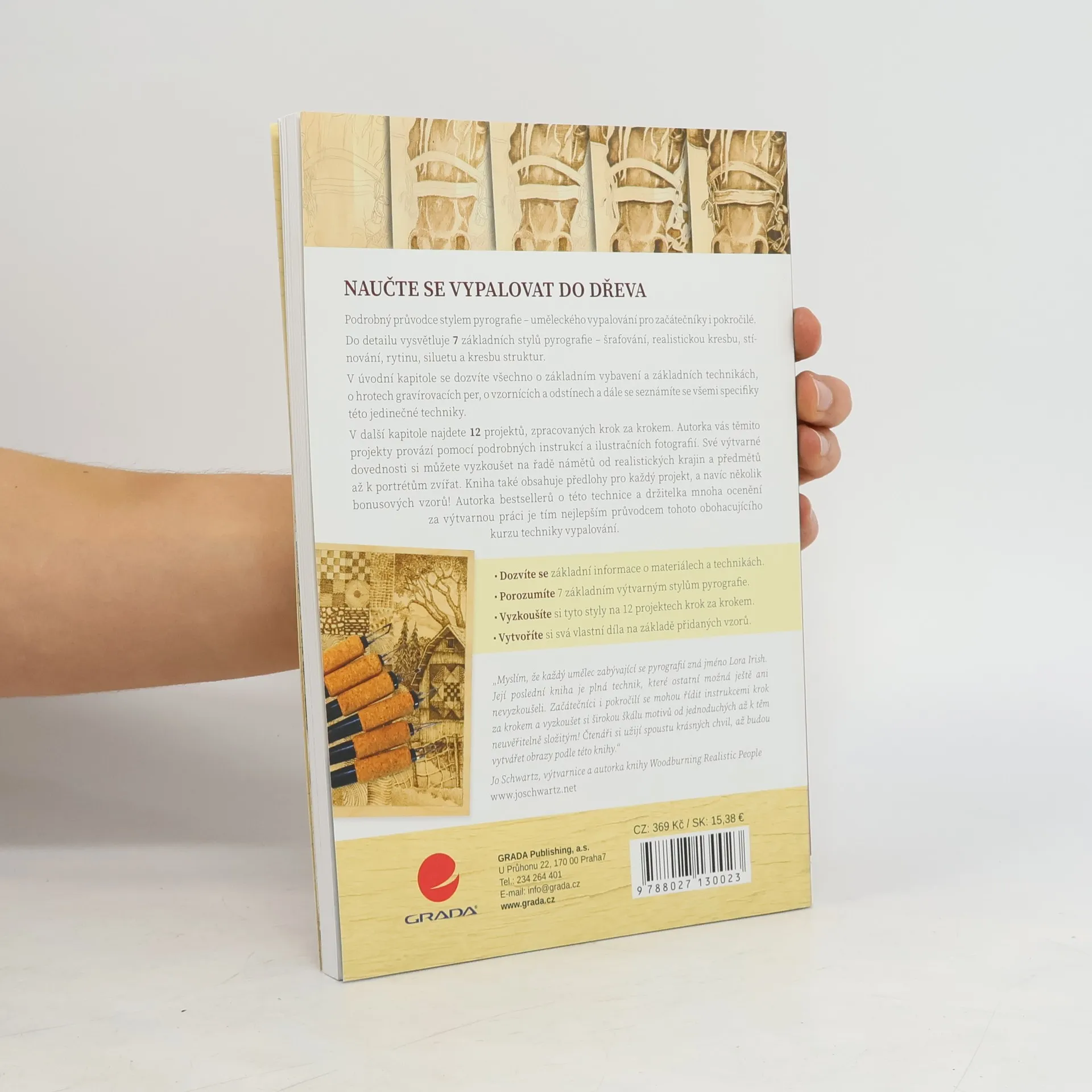 Máte-li rádi práci se dřevem, rozšiřte si své umělecké dovednosti i o kreativní techniku vypalování elektrickým perem nebo pájkou do dřeva. Komplexní průvodce od zkušené autorky poskytne potřebné pokyny pro všechny základní styly tohoto oboru. Kresbu siluet, grafírování, šrafování, tečkování, jiné textury, plošné stínování až po iluzi malby. V úvodní galerii je popsáno a vysvětleno celkem 31 využitelných základních vzorů, s nimiž pak snadno vytvoříte realistické portréty lidí a zvířat, motivy květin, krajiny, architektury a dalších objektů. Inspirovat se můžete i 12 projekty s detailními postupy a fotografiemi každého kroku.