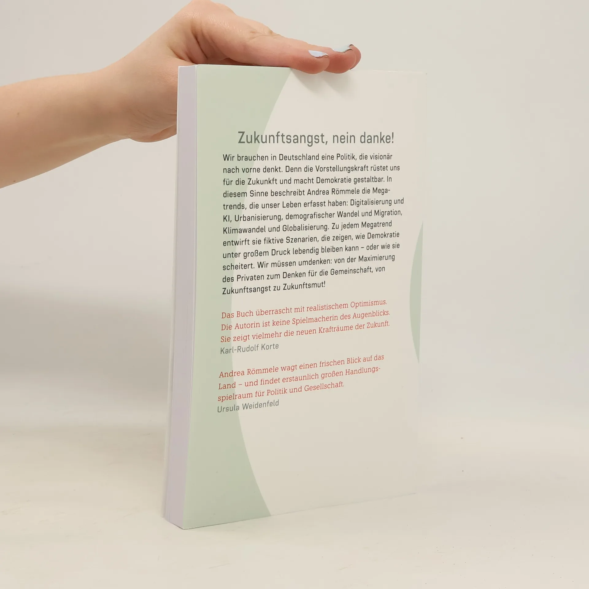 Andrea Römmele analysiert in ihrem Buch die Megatrends und Konfliktlinien, die unsere Gesellschaft prägen, wie Digitalisierung und Klimawandel. Sie entwirft fiktive Szenarien, die zeigen, wie Demokratie in Zeiten großer Veränderungen lebendig bleiben oder scheitern kann, und plädiert für ein Umdenken hin zu kollektivem Handeln und Zukunftsmut.